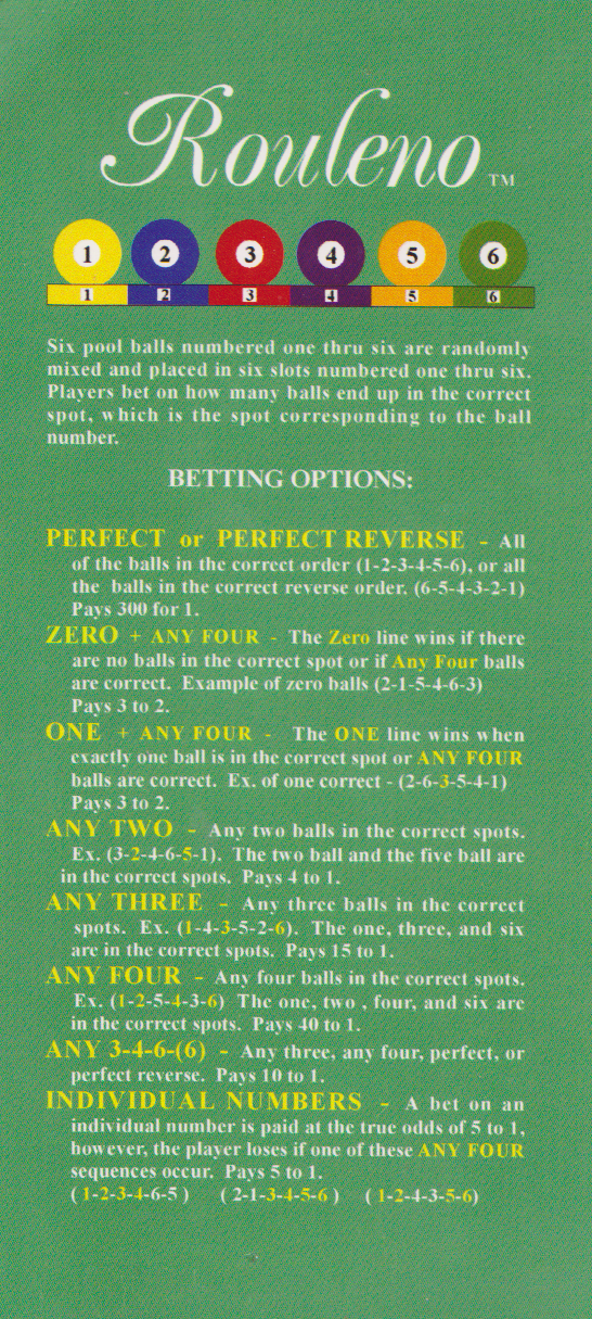 我第一次見到 Roulino 是在 2016 年 10 月 20 日,地點是拉斯維加斯的 Max 賭場。它的名字和玩法是輪盤賭和基諾的混合體。遊戲規則是抽取六個撞球,每個撞球的編號從 1 到 6,然後計算每個撞球的號碼與抽取順序相符的次數。