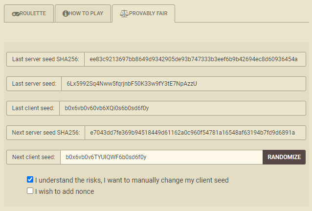 是否添加 Nonce 完全由您決定,Nonce 是自動添加到客戶端種子末尾的額外字元。我認為,如果賭場有意作弊,添加 Nonce 並不能提供任何保護。