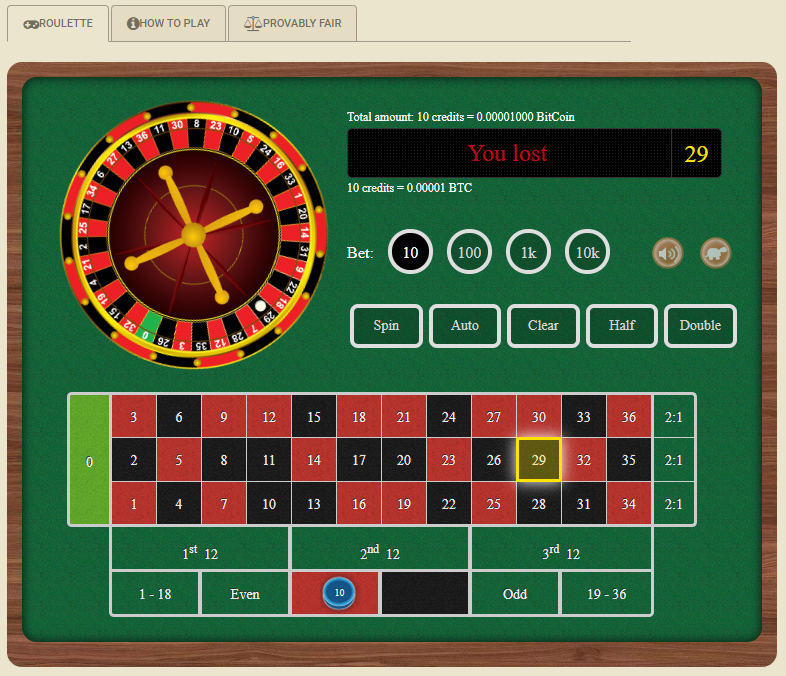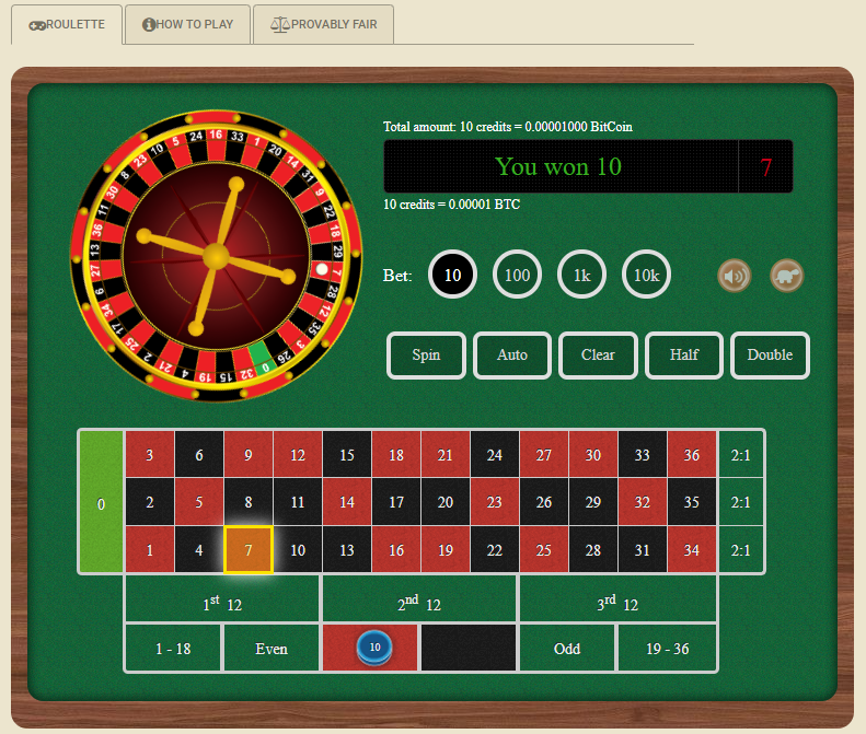 在 Crypto.Games 的遊戲中,輪盤賭採用單零輪盤,這在線上賭場中很常見。每次投注的莊家優勢為 1/37 = 2.70%。公平遊戲