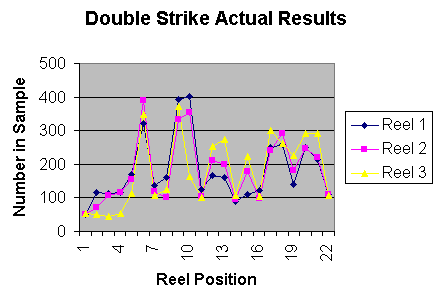 2000年10月28日至11月1日期間,我在裡諾銀遺產賭場(Silver Legacy)的一台25美分的Double Strike老虎機上玩了3976次,記錄了3976次。這台老虎機是IGT製造的平頂老虎機,銀遺產賭場的機器編號是4533。以下是該機器的賠率表。有些符號標有“double”字樣,在這種情況下,總獎金翻倍,但三個紅色的雙七除外。