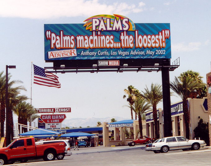 上面的標誌就在棕櫚酒店對面。雖然我做了安東尼·柯蒂斯在《拉斯維加斯顧問》雜誌上發表的研究,但它得以廣為人知。標牌上的「…」包含了相當多的信息,但這些信息被故意省略了。實際上,這項研究只是說棕櫚酒店的視訊老虎機在拉斯維加斯接受調查的賭場中最低。底部的小字寫著:“獨立研究於2001年11月至2002年2月進行,研究對像是《王牌大賤諜》、《幸運餅乾》、《捲軸遊戲》和《命運之輪》遊戲。他們省略了《豹斑》,研究從10月份開始。”