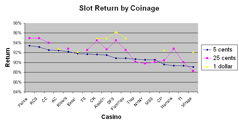 許多讀者讀過我的附錄 3A ,並詢問了更高面值的硬幣。由於樣本數不足,直到 2002 年 5 月,我一直不願意發表我的研究結果。不過,我被問過很多次,所以我會把我得到的結果分享給大家。首先,我的重點仍然是五分硬幣老虎機。我測試的絕大多數影片顯示老虎機都是五分硬幣遊戲。記住,你一次可以玩大約 100 個硬幣,或每次旋轉最多 5 美元。所以,除非玩家的資金非常充裕,否則沒有必要下注超過這個金額。截至撰寫本文時,我只在 16 家拉斯維加斯賭場看到了 25 美分硬幣影片顯示老虎機,在 8 家賭場看到了 1 美元老虎機。即使是那些有 25 美分硬幣影片顯示老虎機的賭場,選擇也不多。