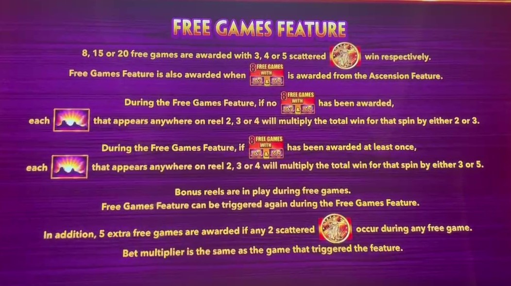 - 在免費旋轉中,日出符號除了作為百搭符號外,還應附帶2倍或3倍乘數,用於該旋轉的所有獎金。但如果玩家使用3至5枚金幣再次觸發獎勵,則所有剩餘旋轉的百搭乘數將為3倍或5倍。