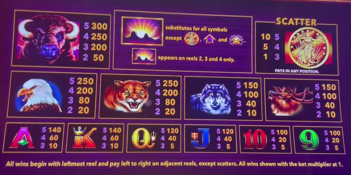 - 線支付符號包括水牛、鷹、美洲獅、狼、雨鹿、A、K、Q、J、10 和 9。