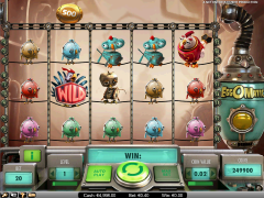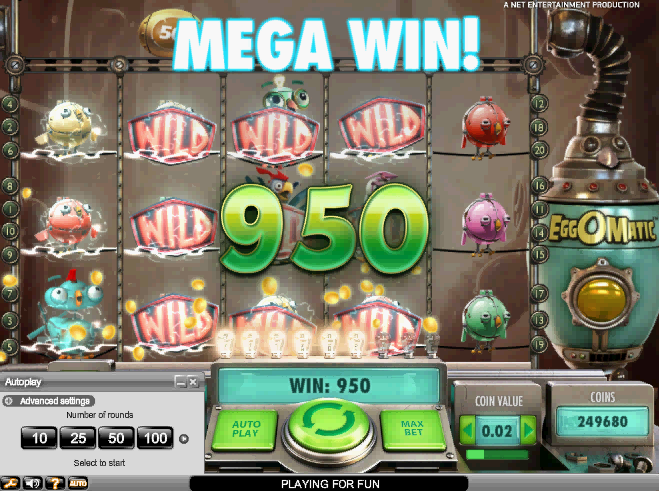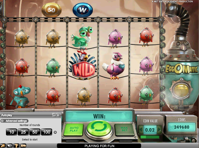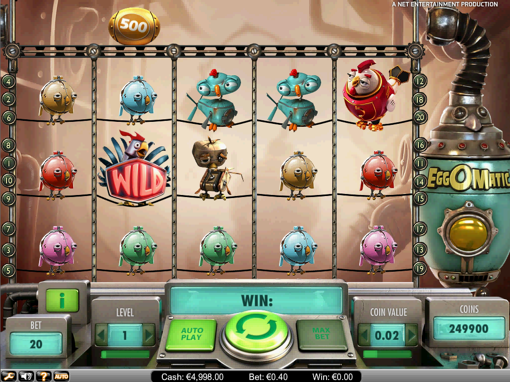 EggOMatic 以下金蛋的機械雞為主題。其蒸氣龐克風格設計精美絕倫。設計亮點在於捲軸上方的傳送帶,它會隨機傳送獎品雞蛋。如果雞蛋正下方出現百搭符號,它會掉落打開,並顯示積分(50 到 2500)、免費旋轉獎勵或向四周擴展百搭符號。