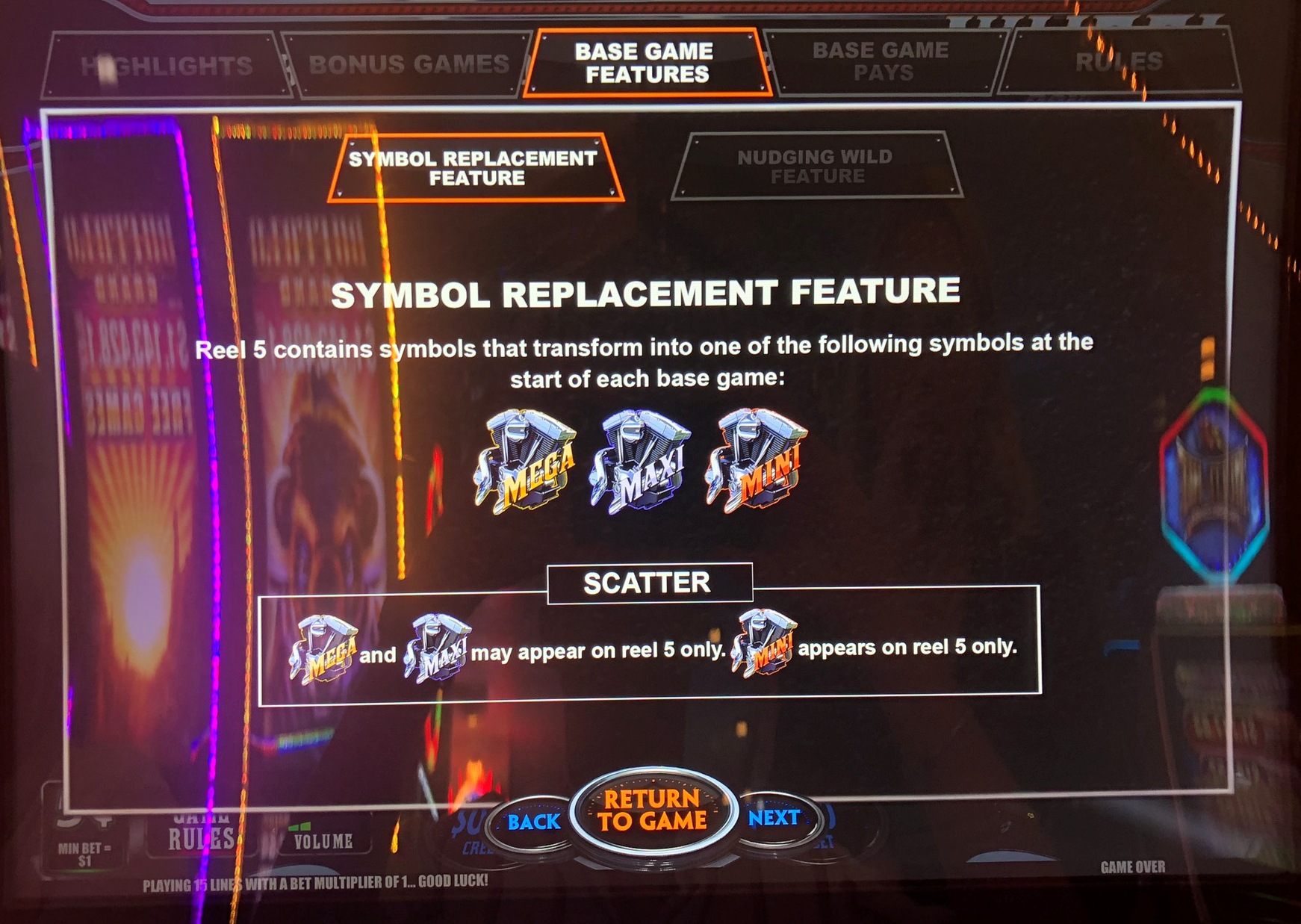 轉軸1和3上是分散符號。轉軸5上是獎勵符號。遊戲設有「符號替換」功能,特殊符號(例如百搭符號、分散符號和獎勵符號)會隨機替換其他線支付符號。玩家投注越多,出現的分散符號和獎勵符號就越多。