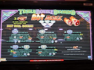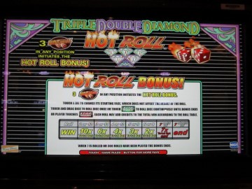 Hot Roll 是製造商IGT添加到各種 3 捲軸老虎機中的獎勵功能。在本分析中,它是基於經典遊戲 Triple Double Diamond。如果玩家在三個捲軸上都獲得 Hot Roll 圖標,則可以玩一款基於擲骰子的獎勵遊戲。在該遊戲中,玩家將持續投擲兩顆骰子並贏錢,直到擲出 7 點,獎勵結束。