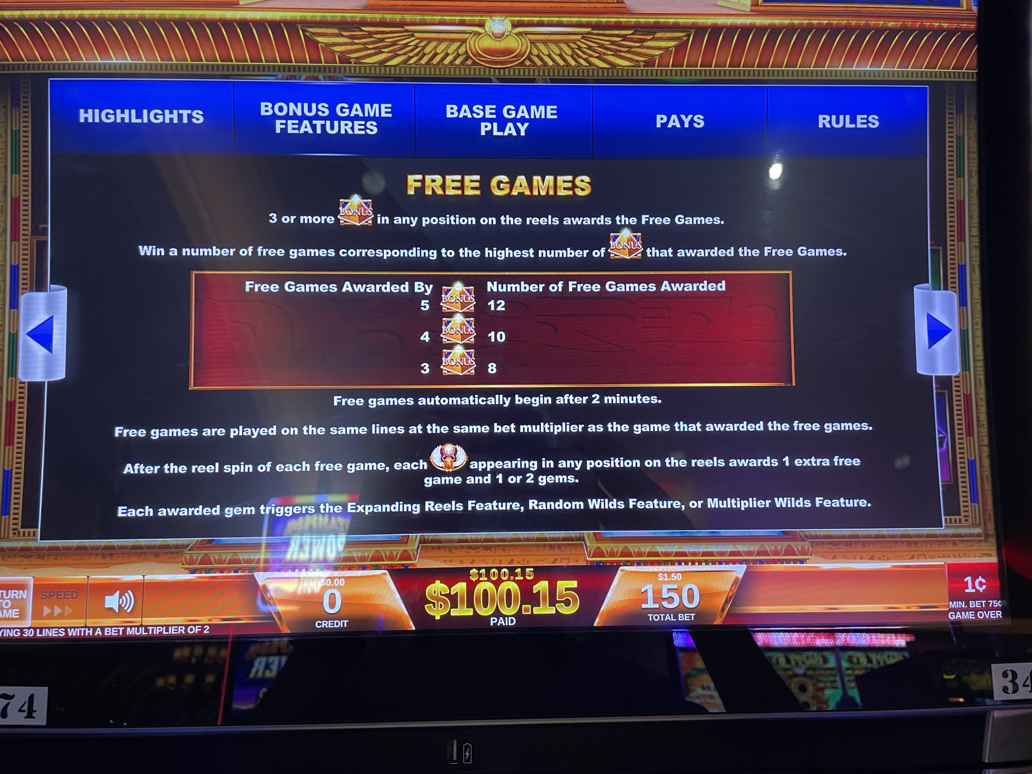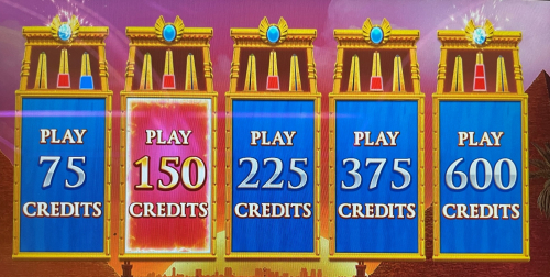 - 每次下注需要 75、150、225、375 或 600 點。我見過的所有遊戲,每個積分價值 0.01 美元。因此,下注金額可以是 0.75 美元、1.50 美元、2.25 美元、3.75 美元或 6.00 美元。所有下注等級的遊戲玩法相同。獎金與下注金額成正比。例如,如果玩家下注 6.00 美元,那麼同樣的獎金將是下注 0.75 美元玩家的 8 倍。
