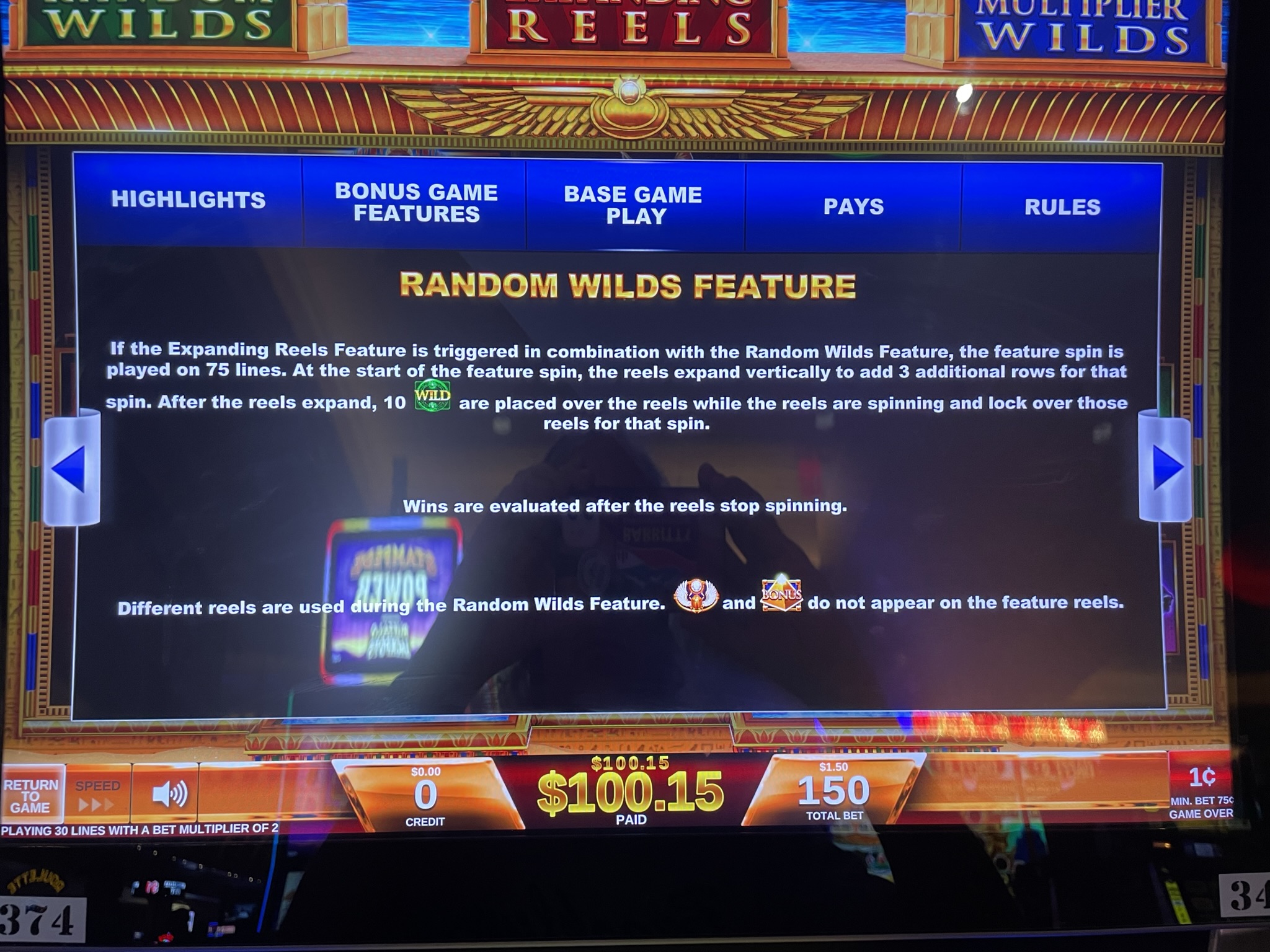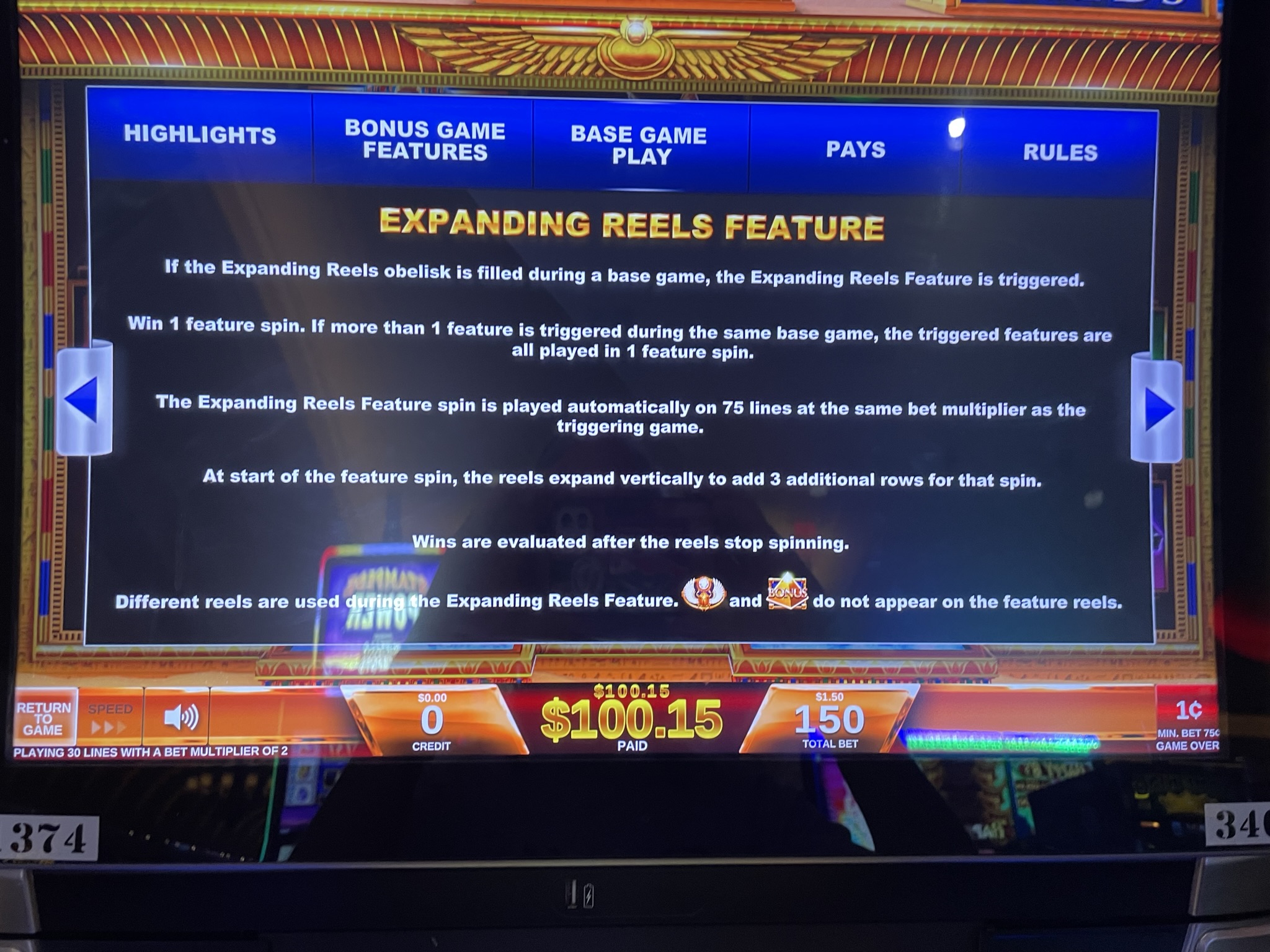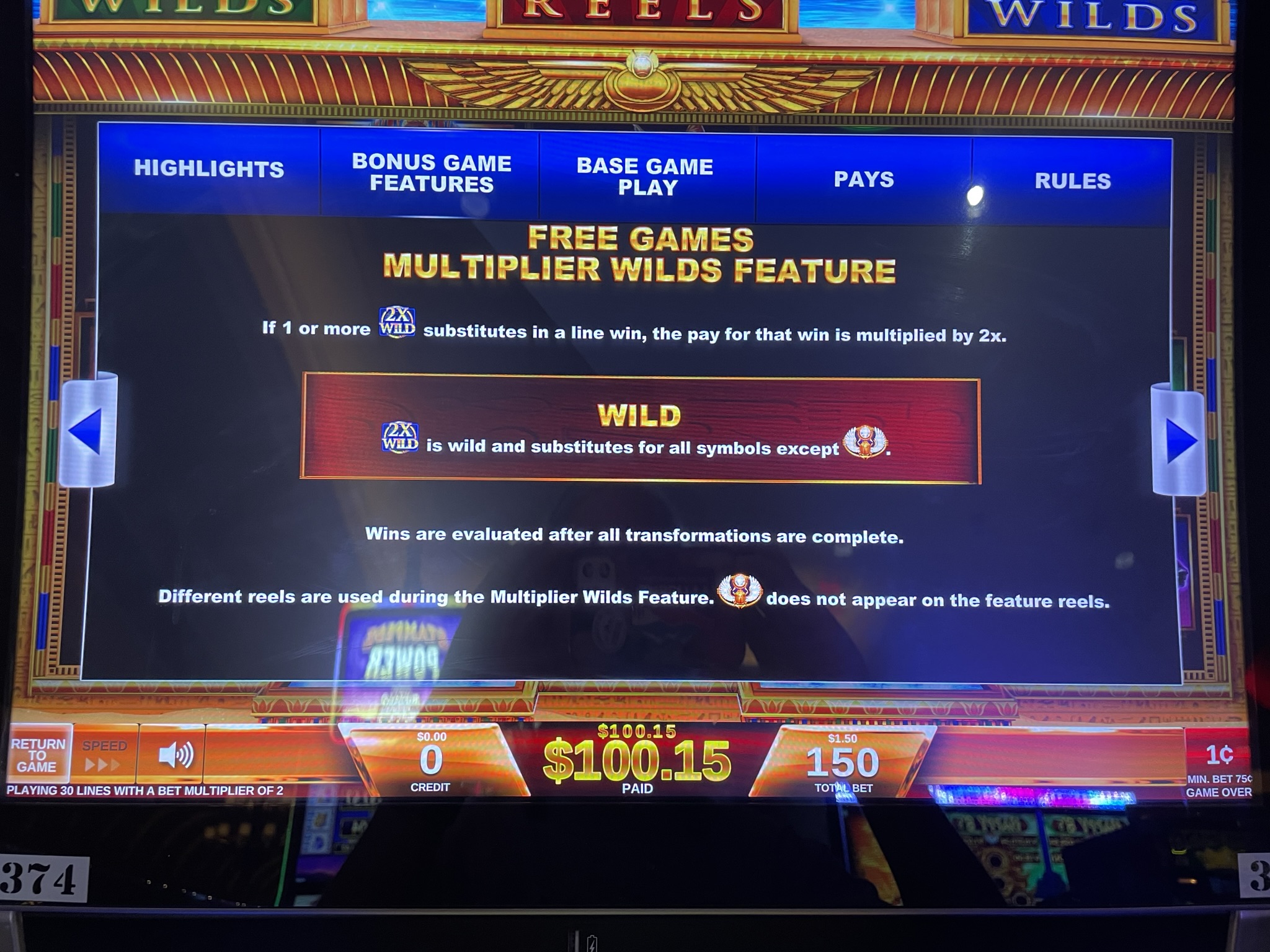 在下面的例子中,你可以看到我自然獲得的百搭符號上出現了2倍的賠付。最終贏了27.50美元。根據我在初始旋轉中下注的0.75美元計算,這相當於我投注金額的36.7倍。