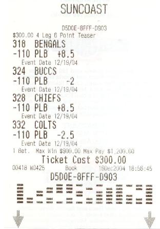 如果我全部涵蓋這四個讓分盤,我的賠率應該是1賠3。自從我下了那個賭注之後,過關盤的賠率就下降了。例如,現在陽光海岸隊4隊6分過關盤的賠率只有2賠5。上面那個過關盤的結果是我贏了兩場,輸了兩場,所以這個賭注輸了。