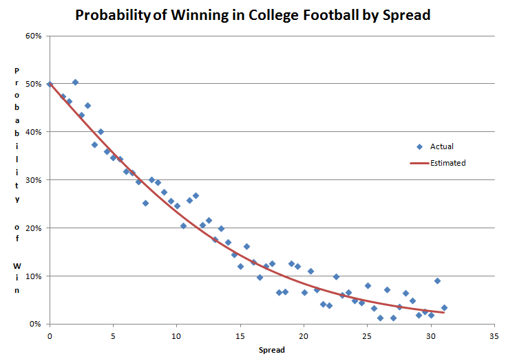 我很少在輸贏盤上找到我認為不錯的投注,押注弱隊。下圖顯示了基於歷史資料(1983年至2005年)按讓分計算的獲勝機率。