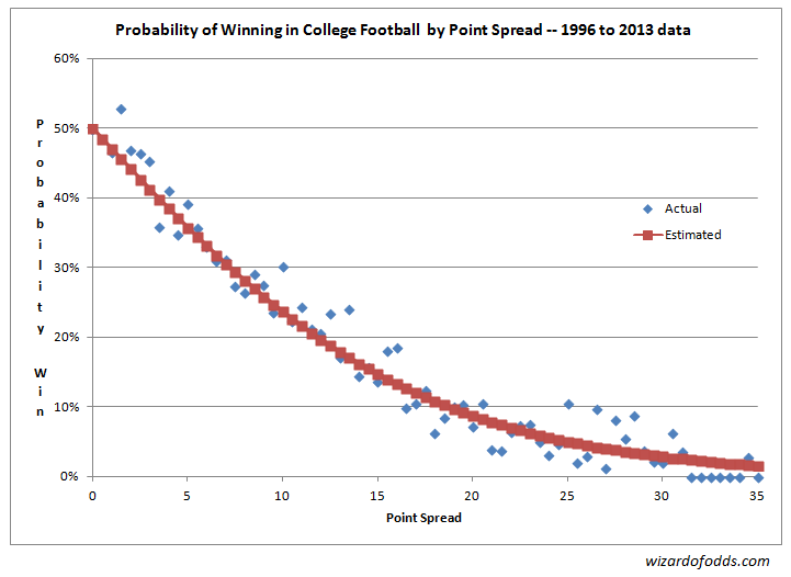 我還應該指出,我的數據中只有1780場比賽的點差在黃牌過關盤區間內。我給的黃牌過關盤獲勝機率為71.57%,這個數字應該算比較粗略,標準差為1.70%。其他研究讓我相信,黃牌過關盤在任何一局中獲勝的機率更接近68.9%。