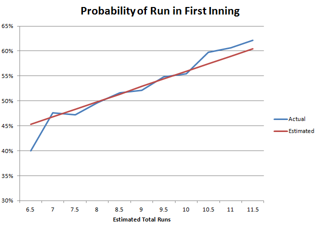 圖表如下。藍線顯示的是第一局實際得分的比賽佔預計總得分的百分比,範圍從 6.5 到 11.5。紅線被稱為「最小二乘」回歸線,它透過顯示比賽總得分與第一局得分機率最匹配的直線來平滑波動。該直線的方程式為p=0.2554 + 0.0304×t ,其中 p = 第一局得分機率,t = 預計總分。