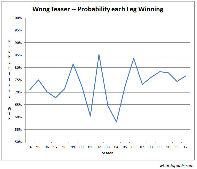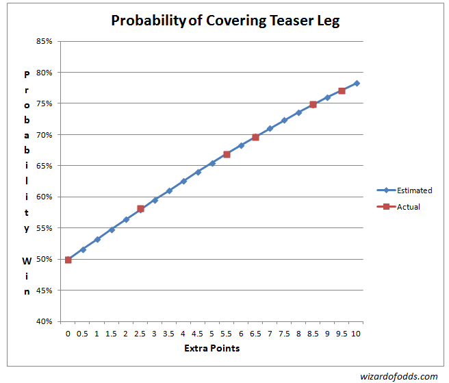 本頁的分析是基於1994年至2012年賽季的4450場NFL比賽。我從1994年開始分析,因為那一年引入了兩分轉換規則。除了樣本量差異之外,我還必須假設讓分盤口卡的讓分是如何產生的。為了節省時間,我沒有分析所有12種已知的過關卡,而是分析了其中5種。為了理解額外積分如何影響中獎機率,我創建了我的「巫師讓分盤口方程式」 。
