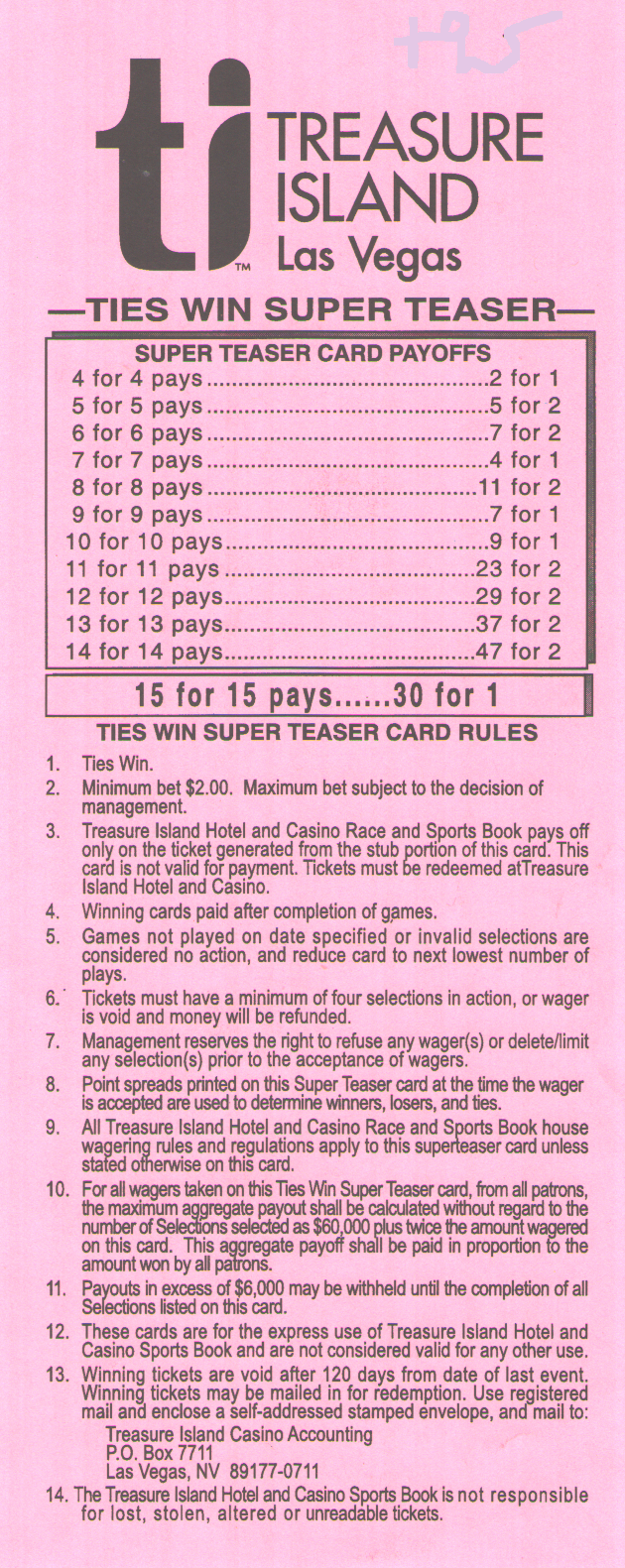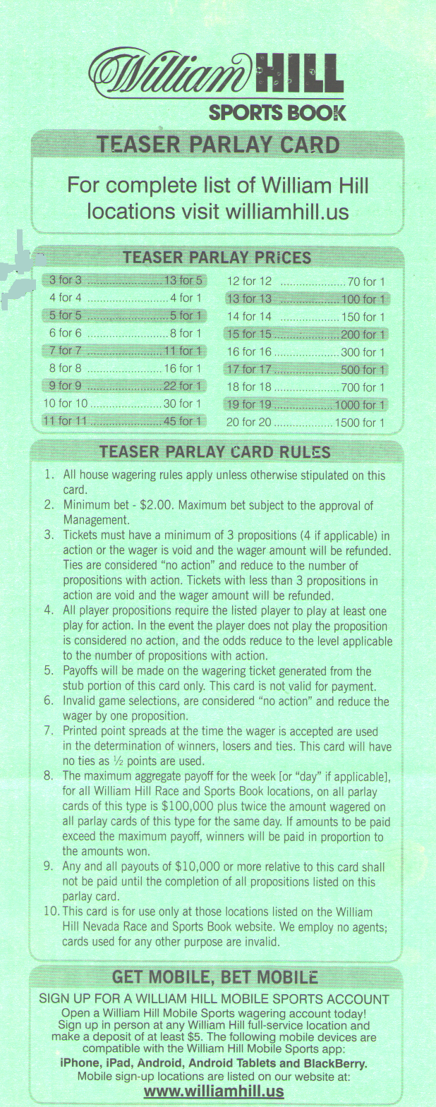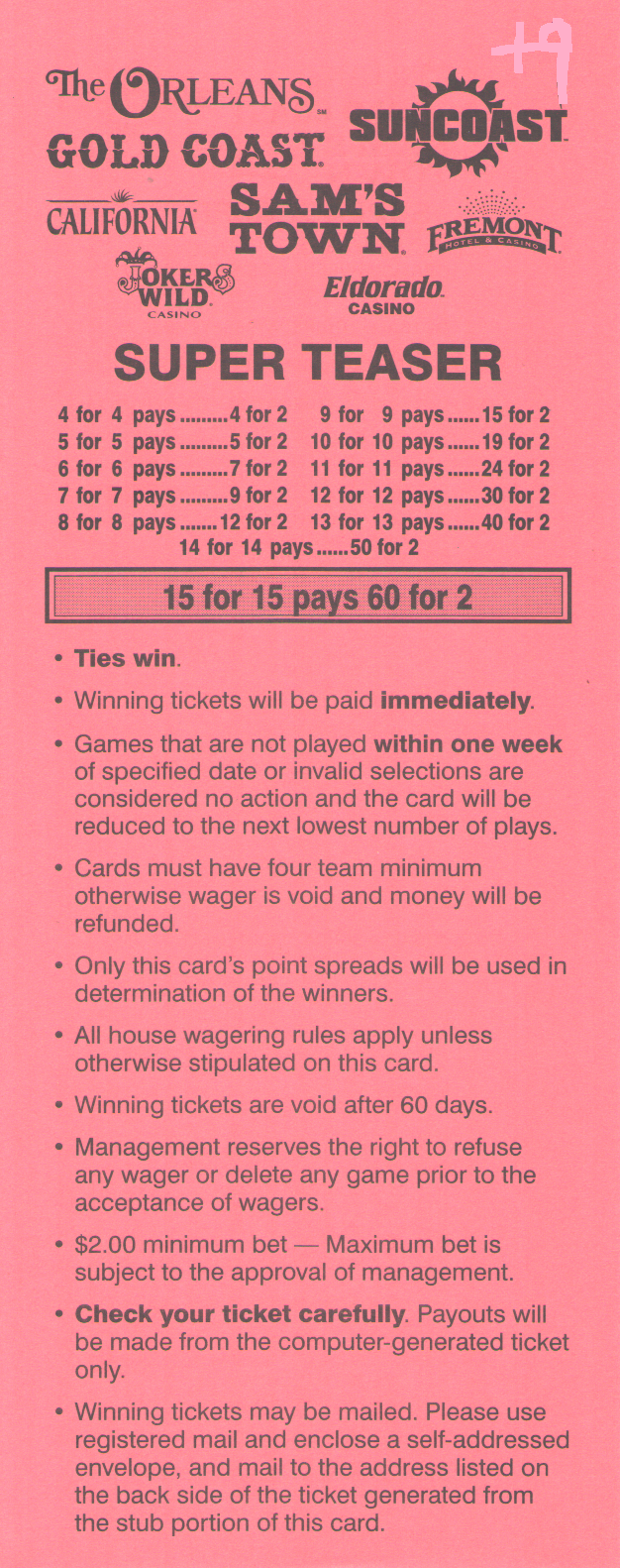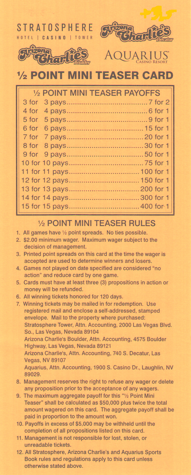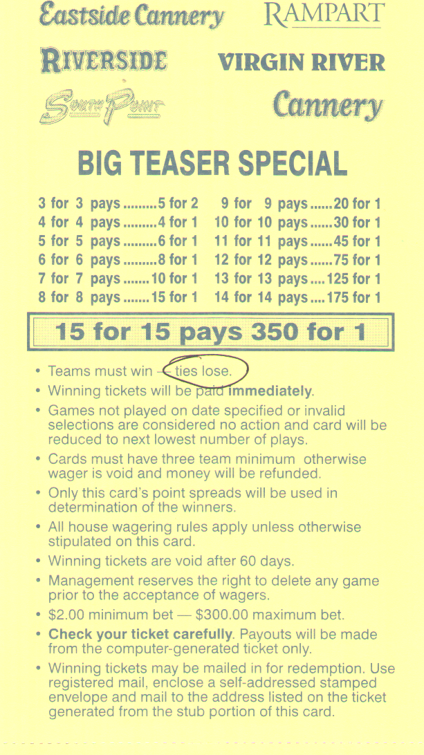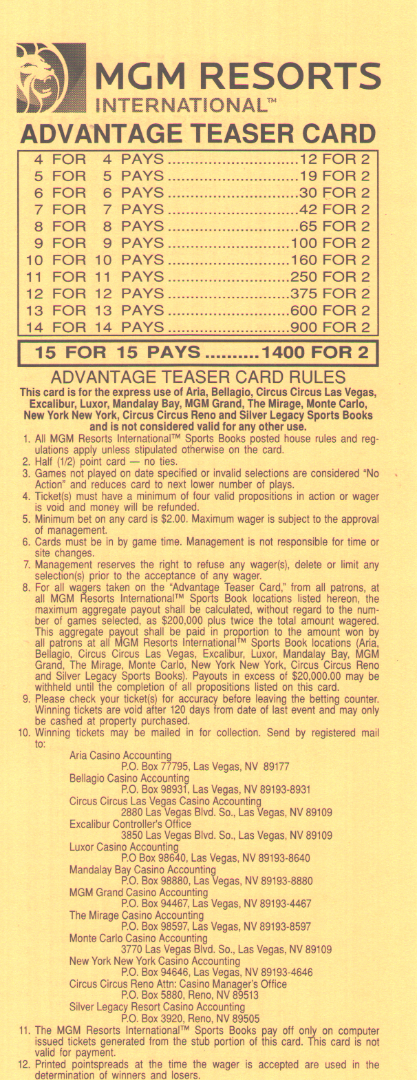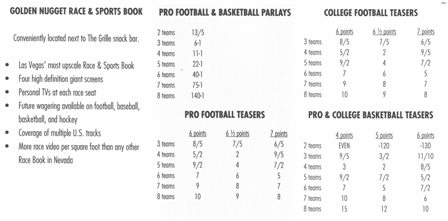 投注者可以選擇在每輪過關投注中獲得6、6.5或7個額外點數。當然,投注者獲得的點數越多,獲勝的幾率就越低。各個地方的獲勝賠率各不相同,因此請參考我的賠率表,以了解哪個地方的賠率最高。不過,對於那些懶惰的讀者來說,Jerry's Nugget 擁有場外過關投注中,在輪數和點數方面都最高的賠率。