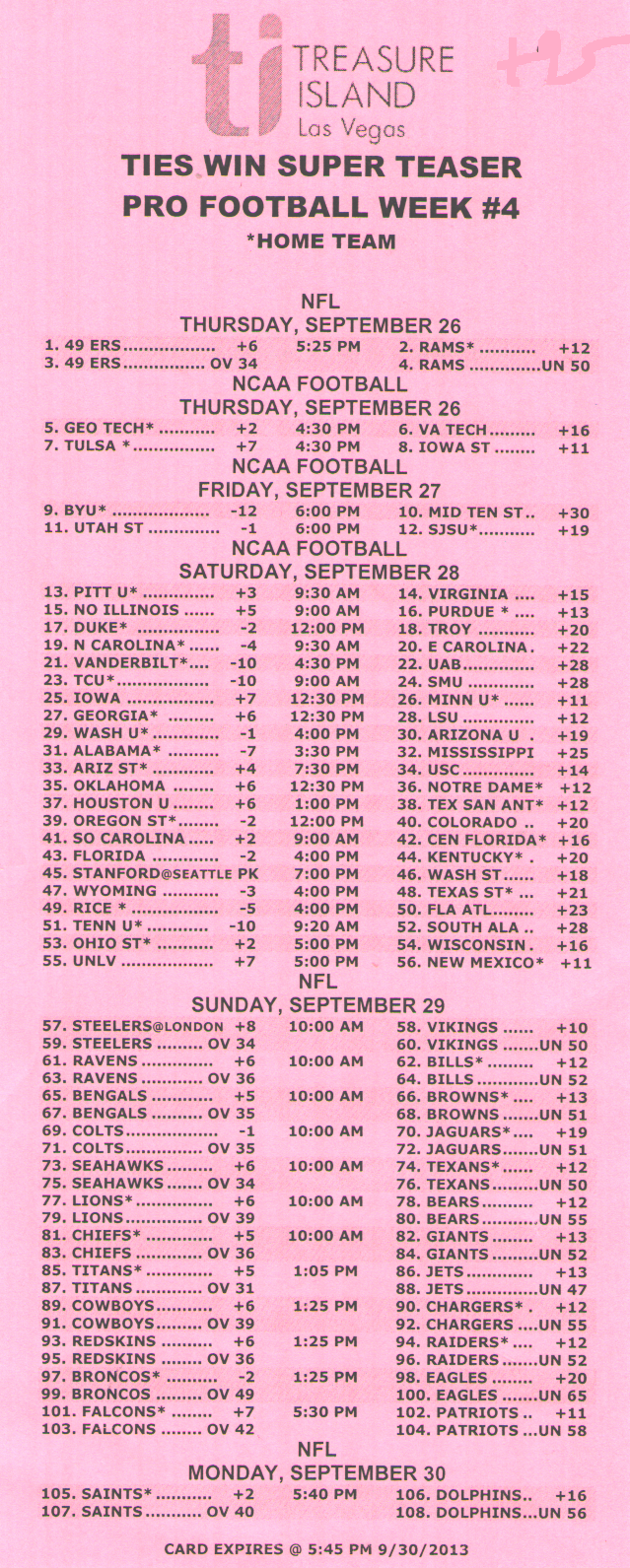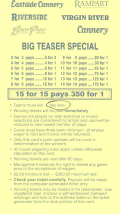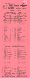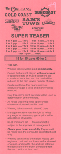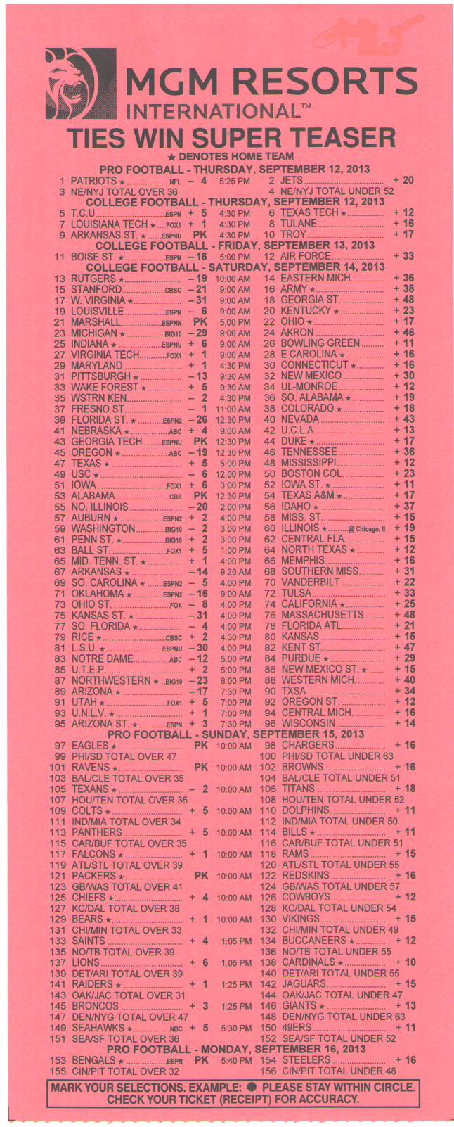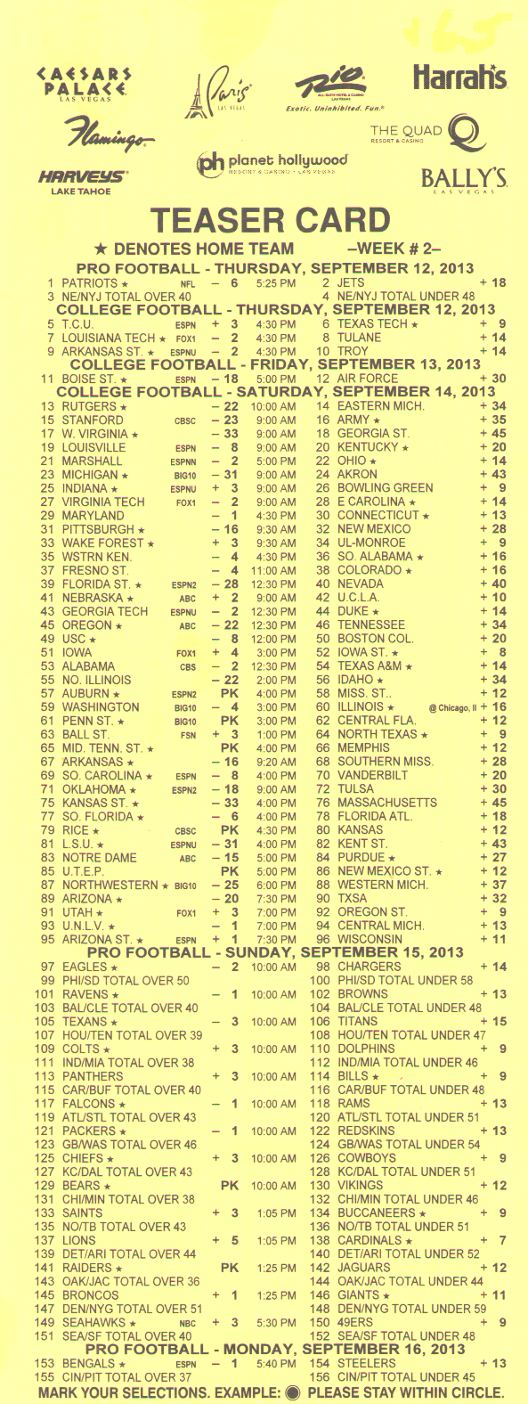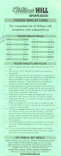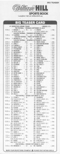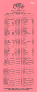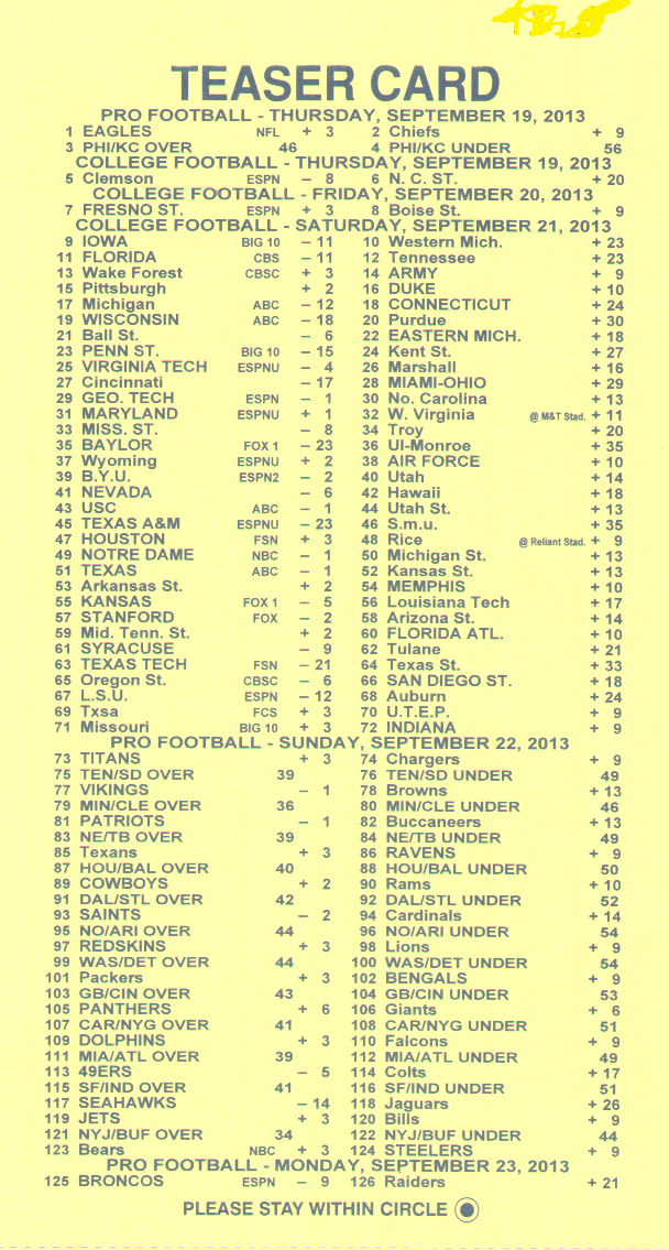 「場外讓分盤」(OTB)是指投注時投注盤外的讓分盤。無需填寫任何卡片。投注者只需告知投注者讓分盤的投注局數、每局的額外分數、希望投注的號碼以及投注金額。例如,投注者可能會說:“NFL 三隊 6 分讓分盤,投注 213、218 和 224,投注金額 100 美元。”