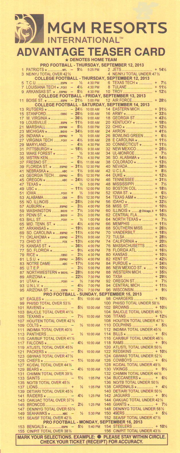 米高梅 | 10至13 | 8點到5點 | 5比2 | 4比1 | 6比1 | 10比1 | 15比1 | ||