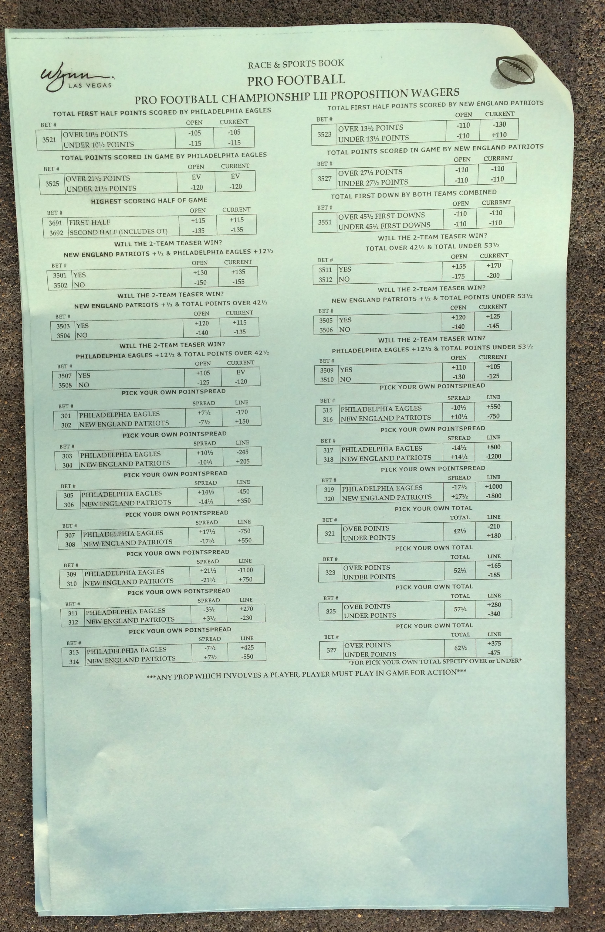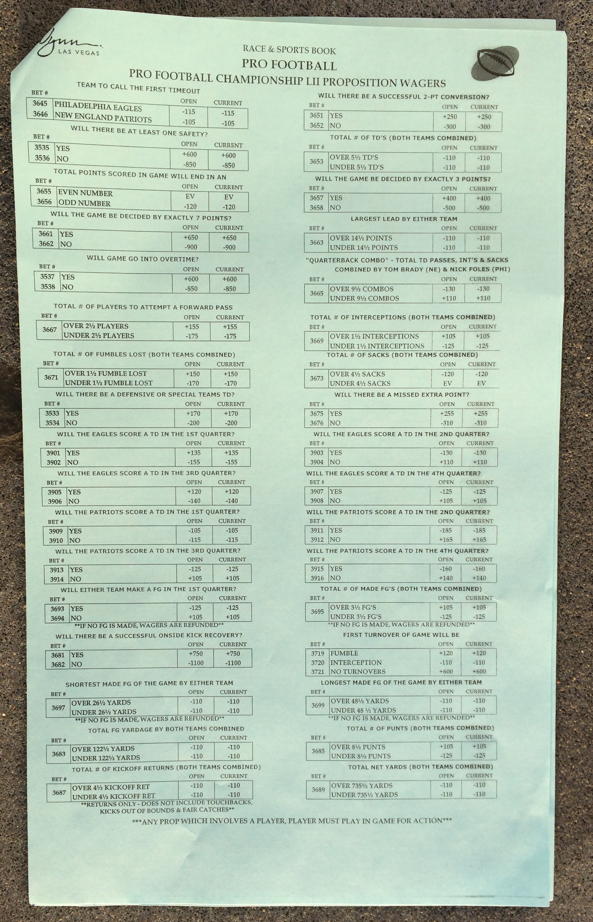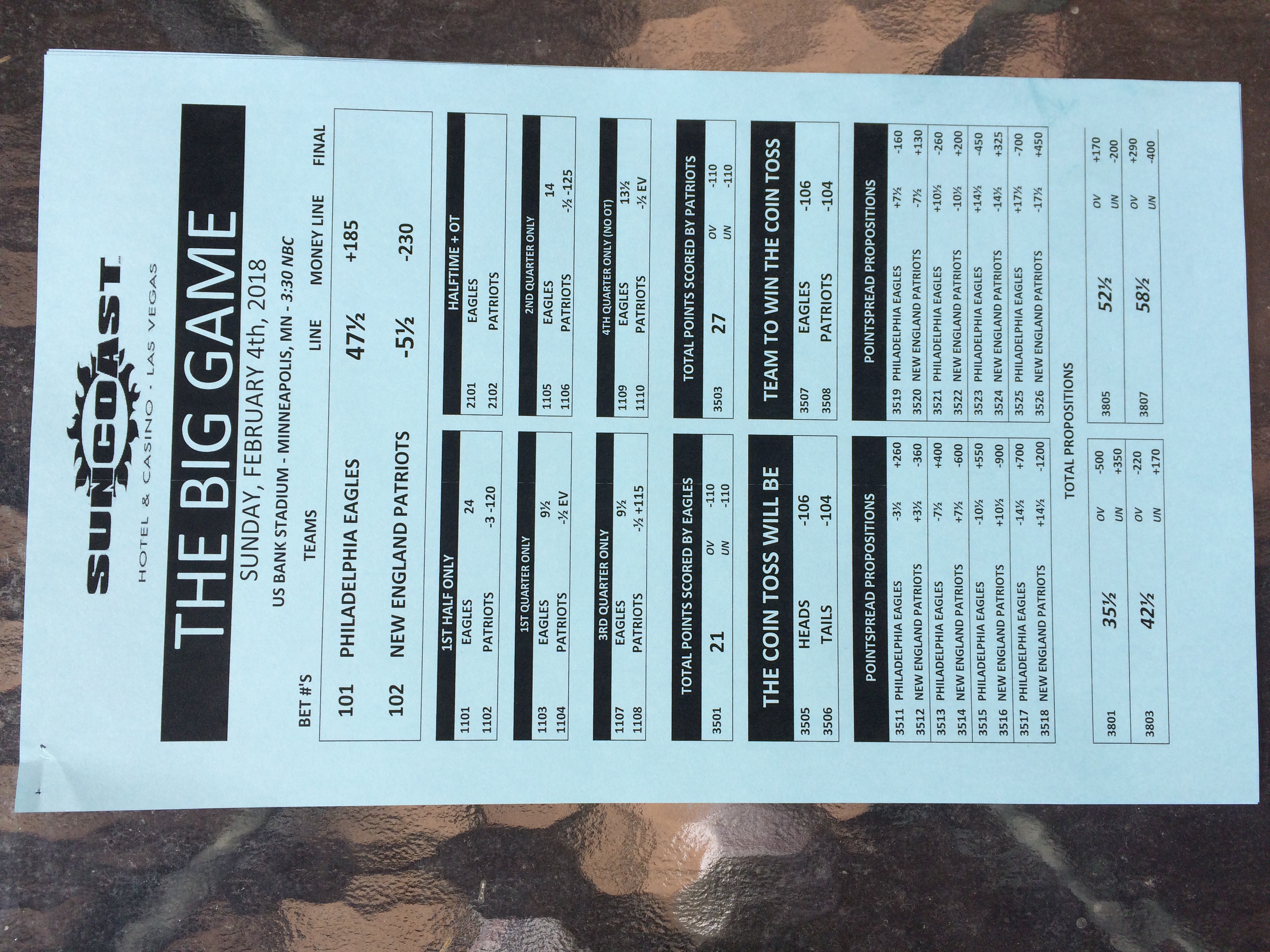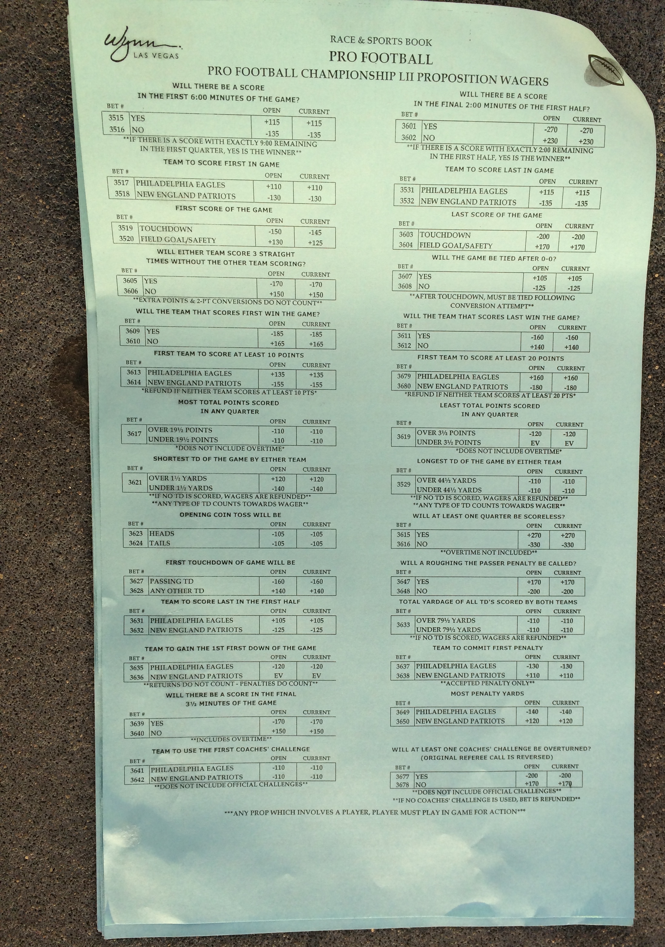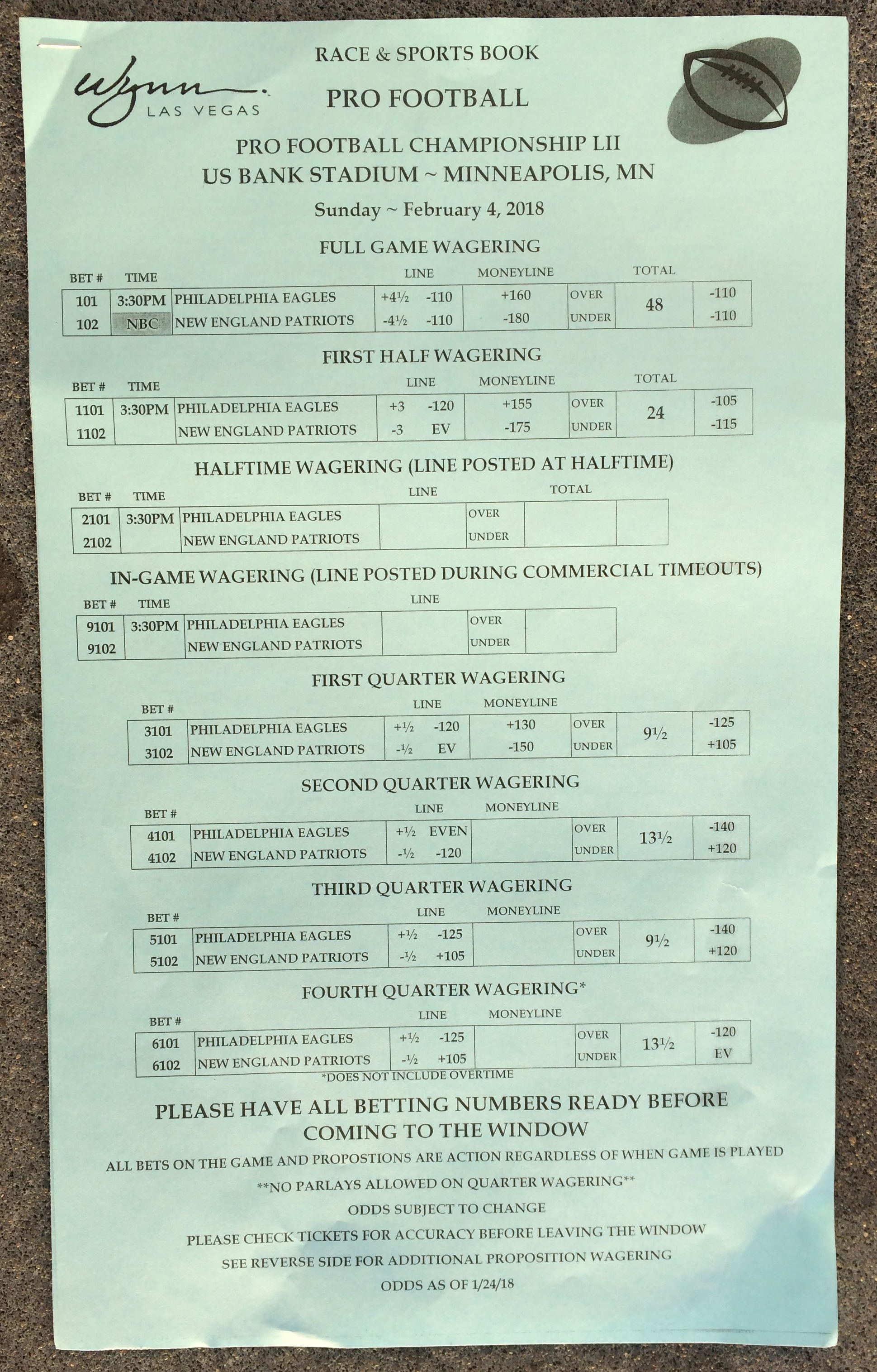 以下是拉斯維加斯幾家體育博彩公司每頁投注單的圖片。這些表格收集於2018年1月27日,即比賽開始前八天。