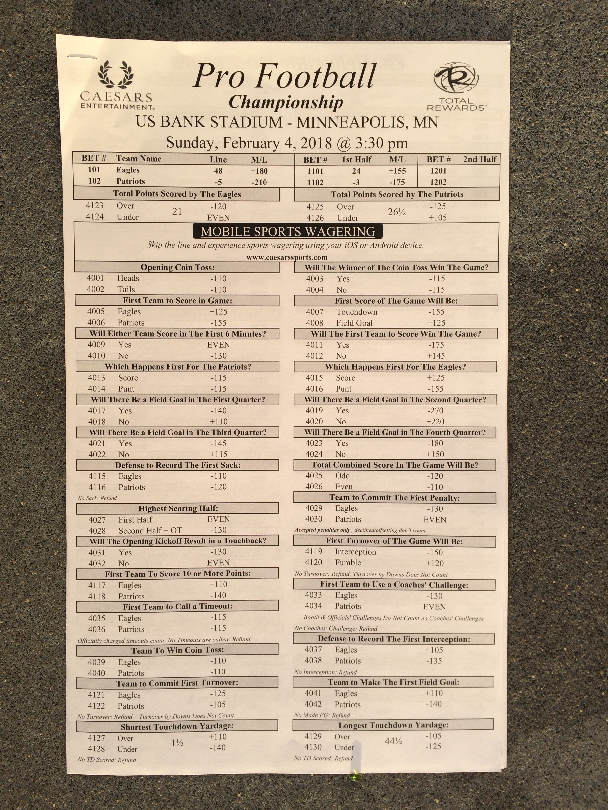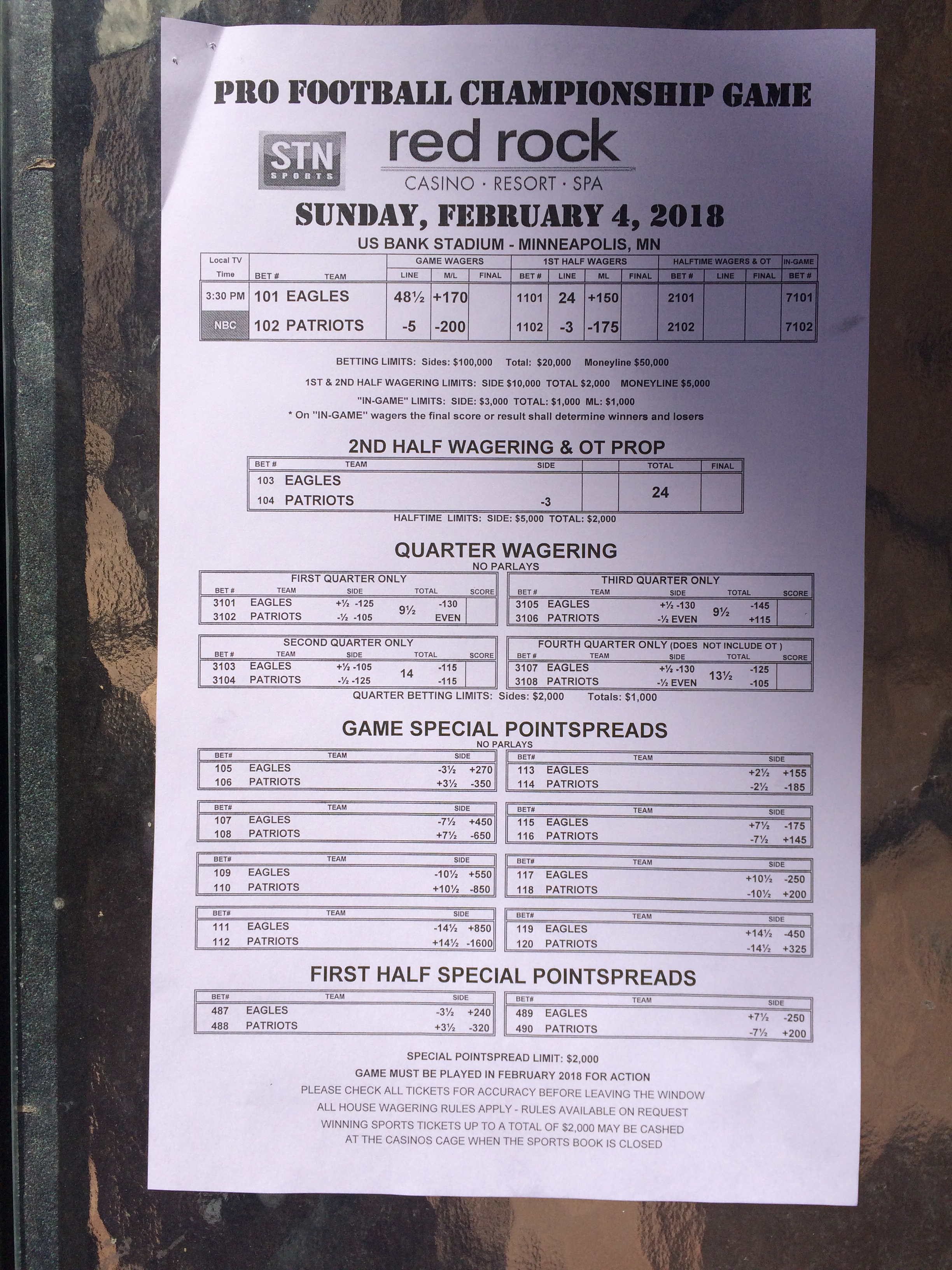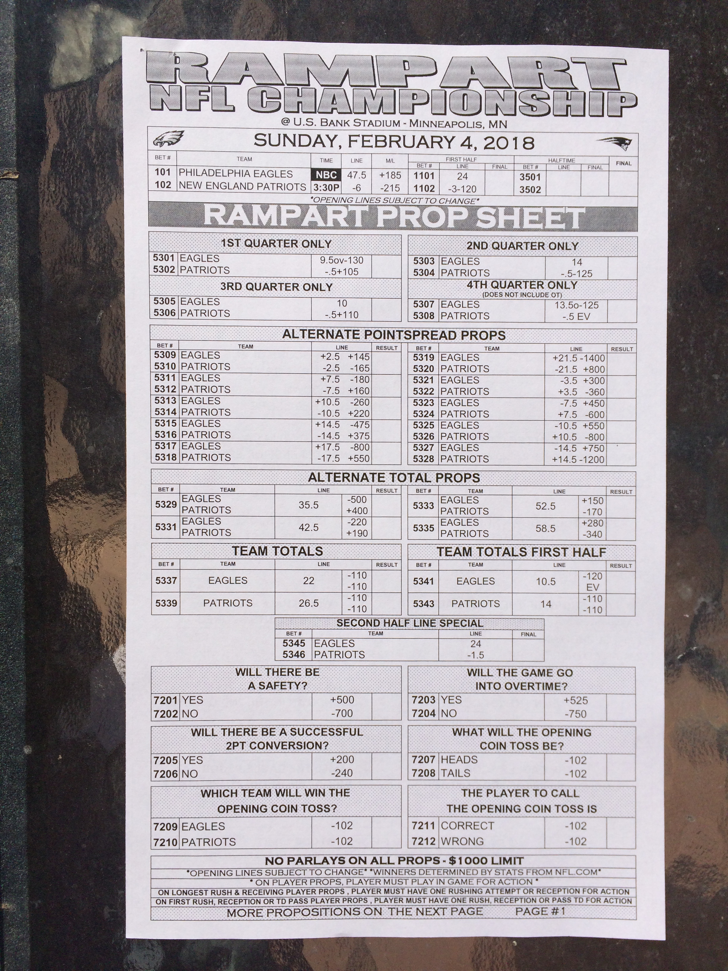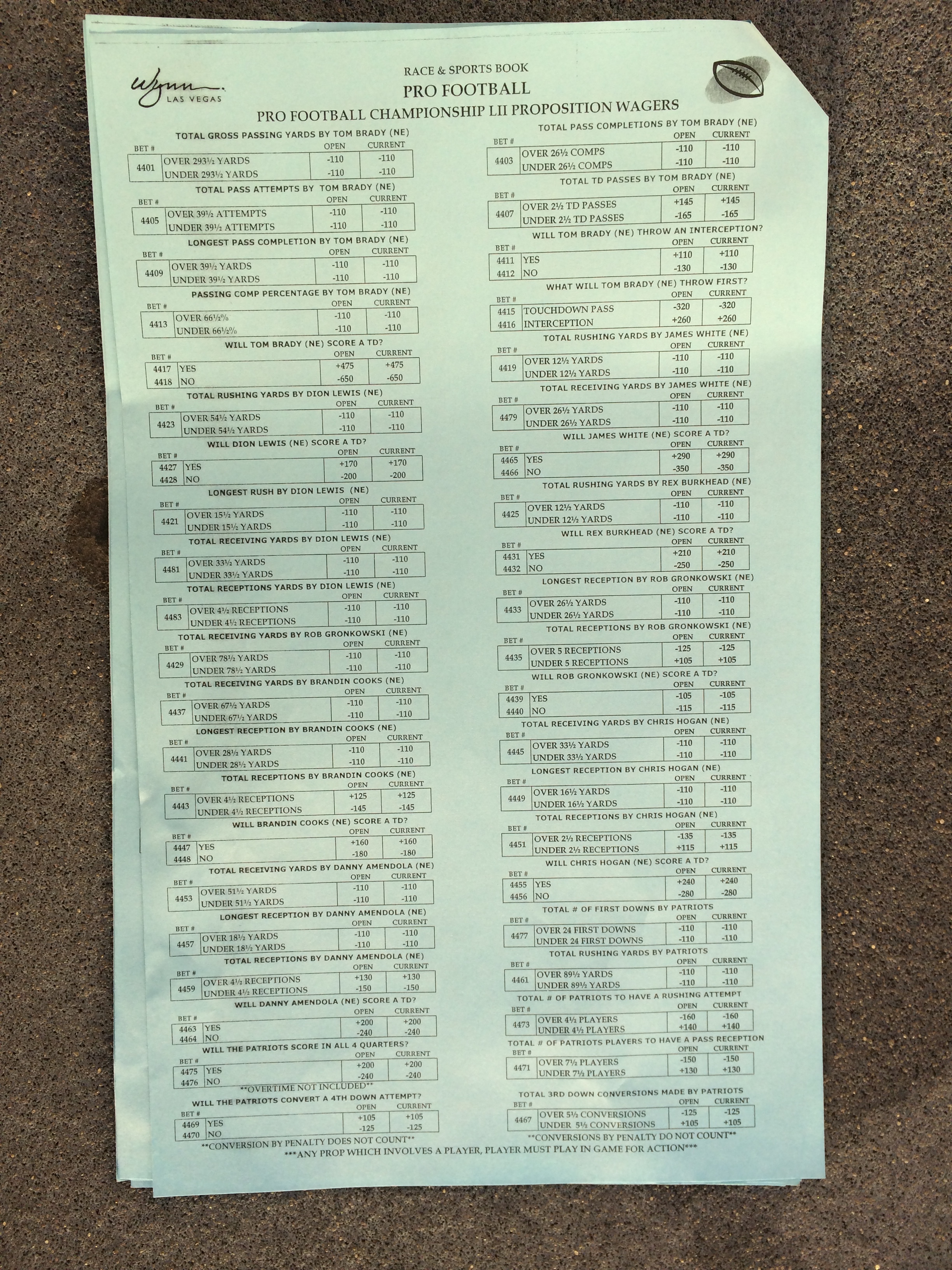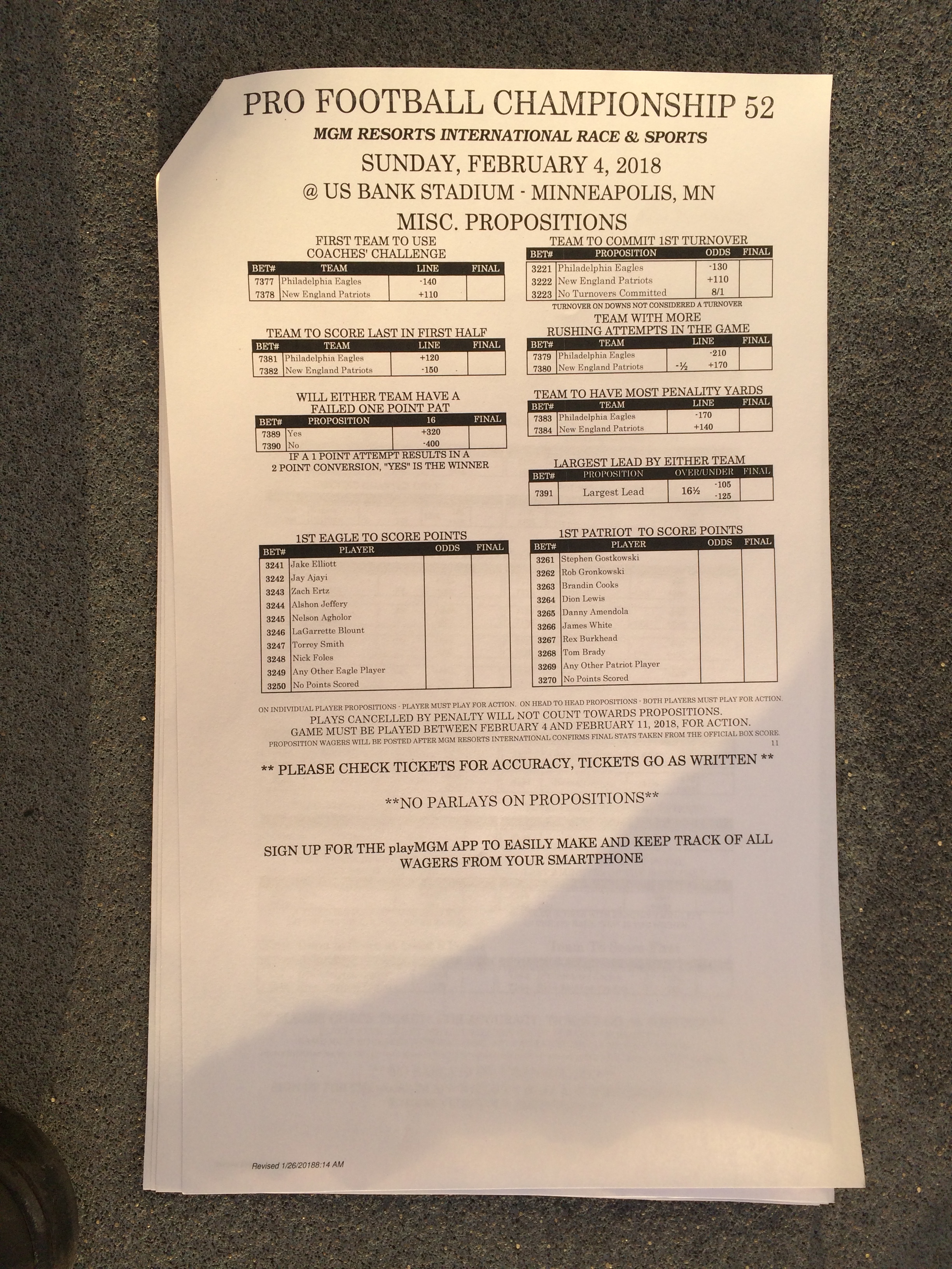 以下是拉斯維加斯幾家體育博彩公司每頁投注單的圖片。這些表格收集於2018年1月27日,即比賽開始前八天。
