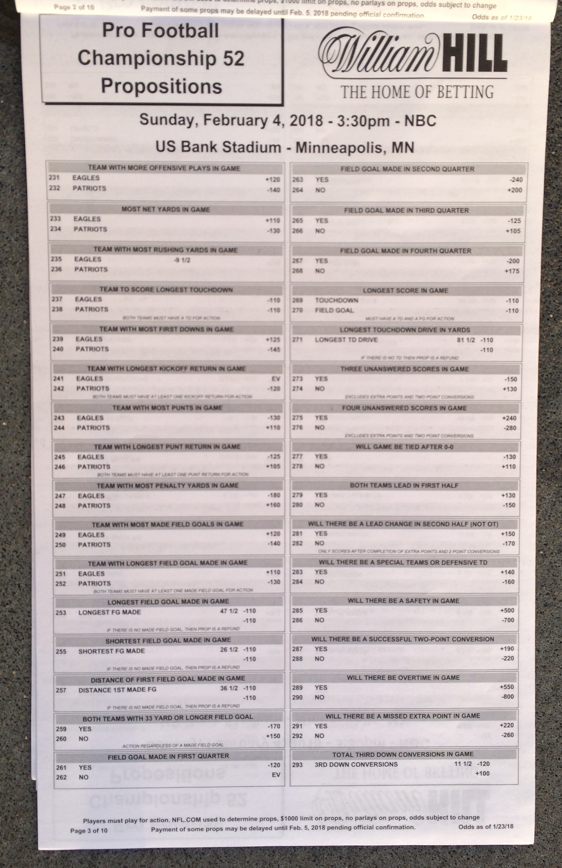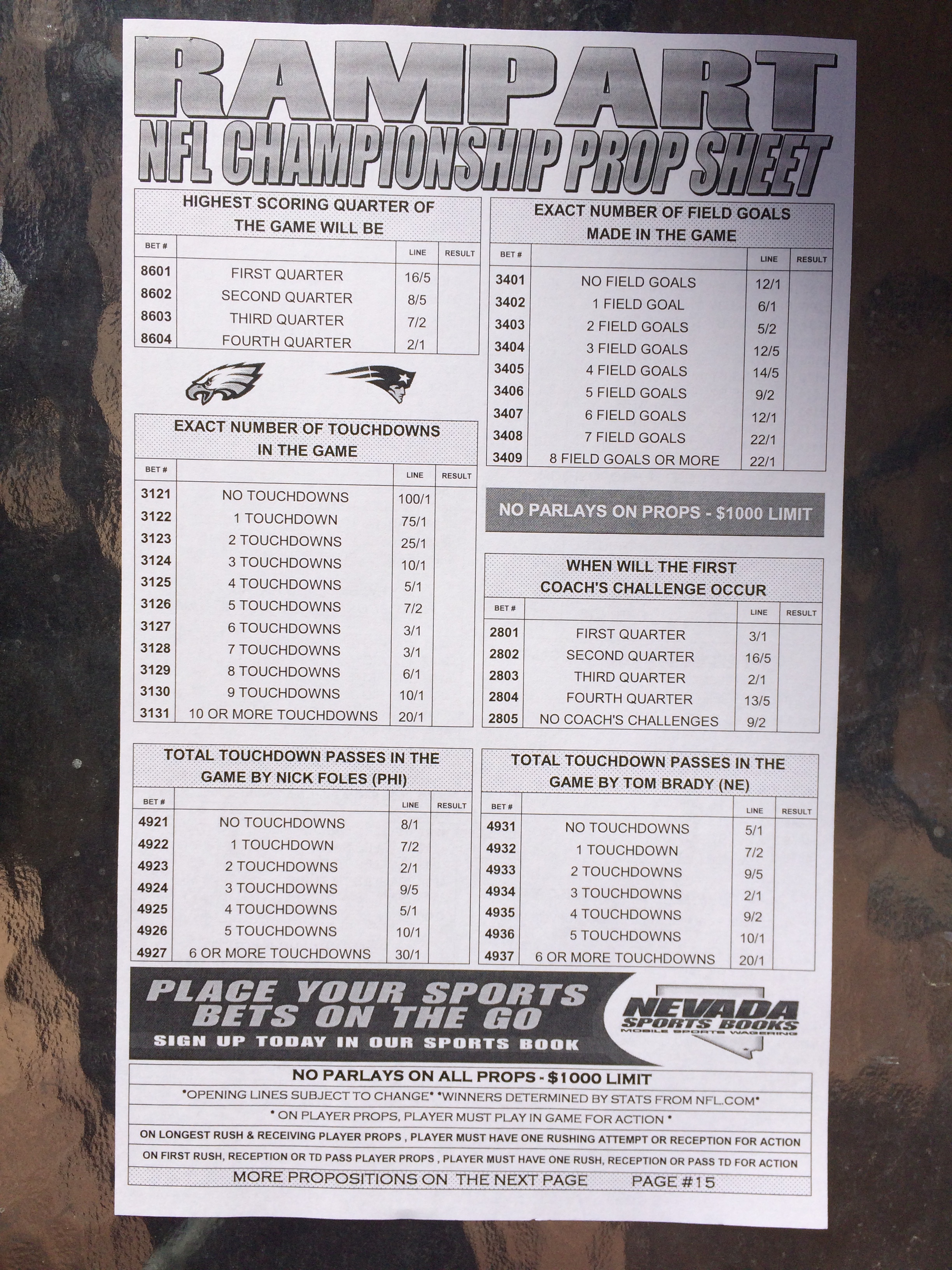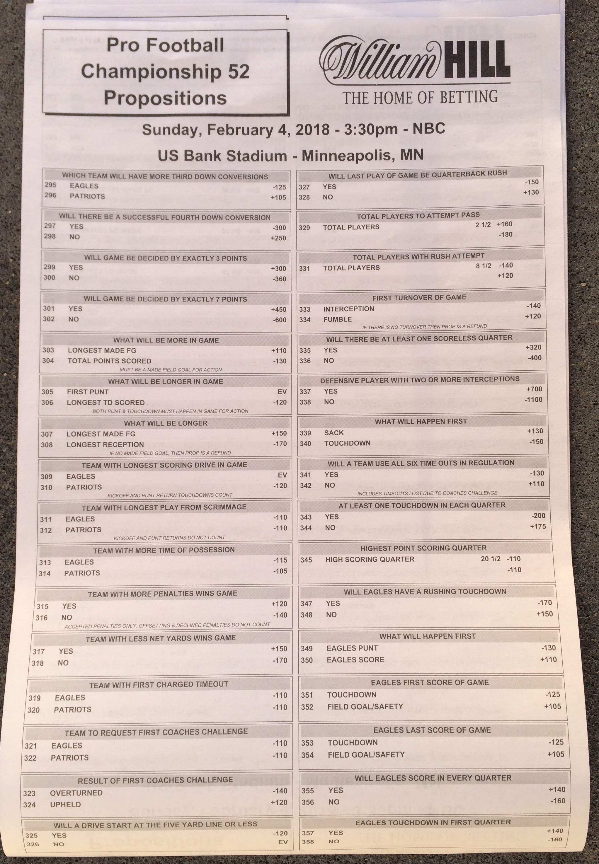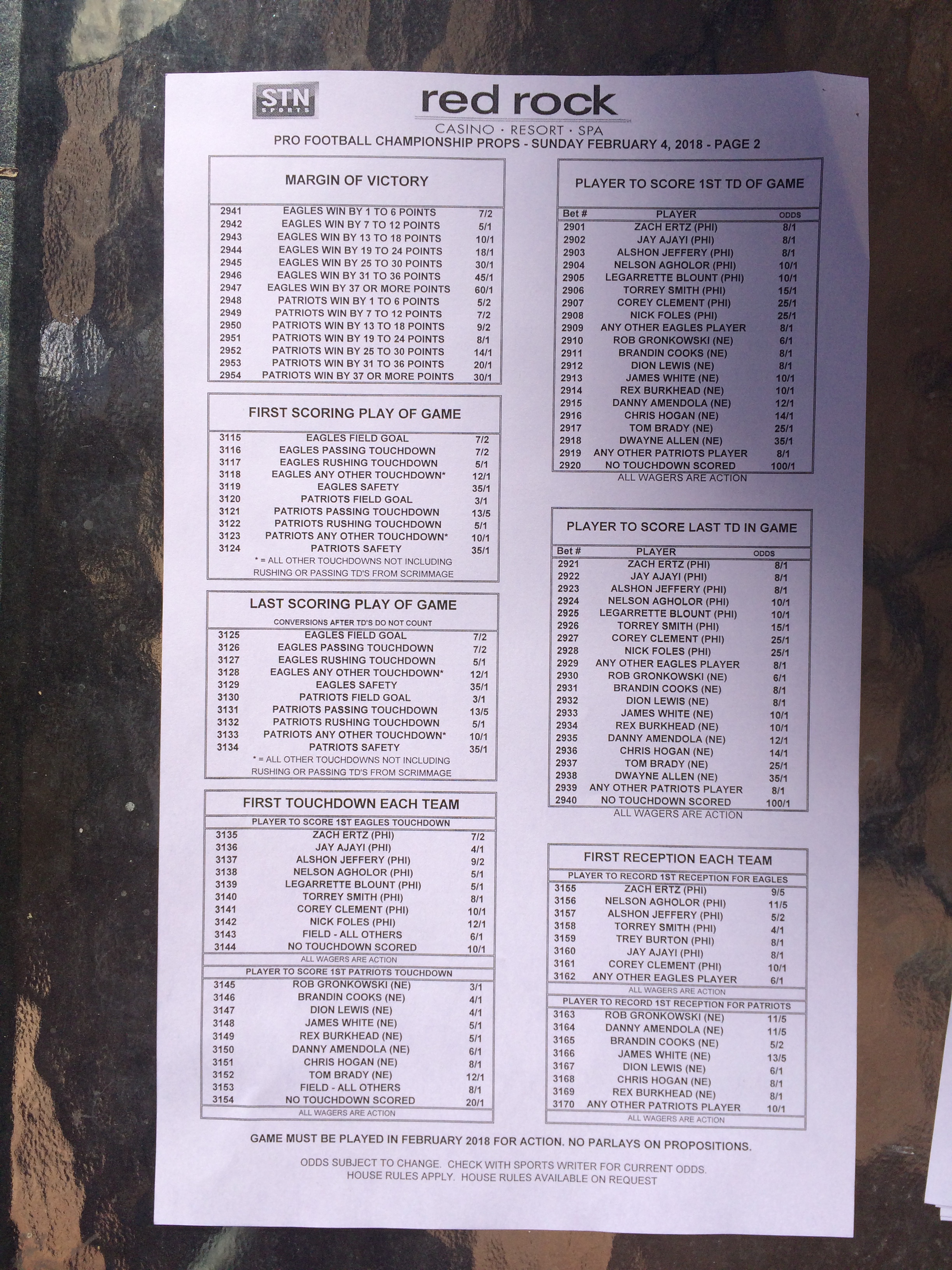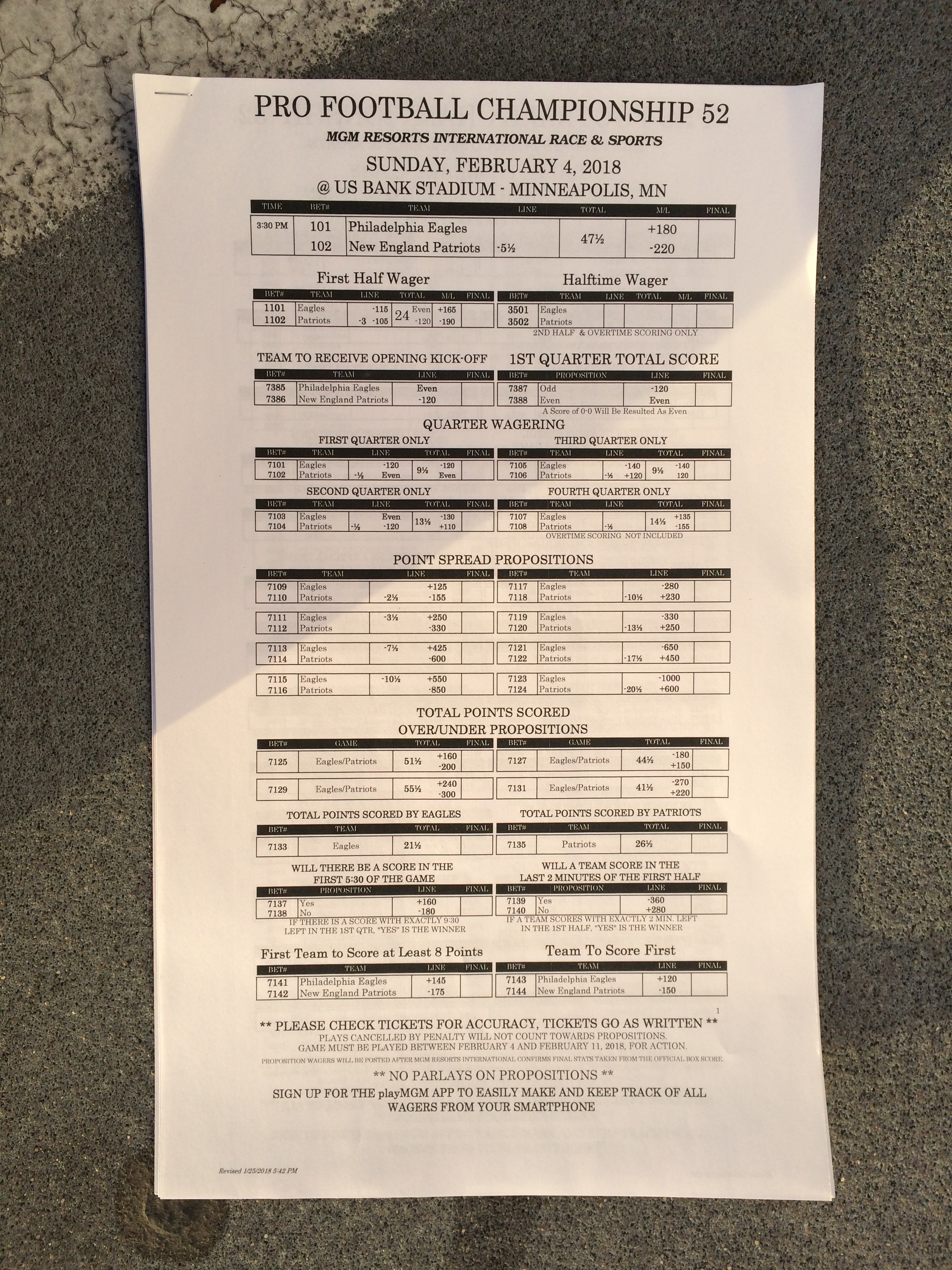 以下是拉斯維加斯幾家體育博彩公司每頁投注單的圖片。這些表格收集於2018年1月27日,即比賽開始前八天。
