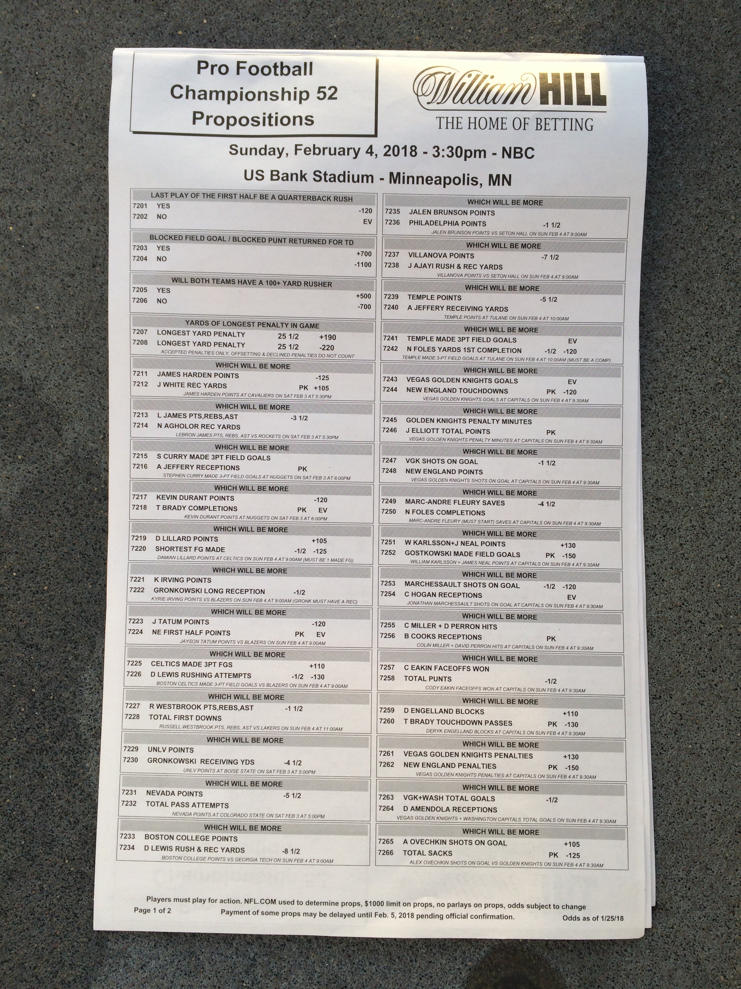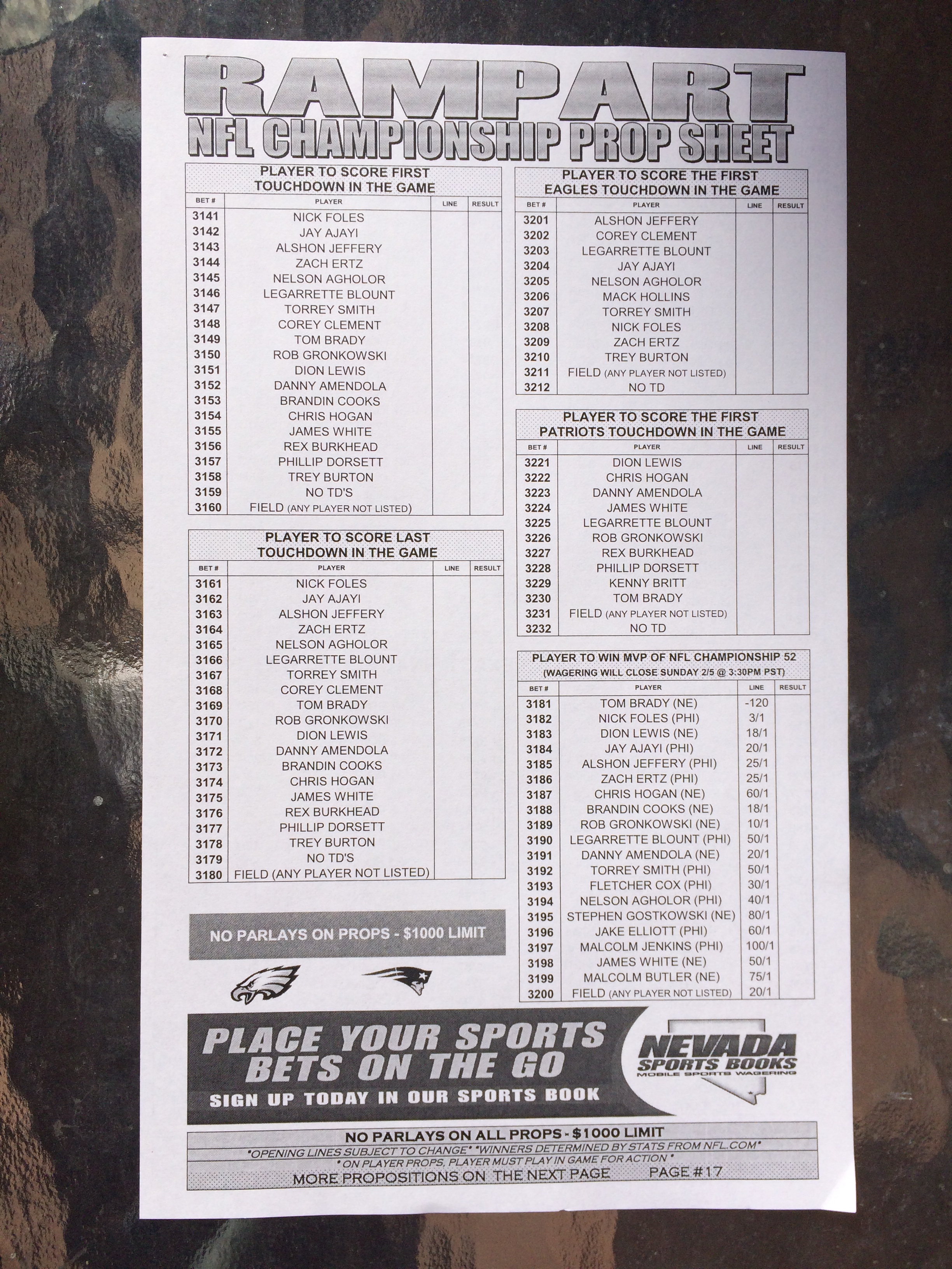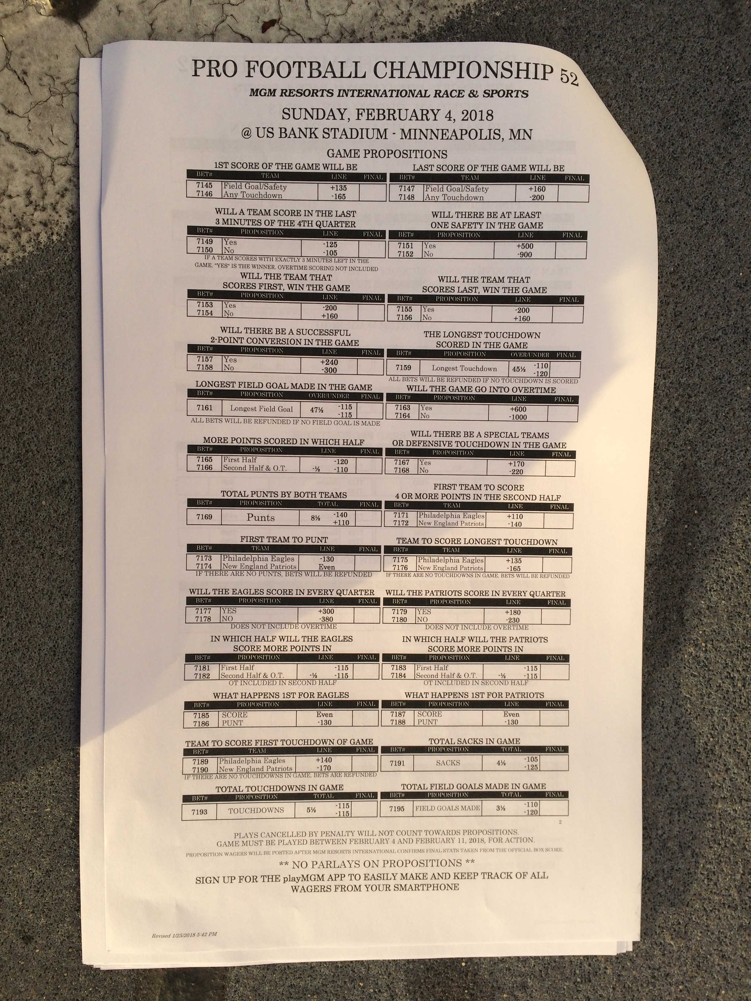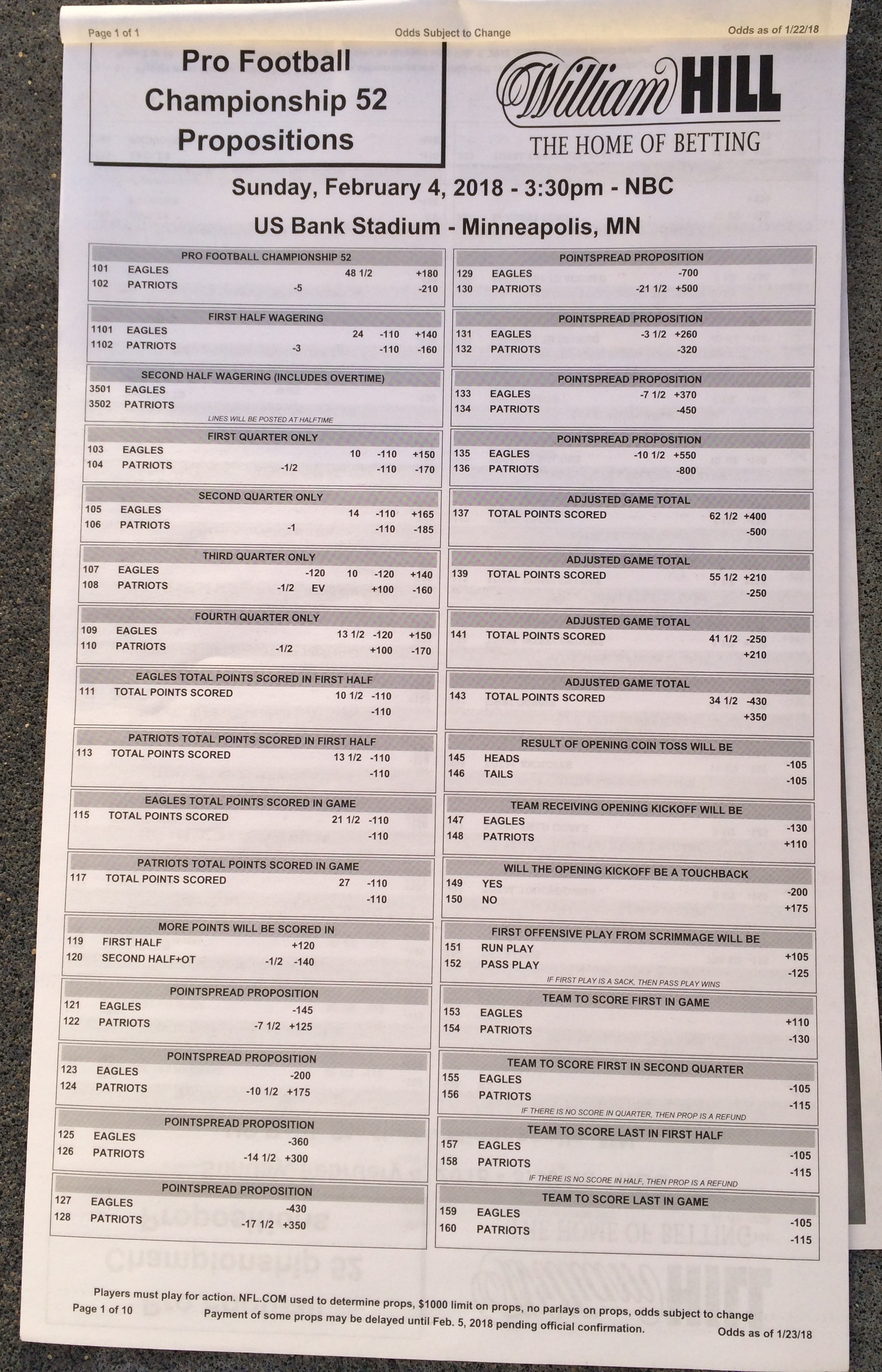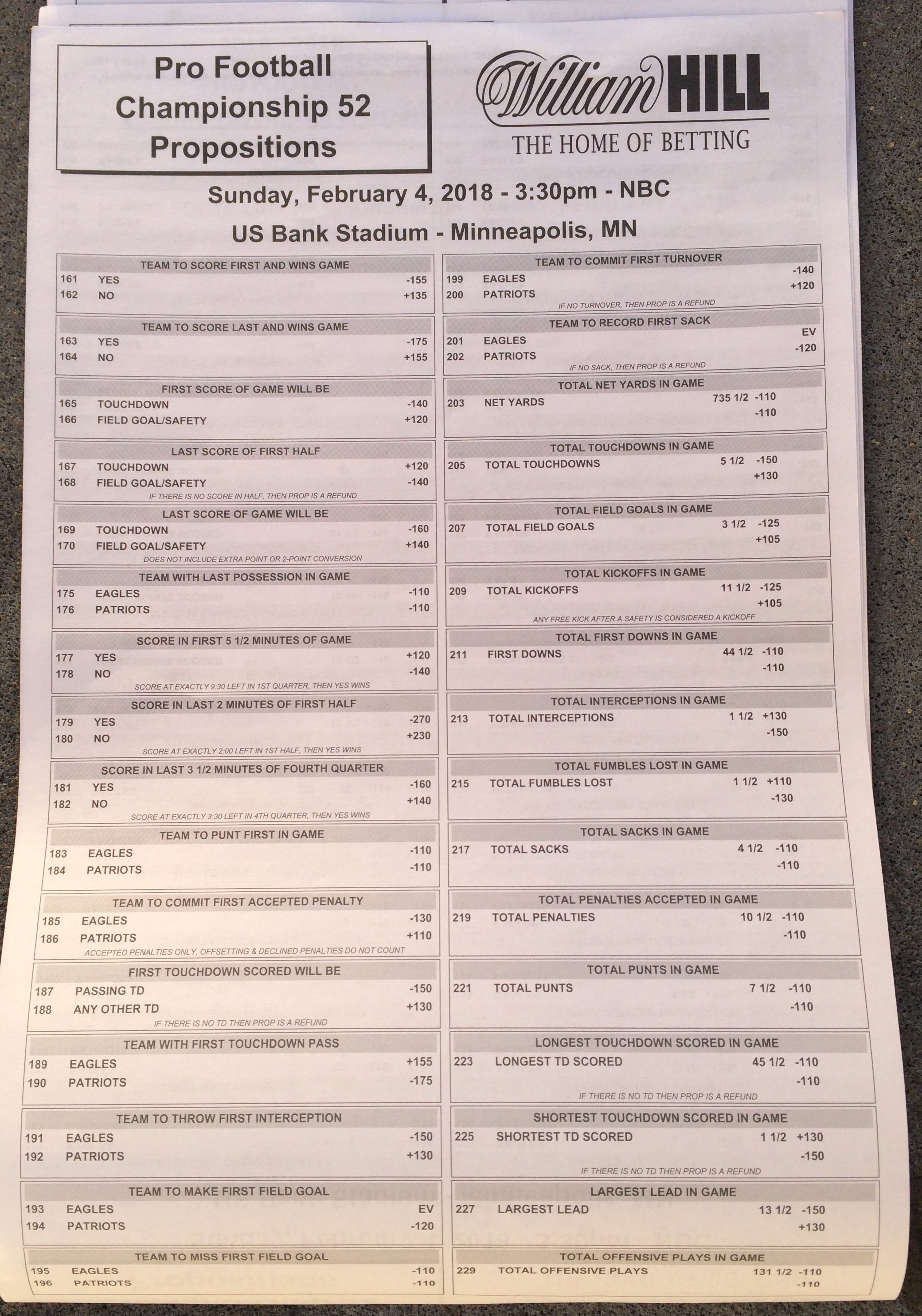以下是拉斯維加斯幾家體育博彩公司每頁投注單的圖片。這些表格收集於2018年1月27日,即比賽開始前八天。