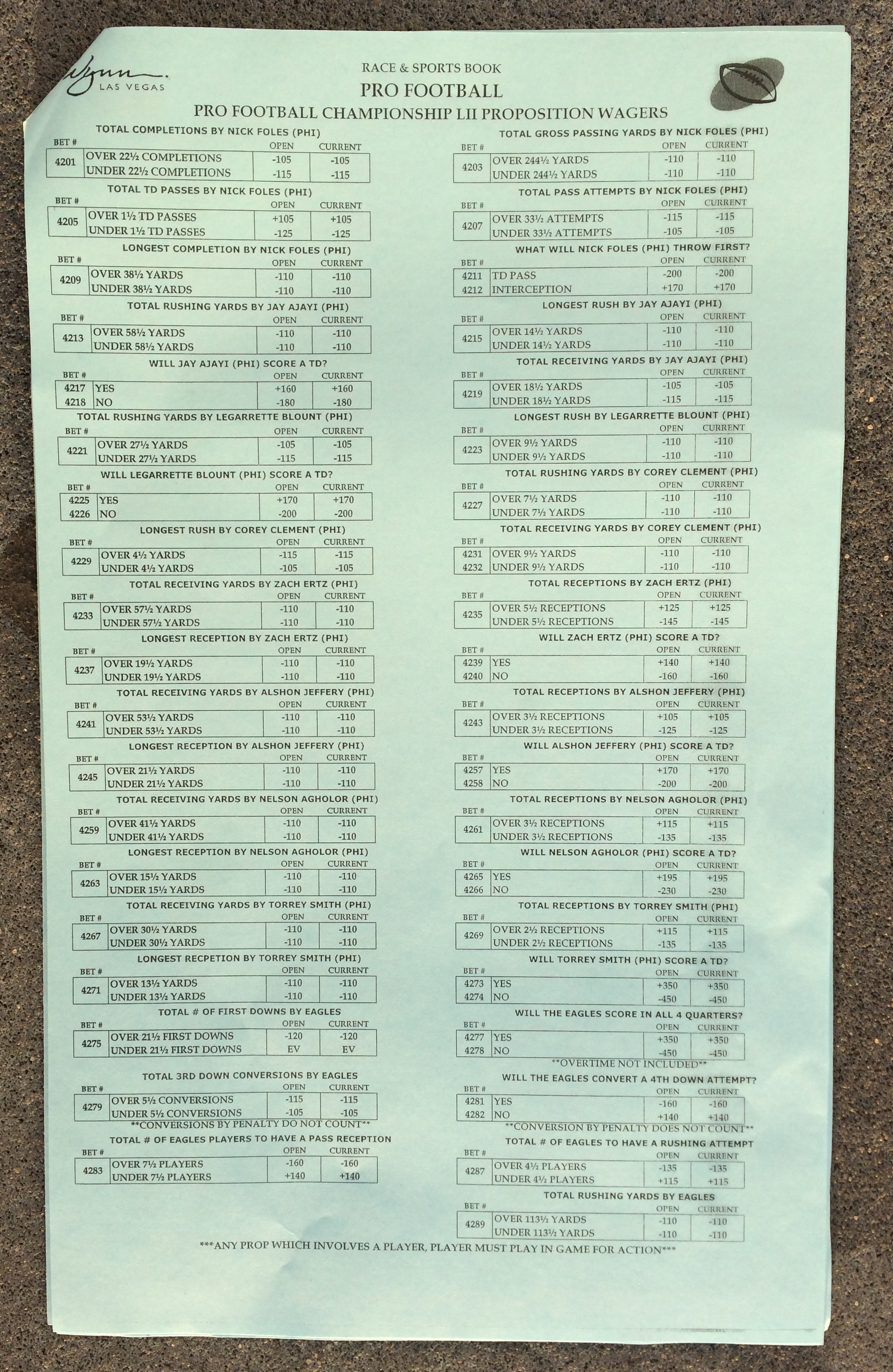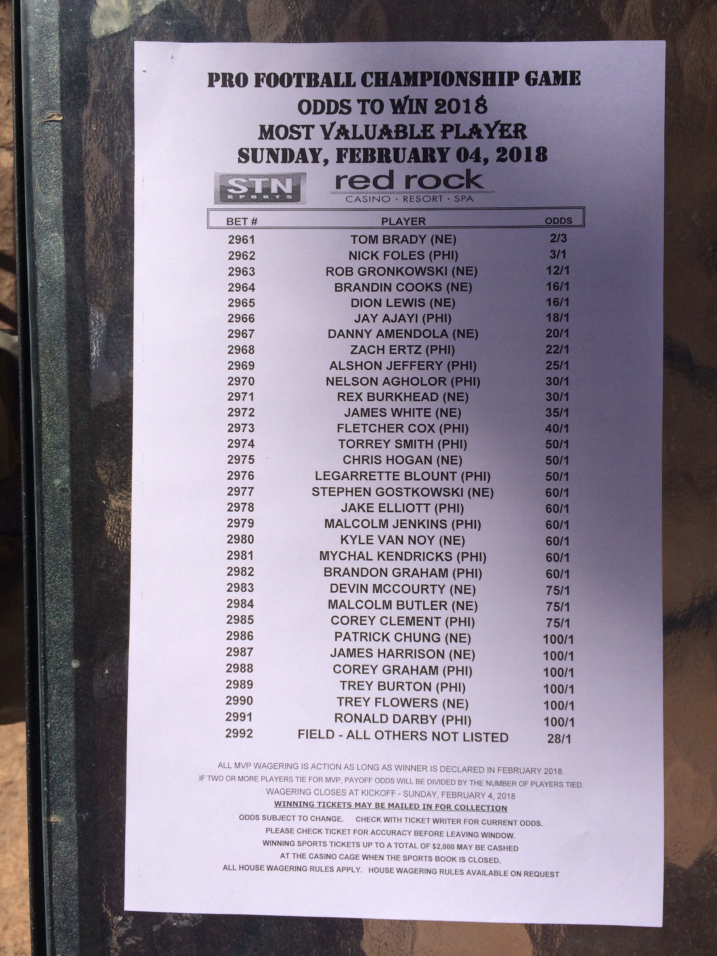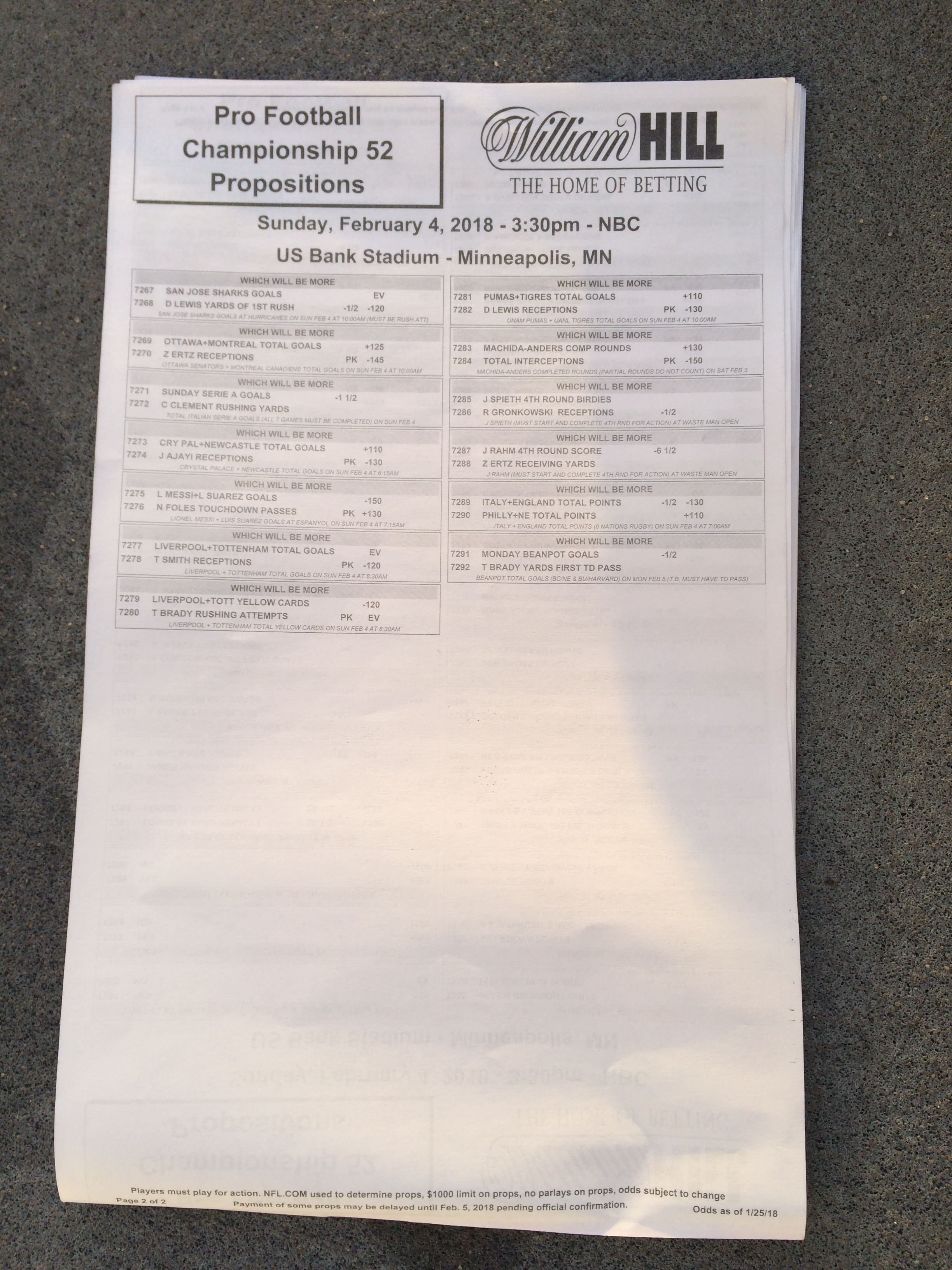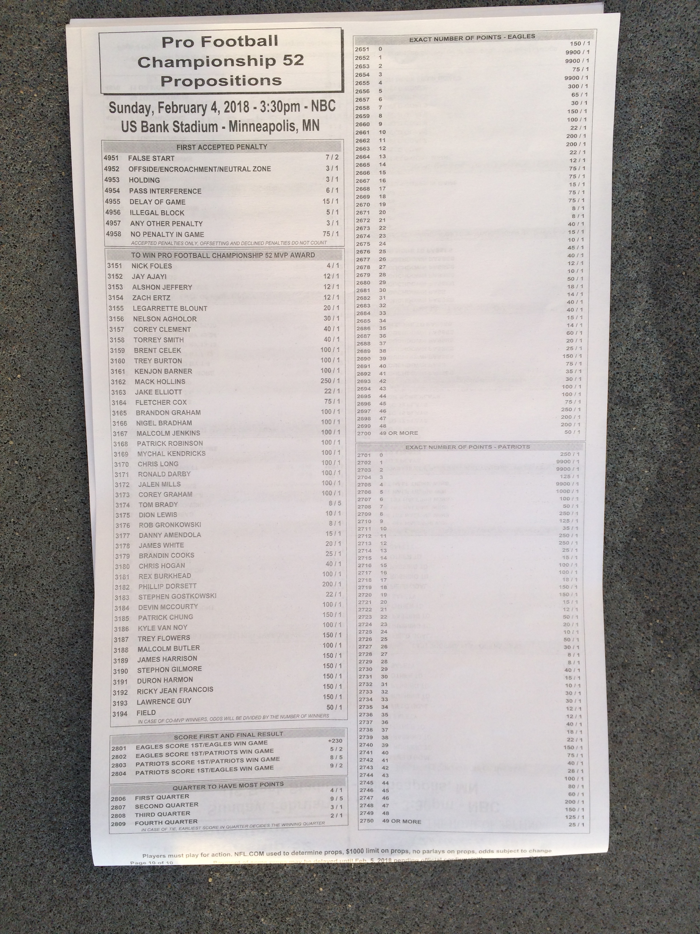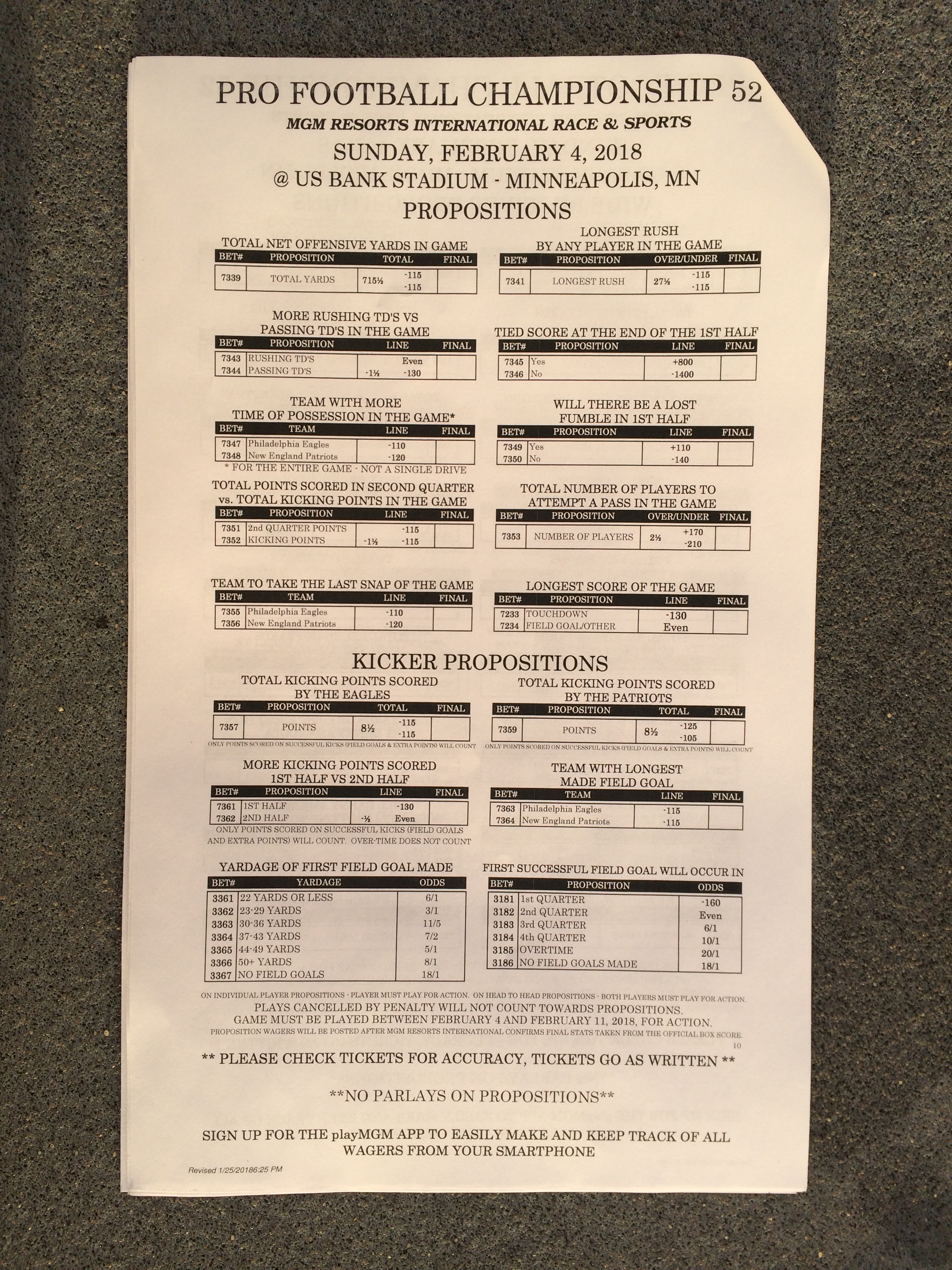 以下是拉斯維加斯幾家體育博彩公司每頁投注單的圖片。這些表格收集於2018年1月27日,即比賽開始前八天。