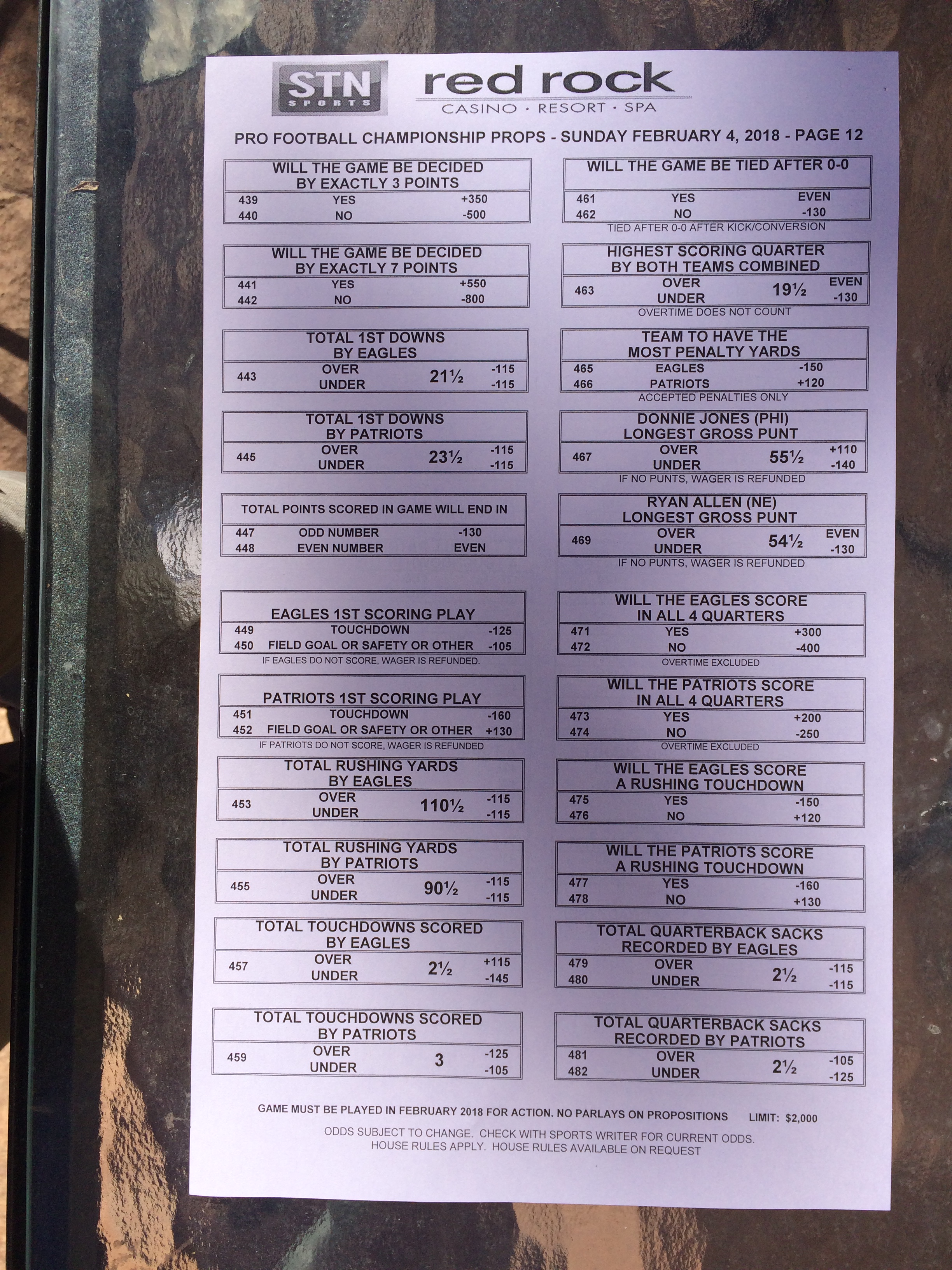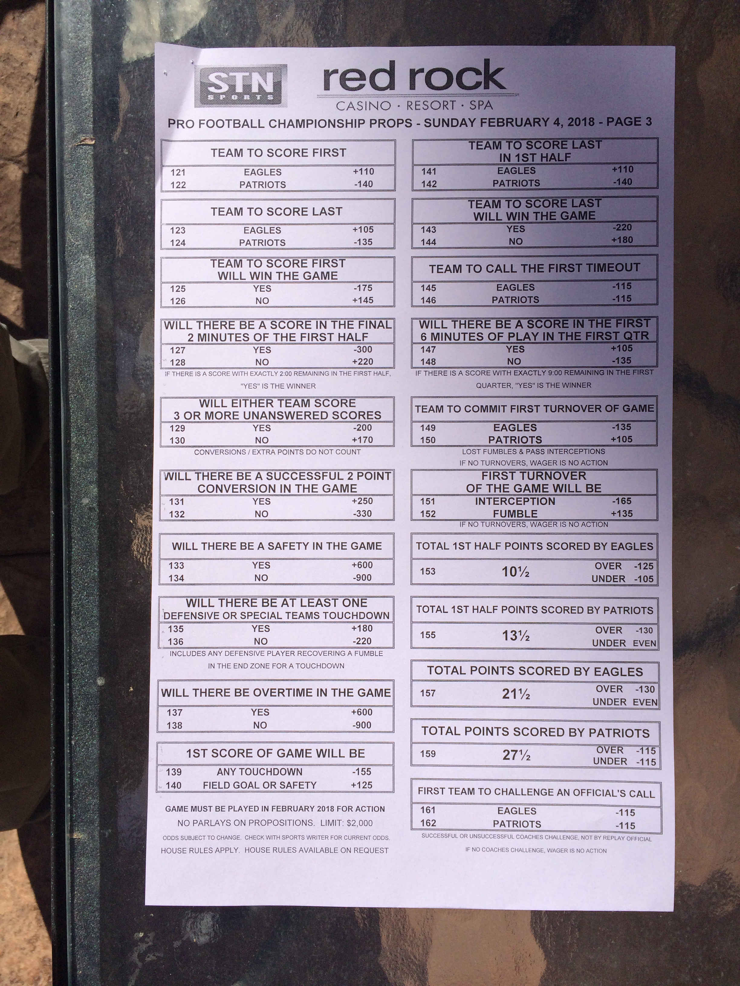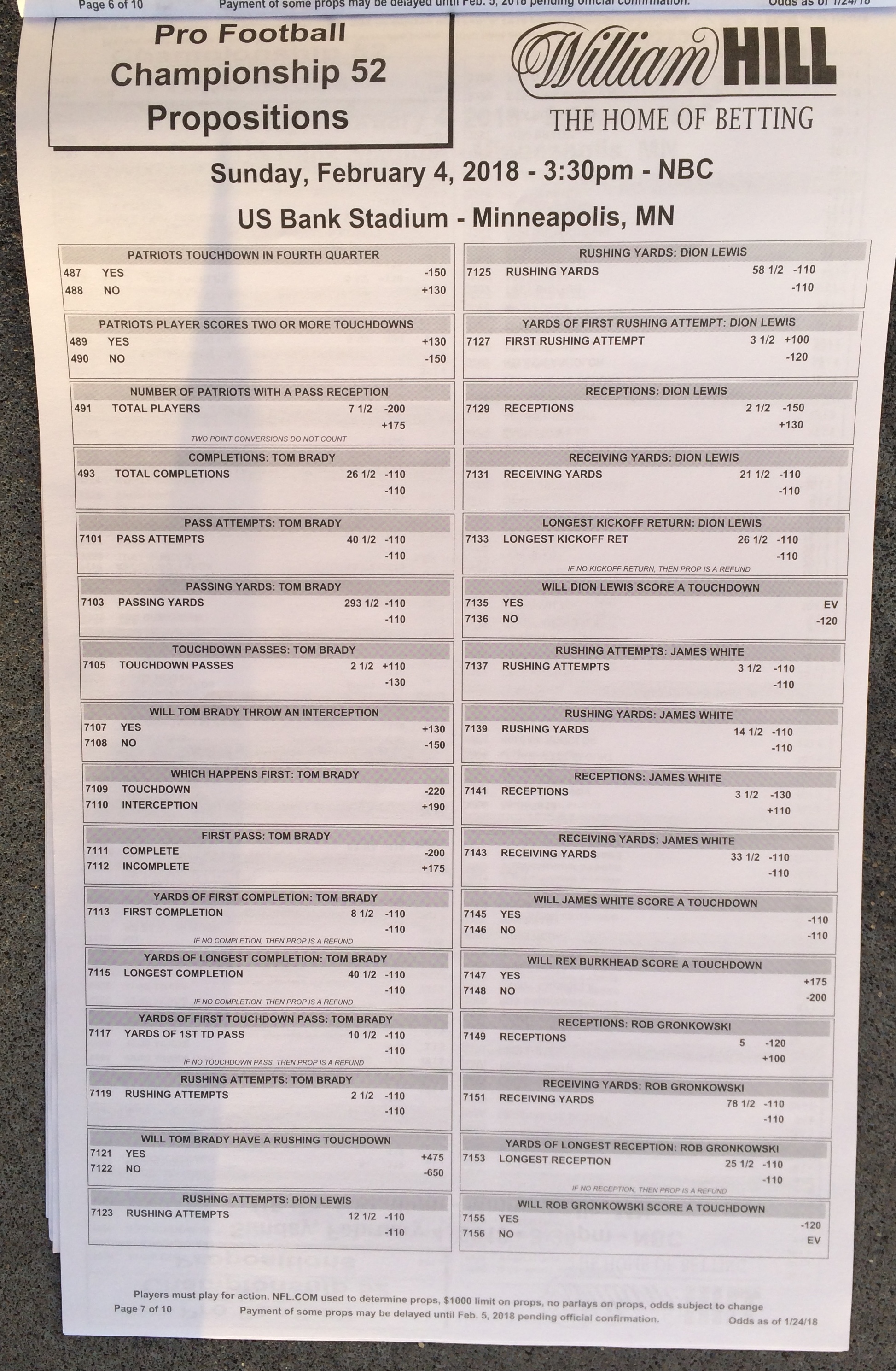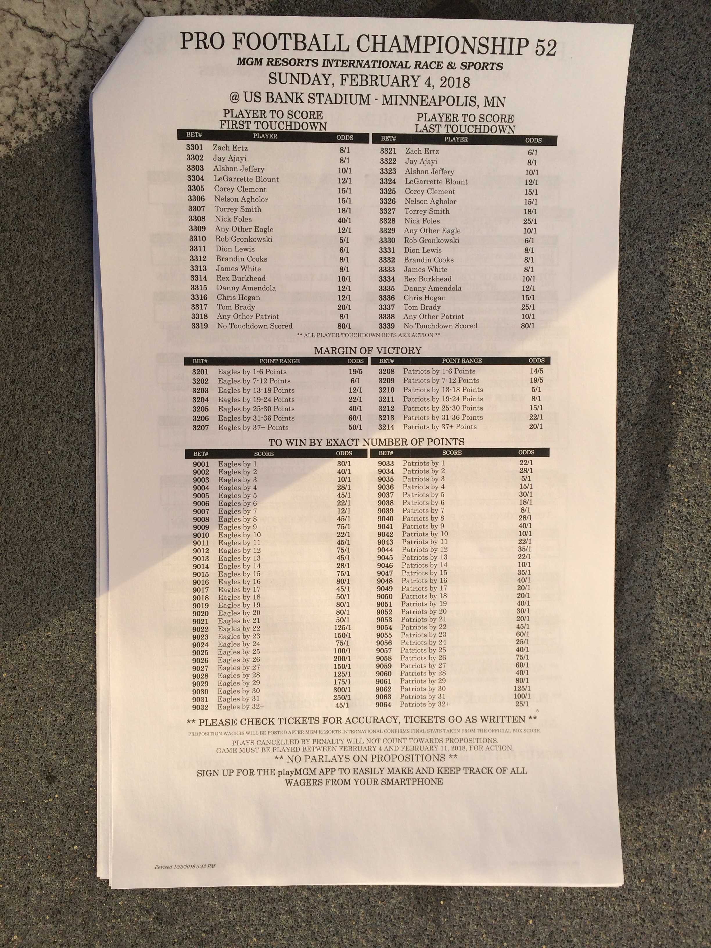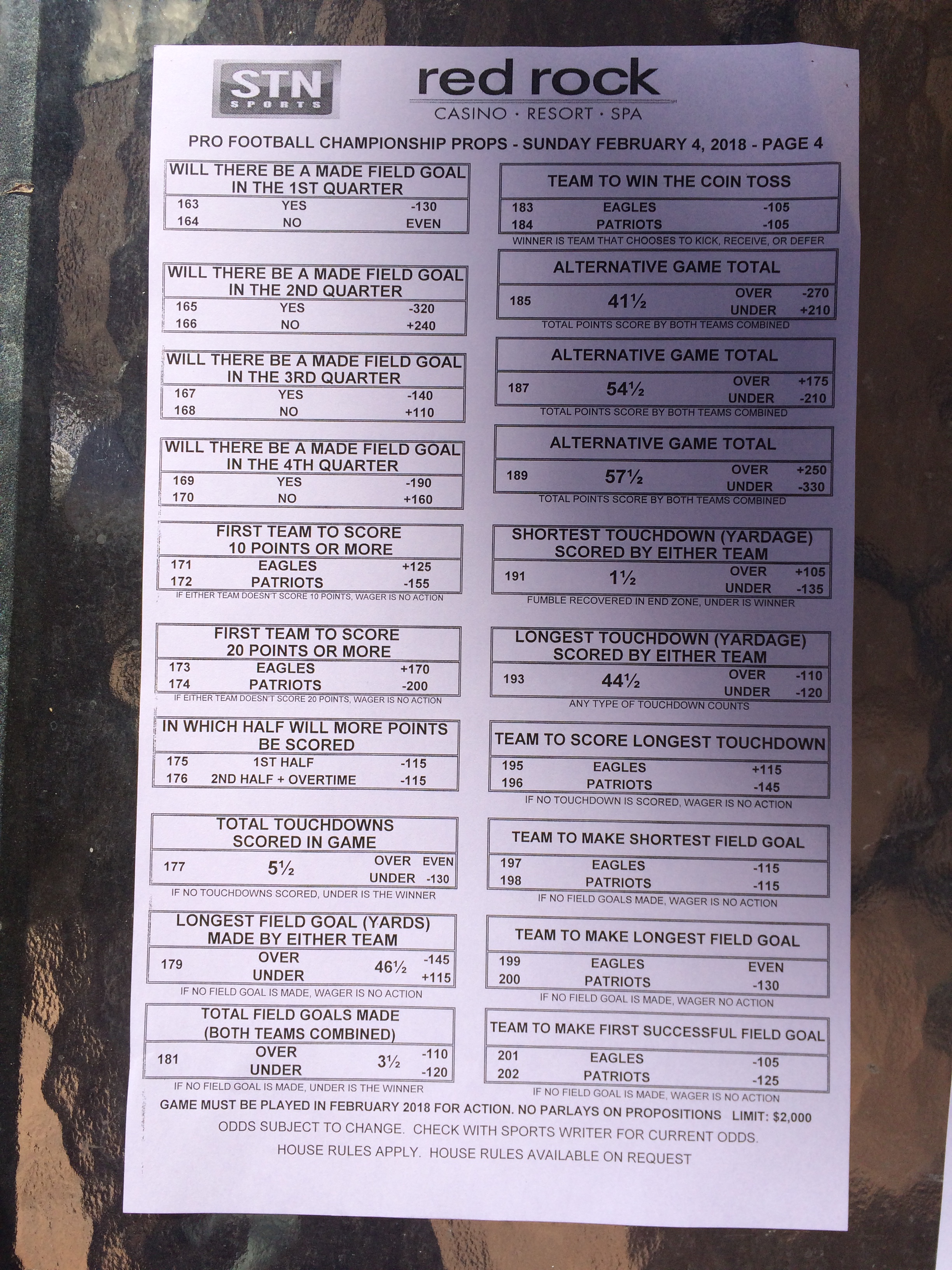 以下是拉斯維加斯幾家體育博彩公司每頁投注單的圖片。這些表格收集於2018年1月27日,即比賽開始前八天。