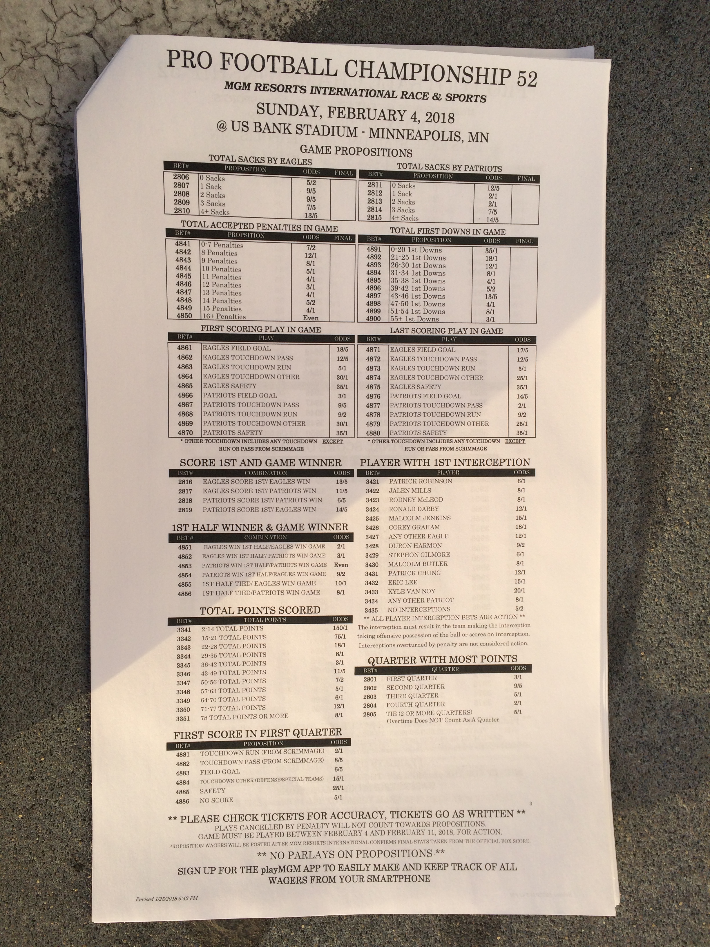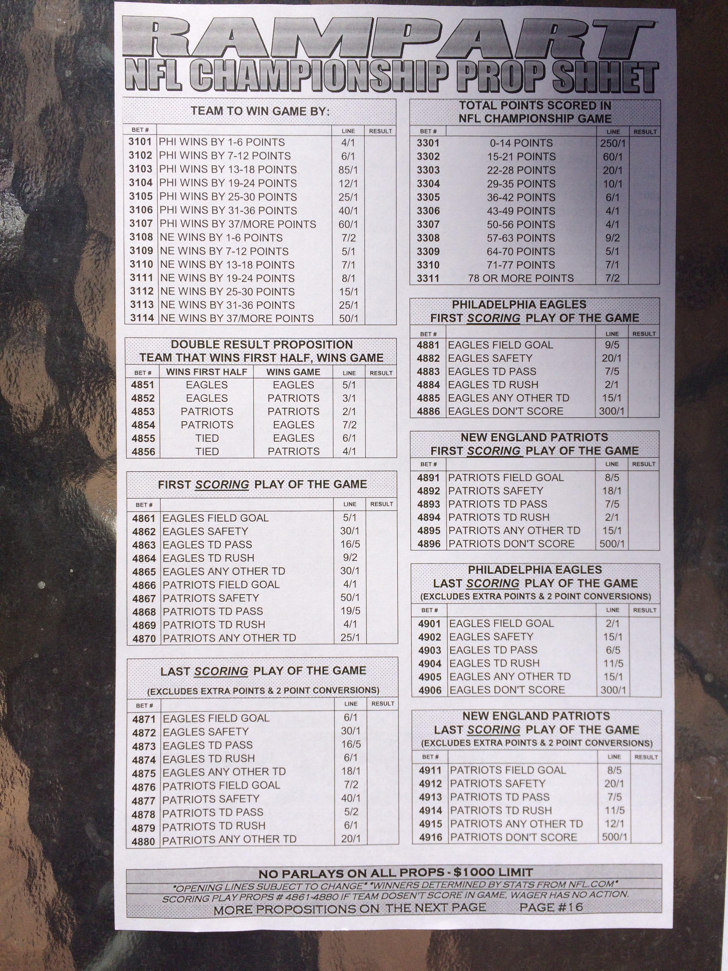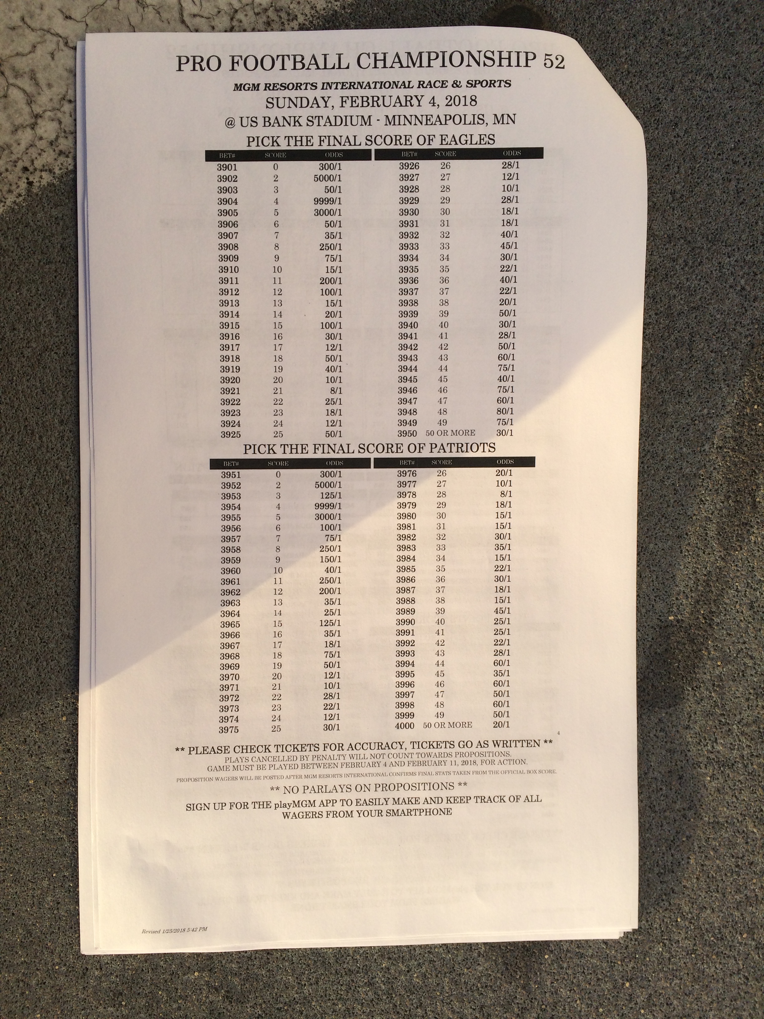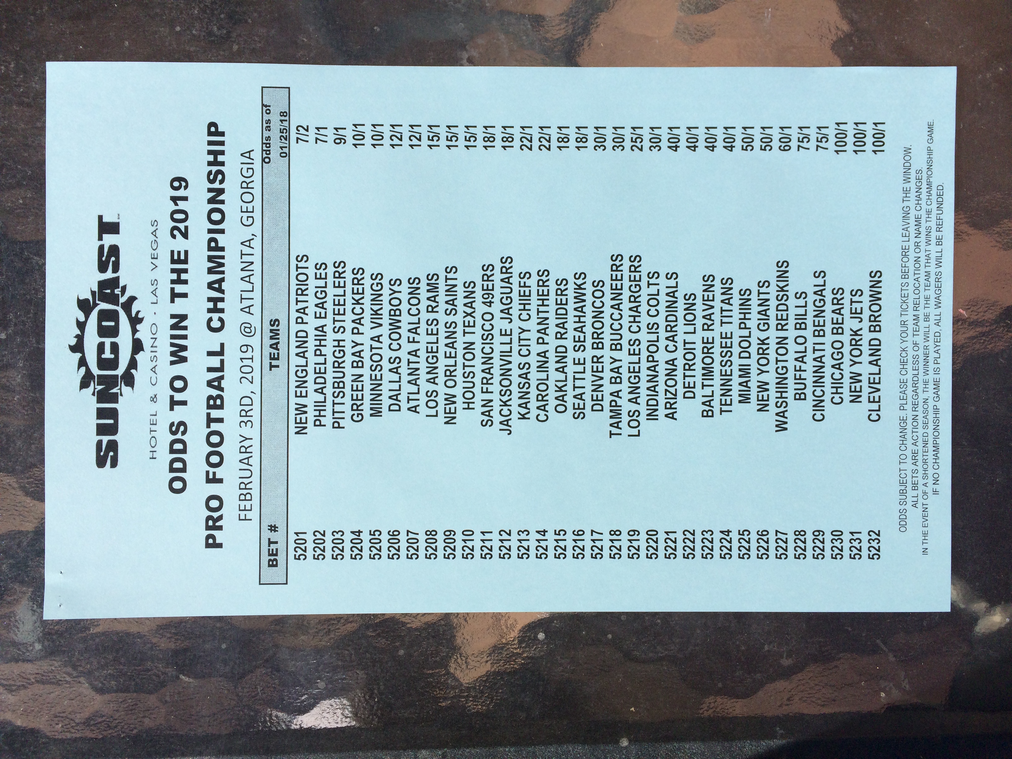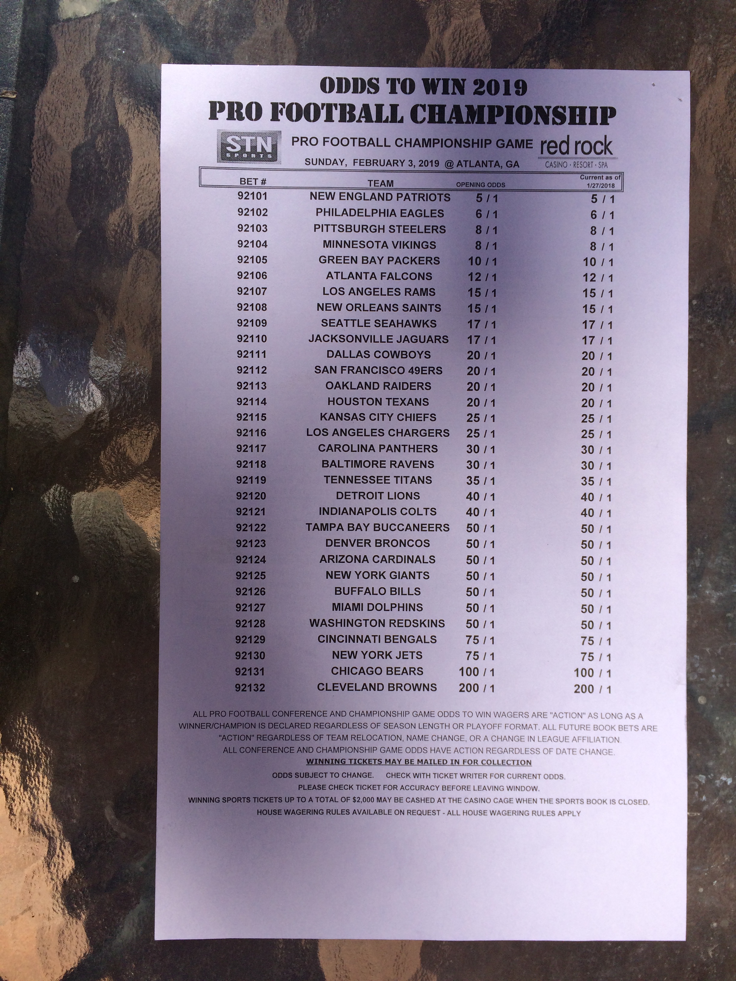 以下是拉斯維加斯幾家體育博彩公司每頁投注單的圖片。這些表格收集於2018年1月27日,即比賽開始前八天。