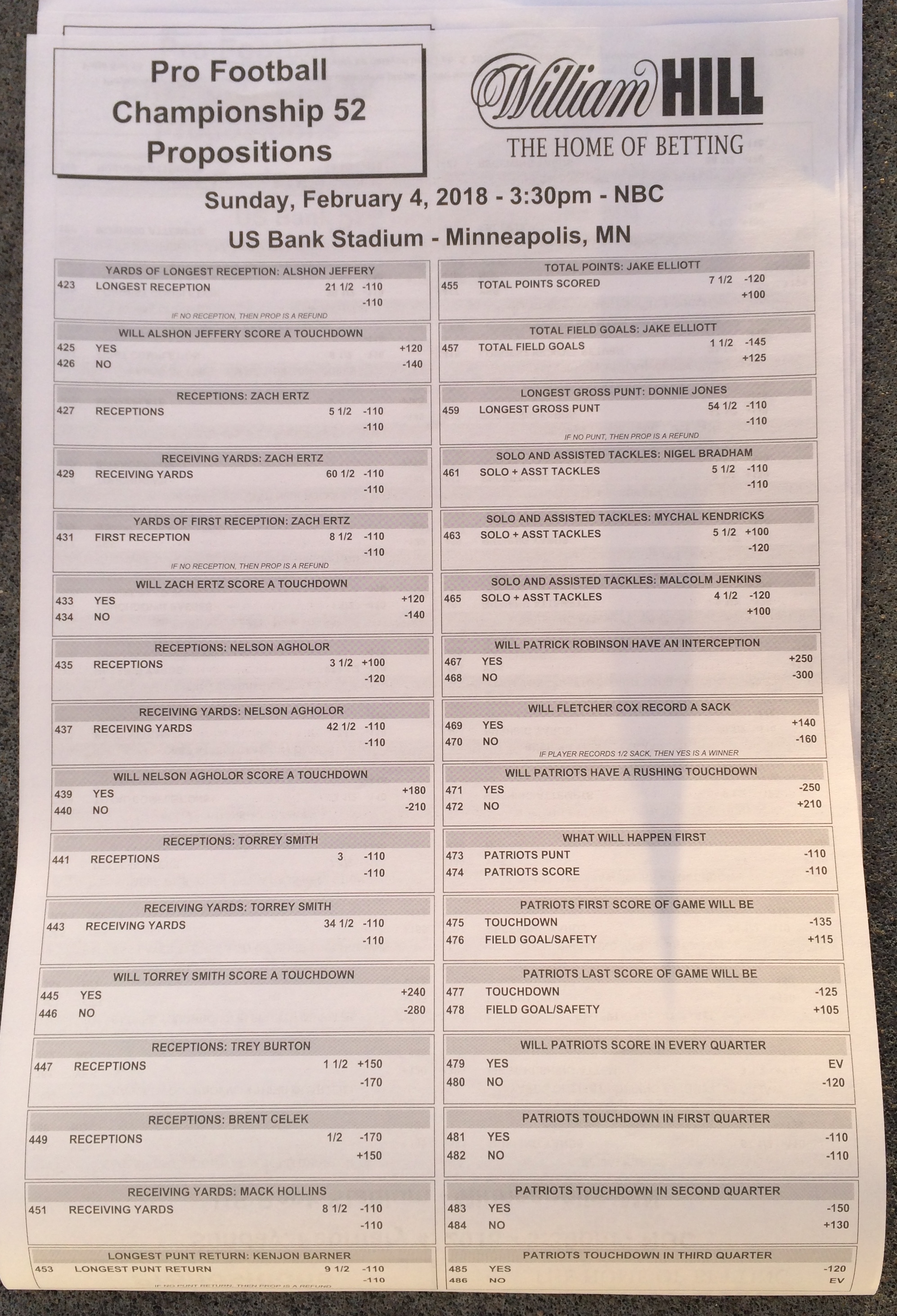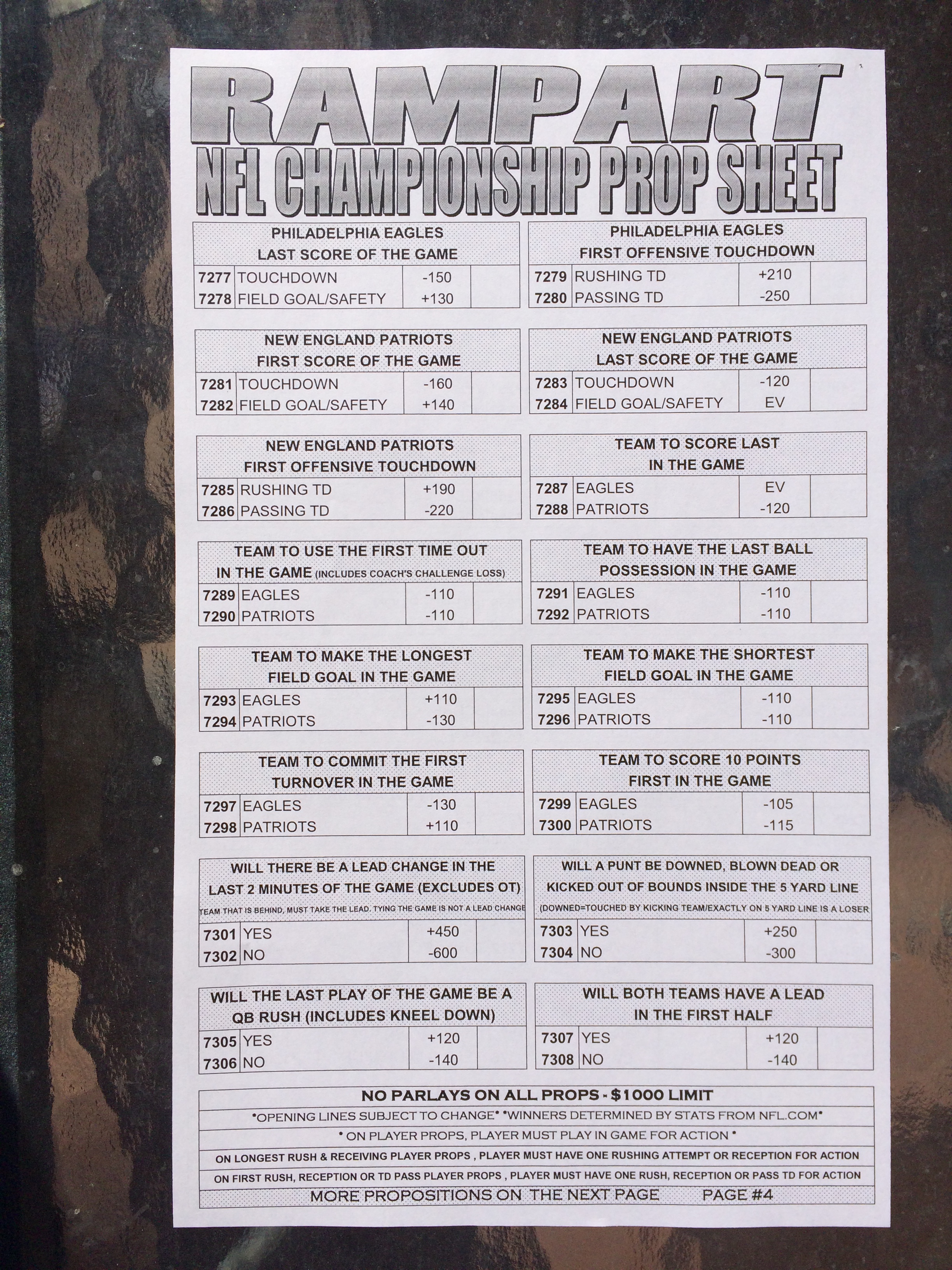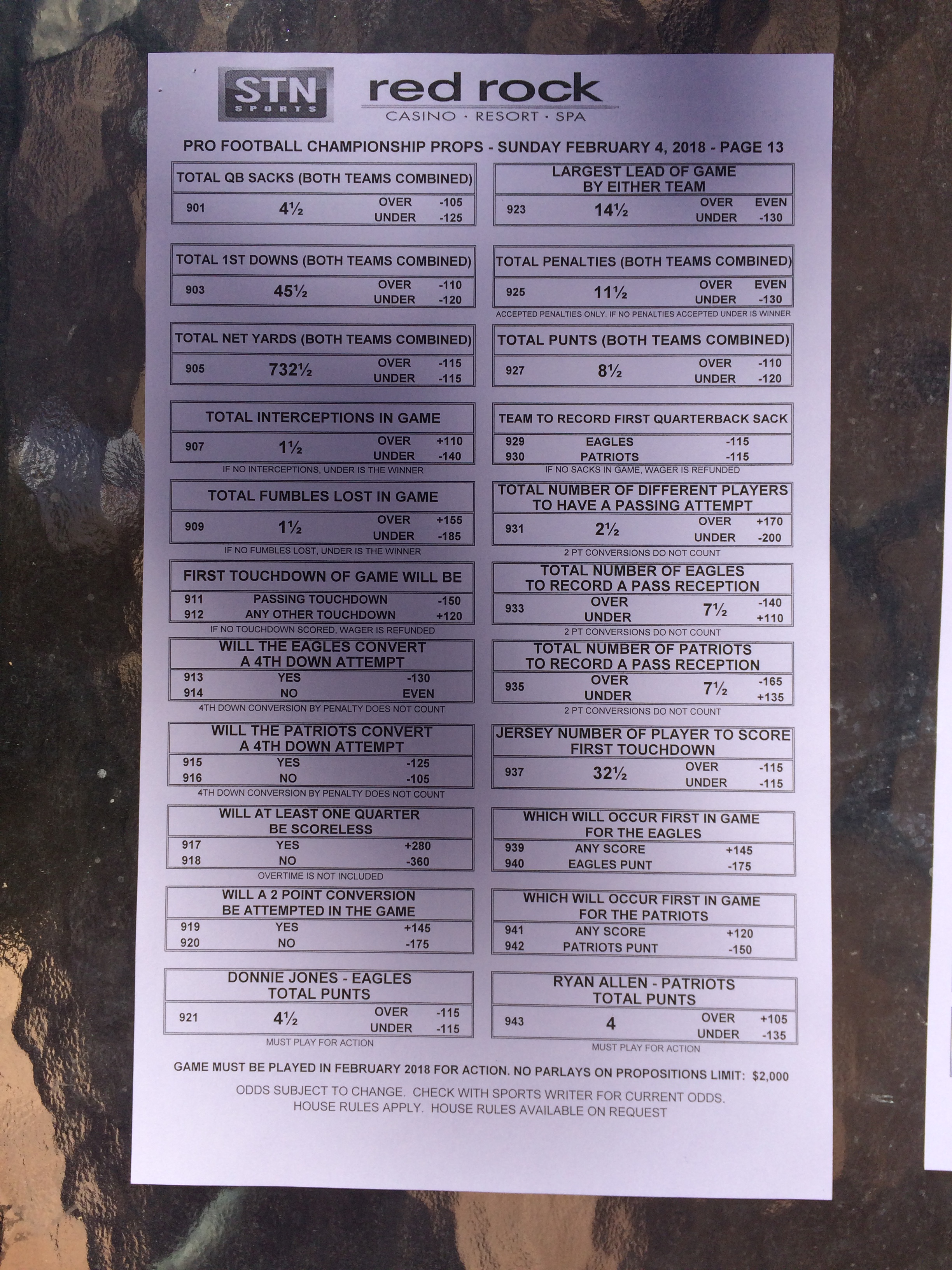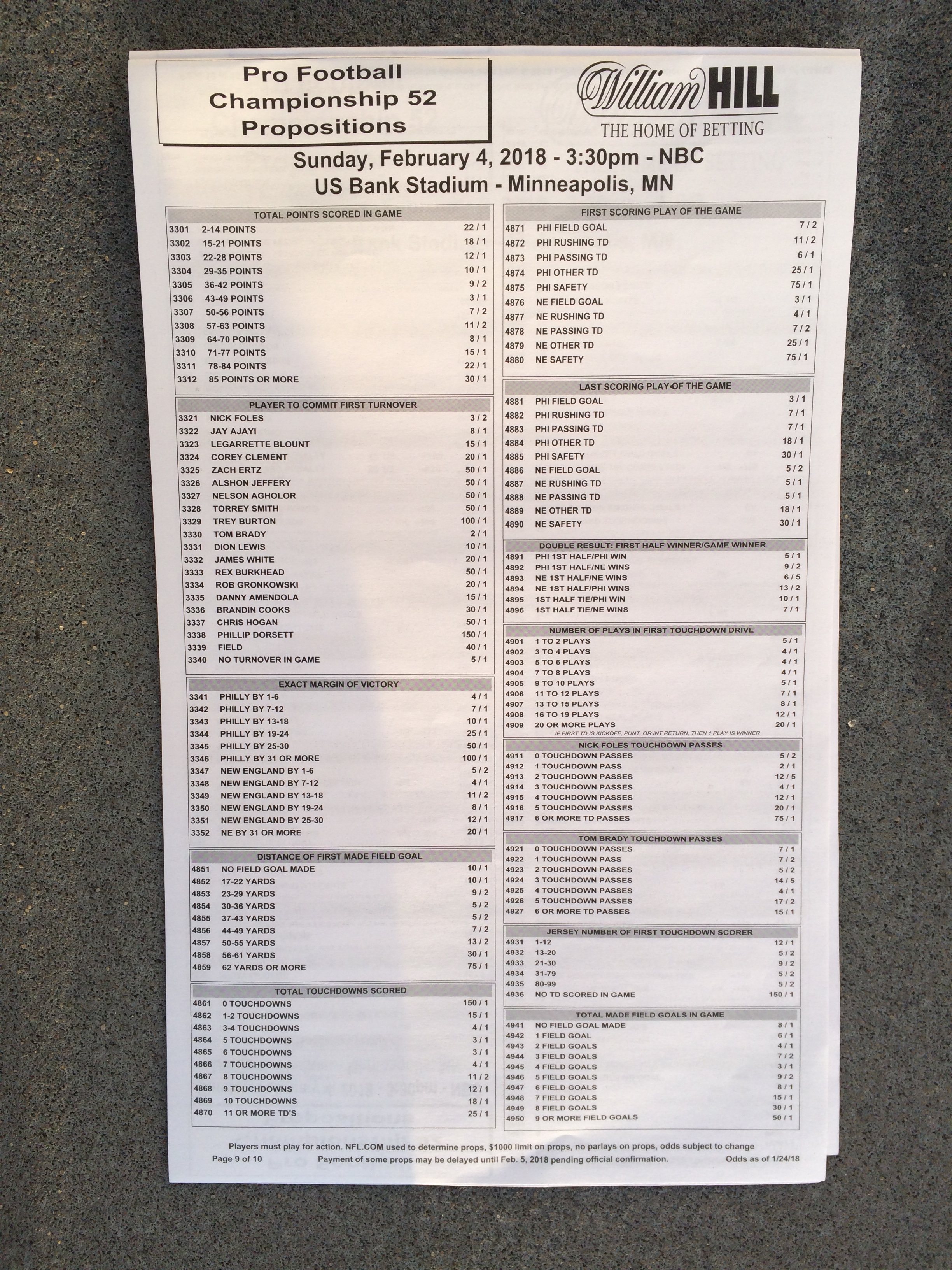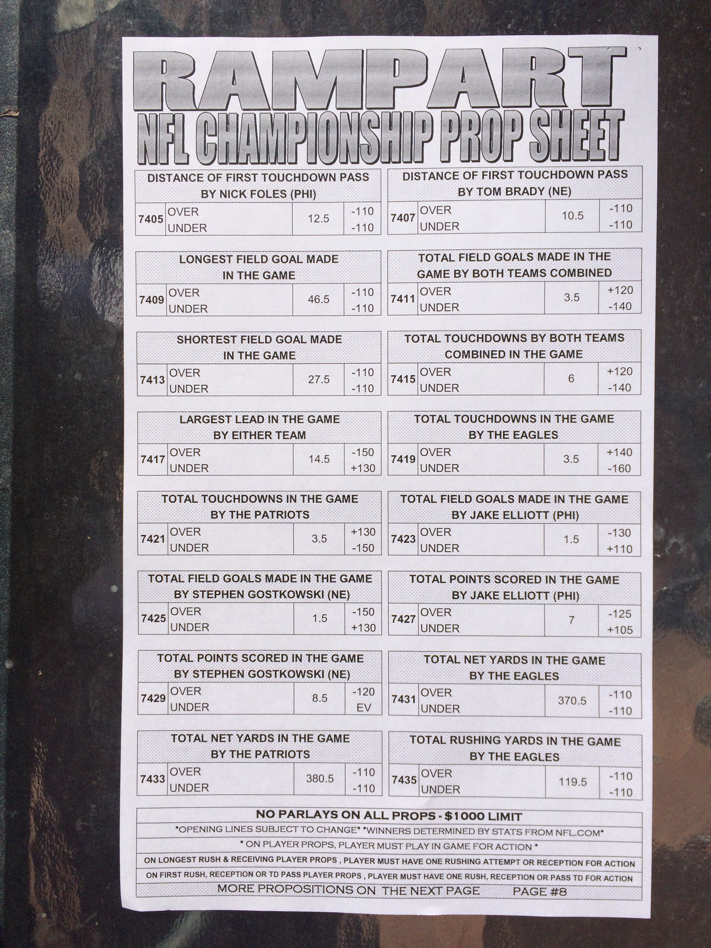 以下是拉斯維加斯幾家體育博彩公司每頁投注單的圖片。這些表格收集於2018年1月27日,即比賽開始前八天。