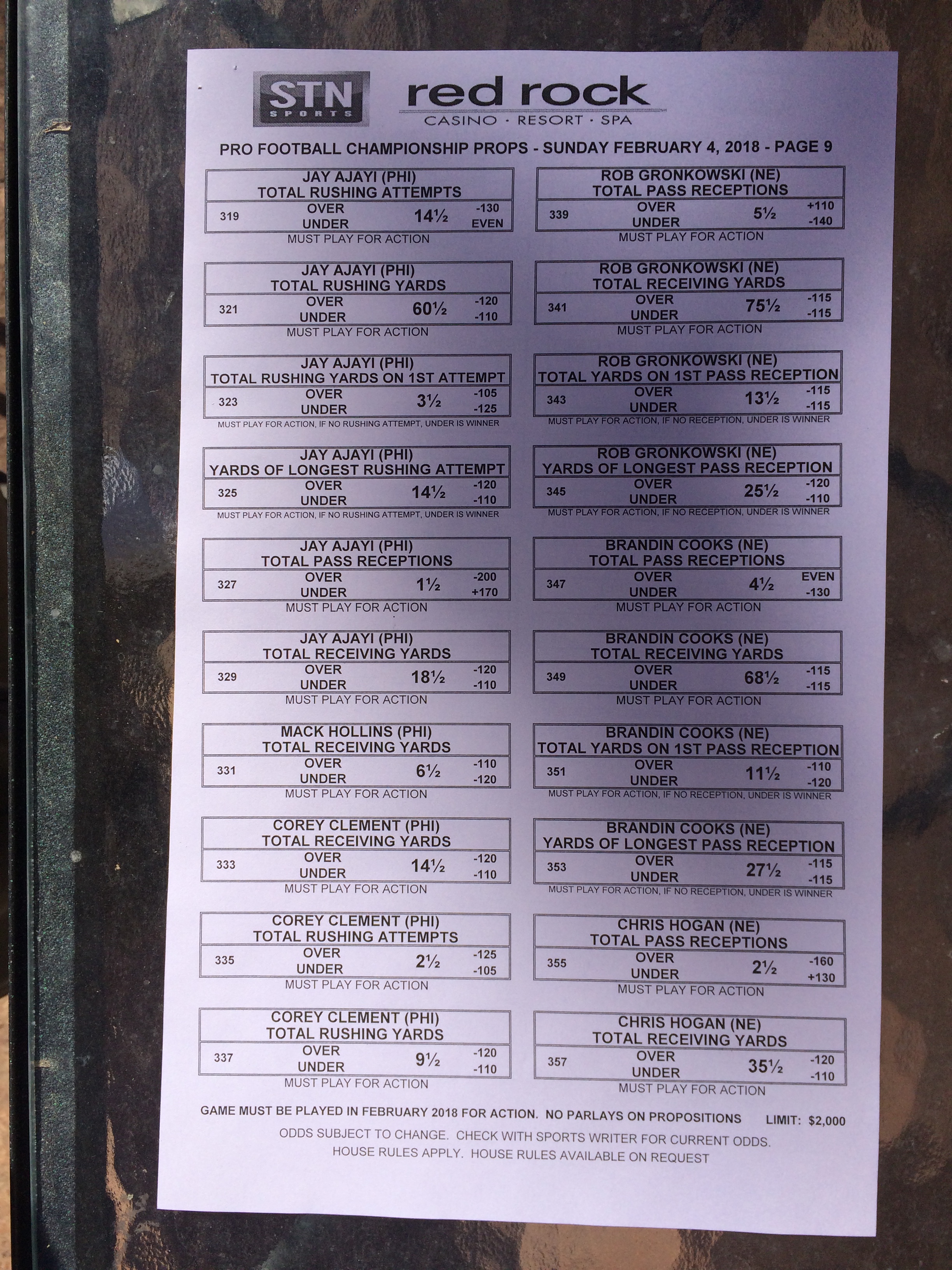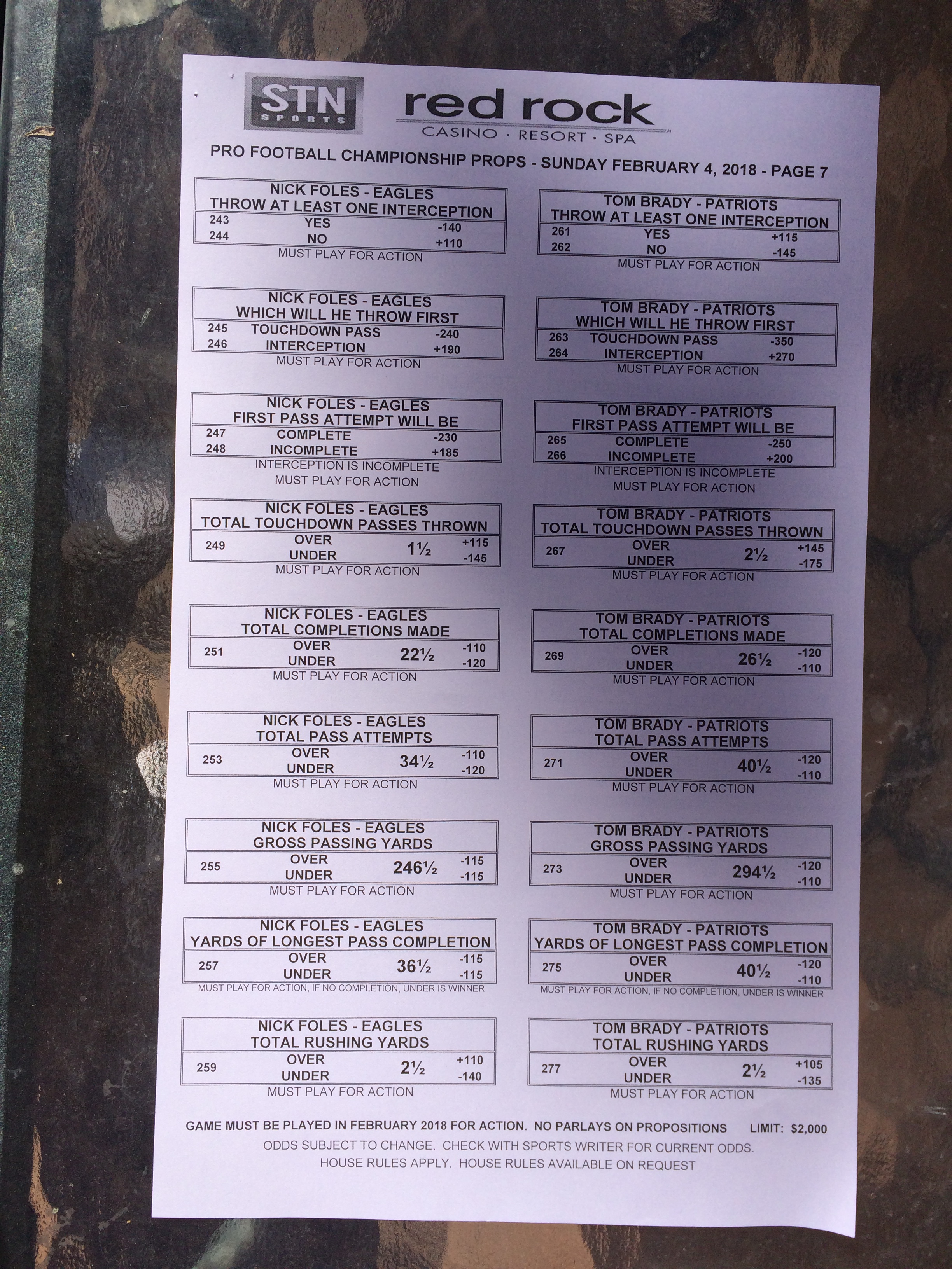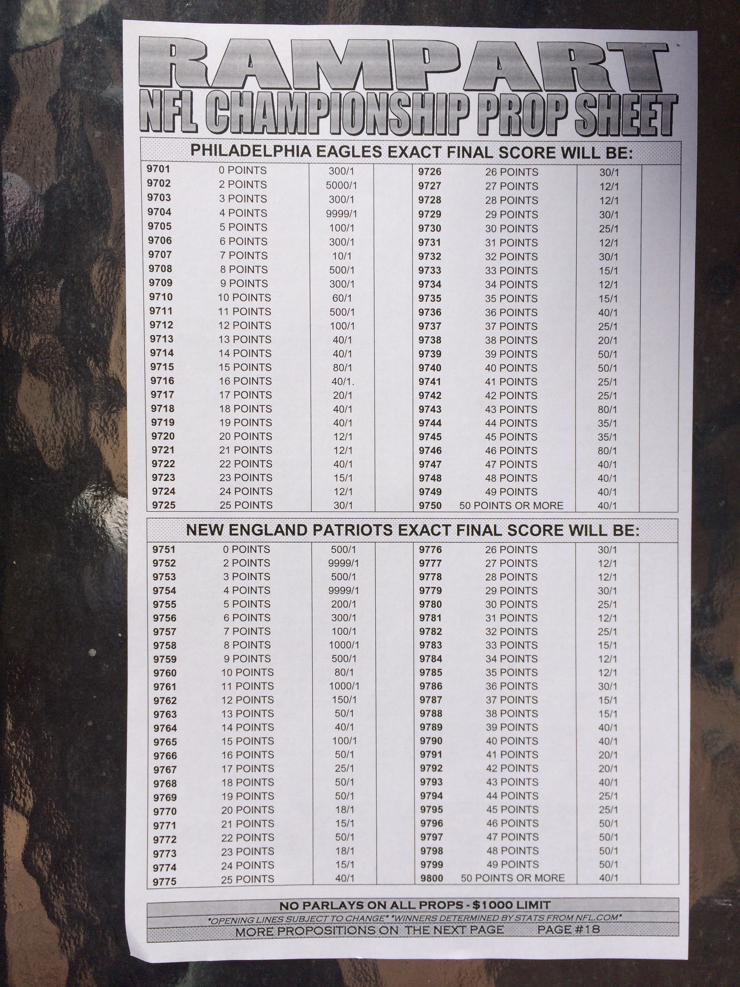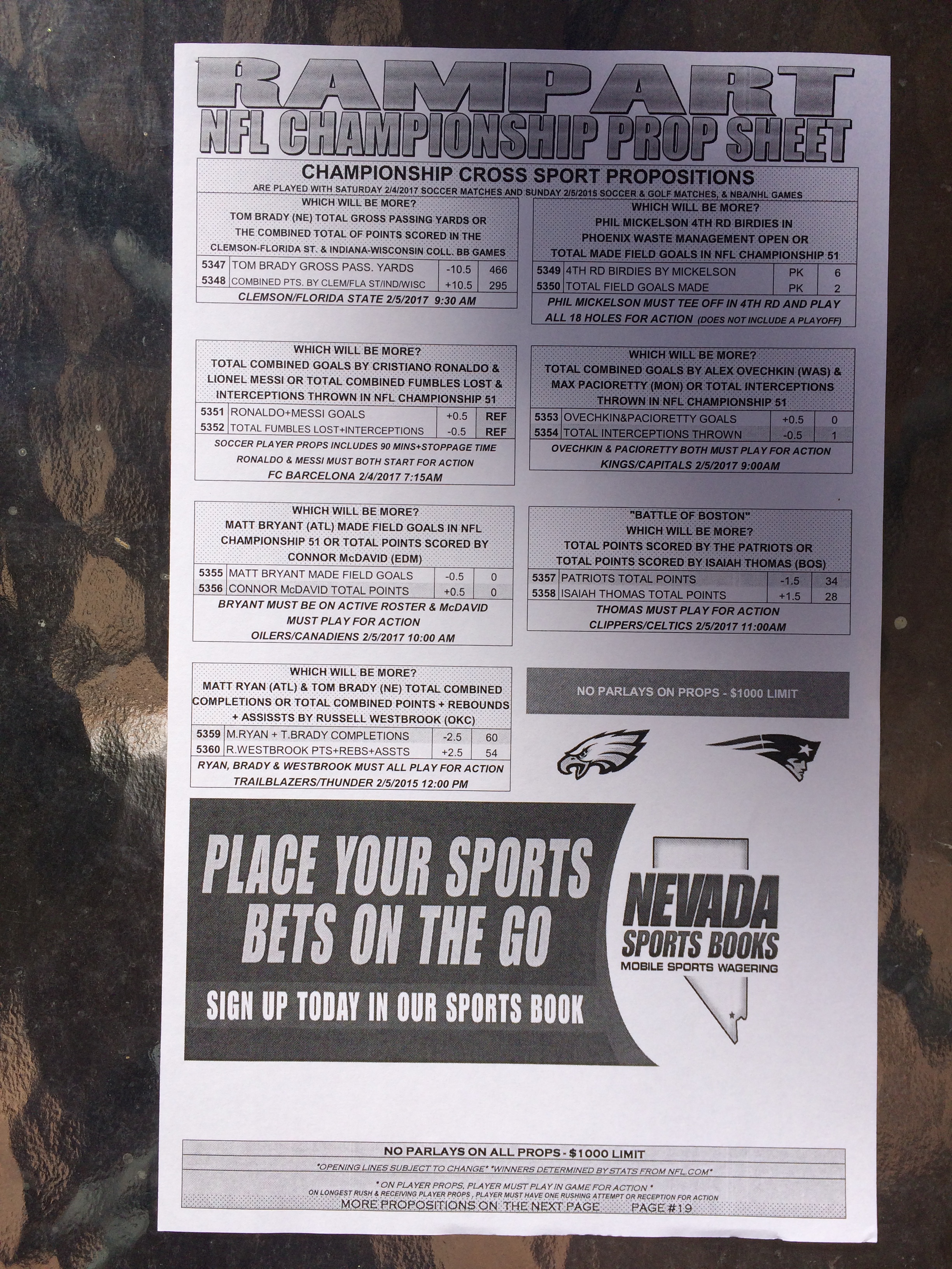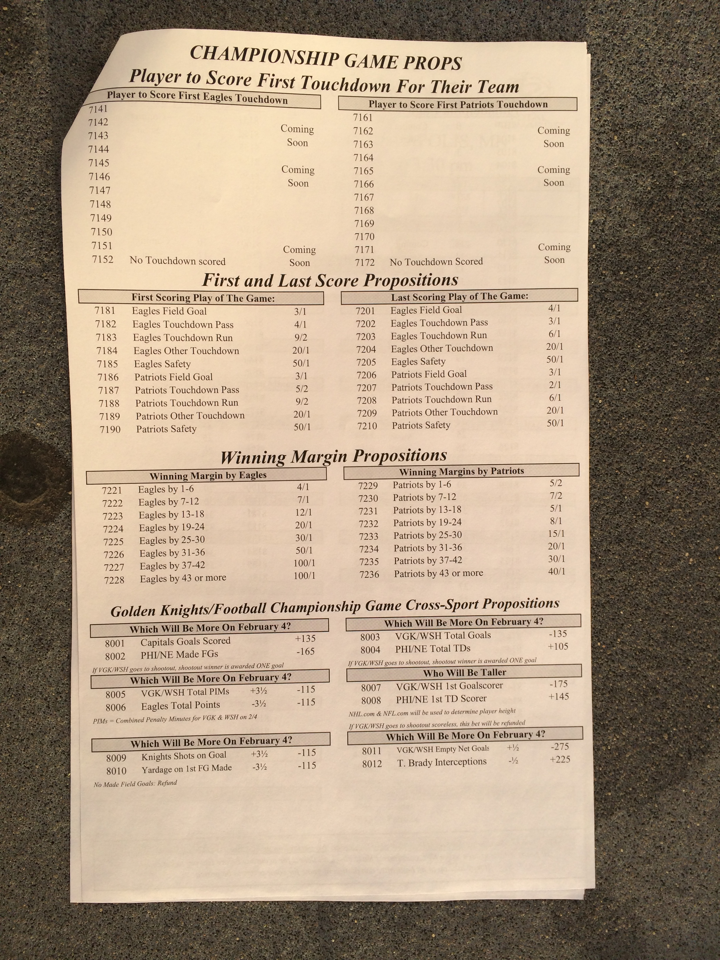 以下是拉斯維加斯幾家體育博彩公司每頁投注單的圖片。這些表格收集於2018年1月27日,即比賽開始前八天。