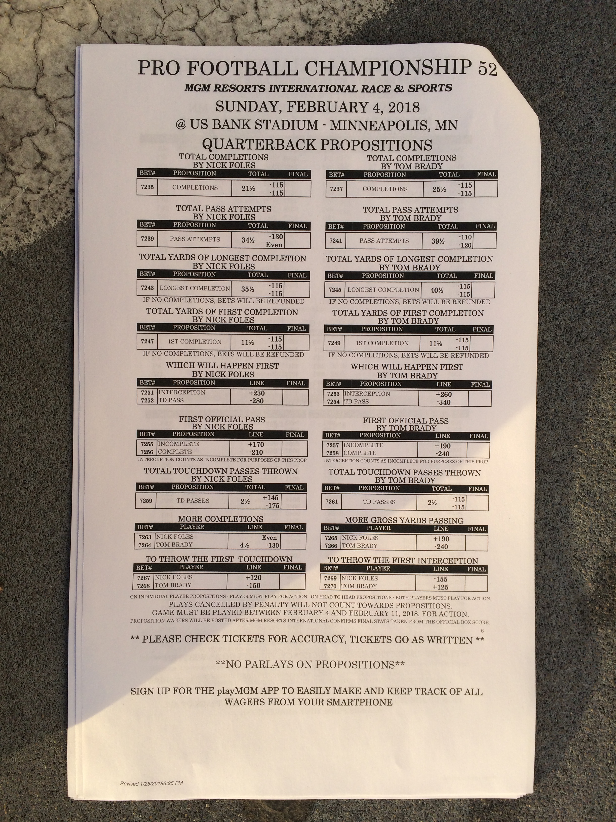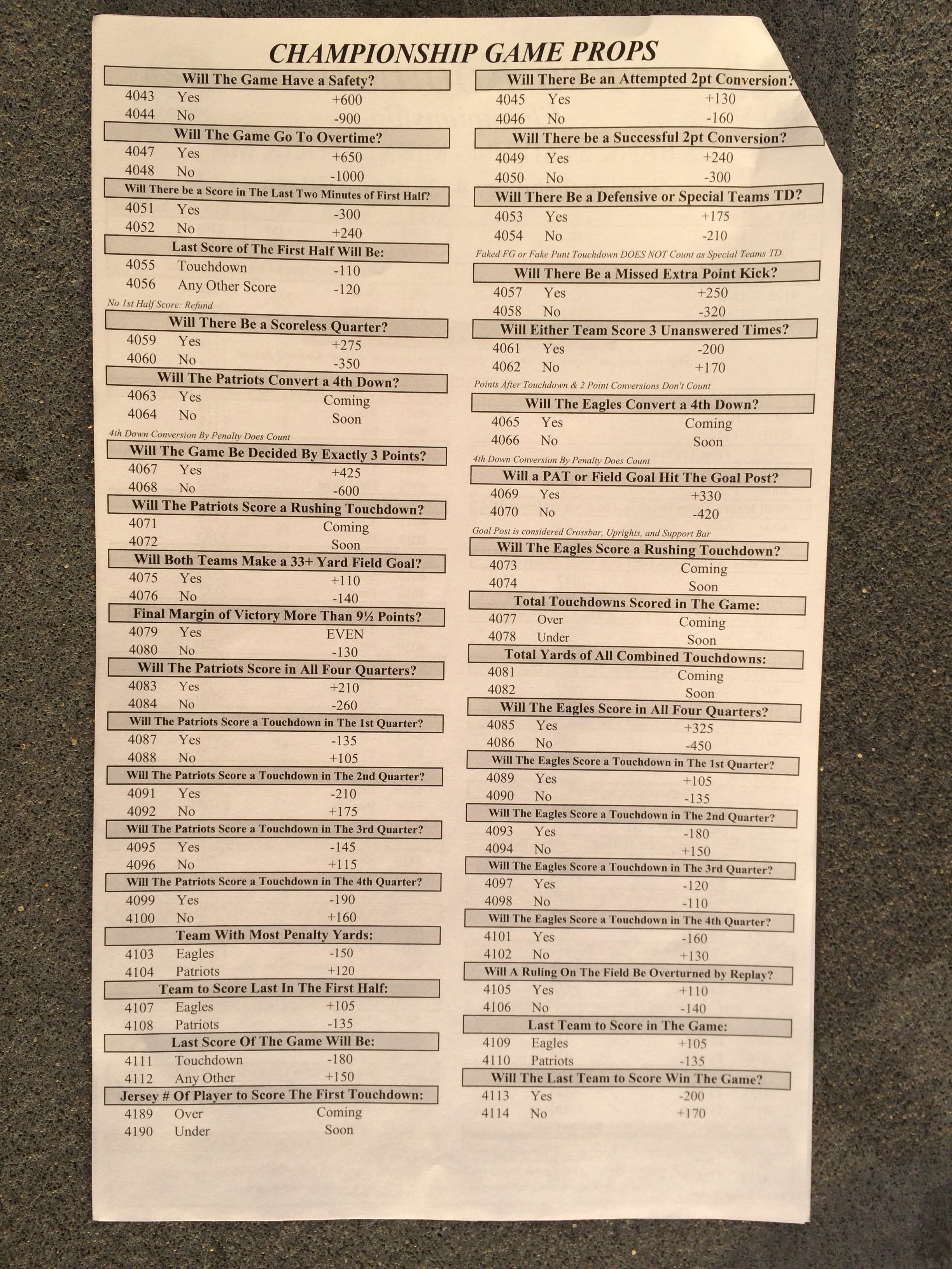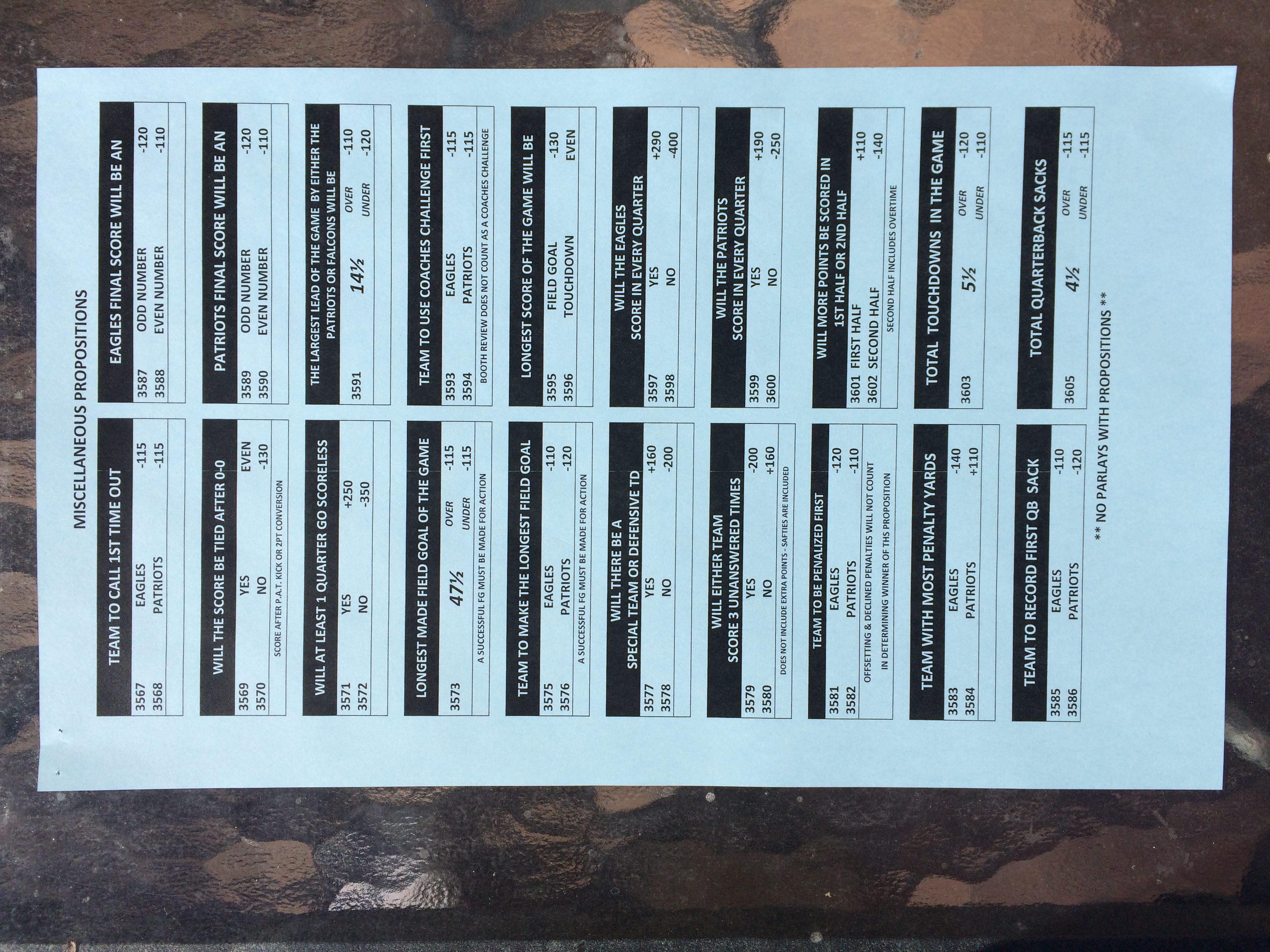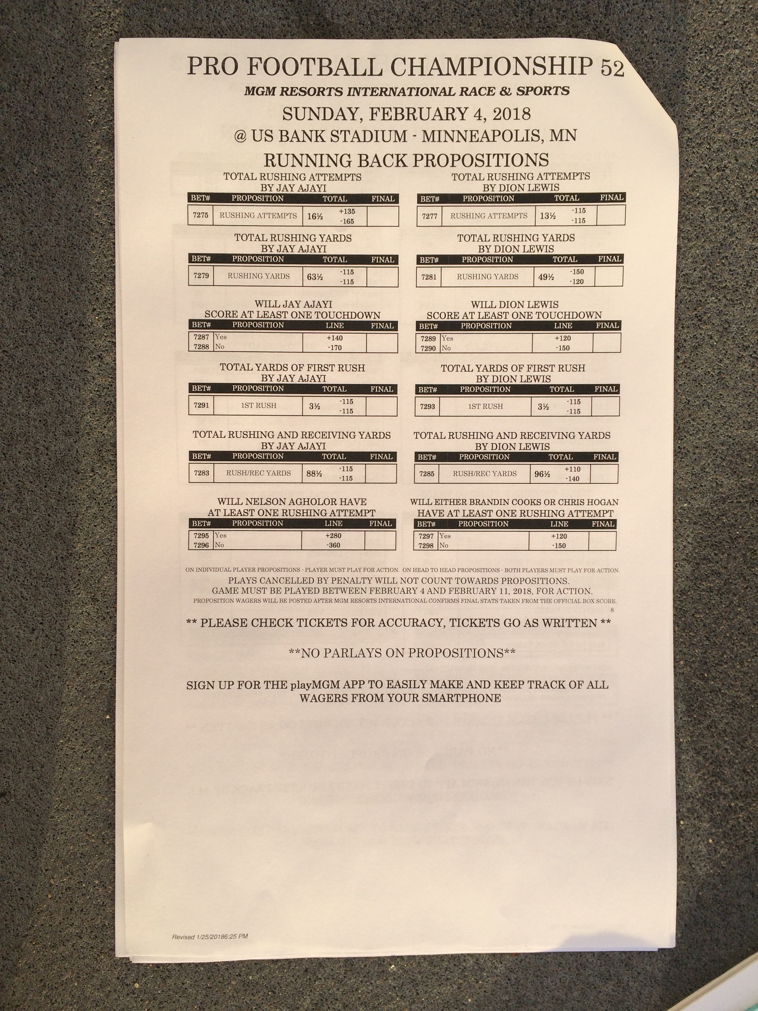 以下是拉斯維加斯幾家體育博彩公司每頁投注單的圖片。這些表格收集於2018年1月27日,即比賽開始前八天。