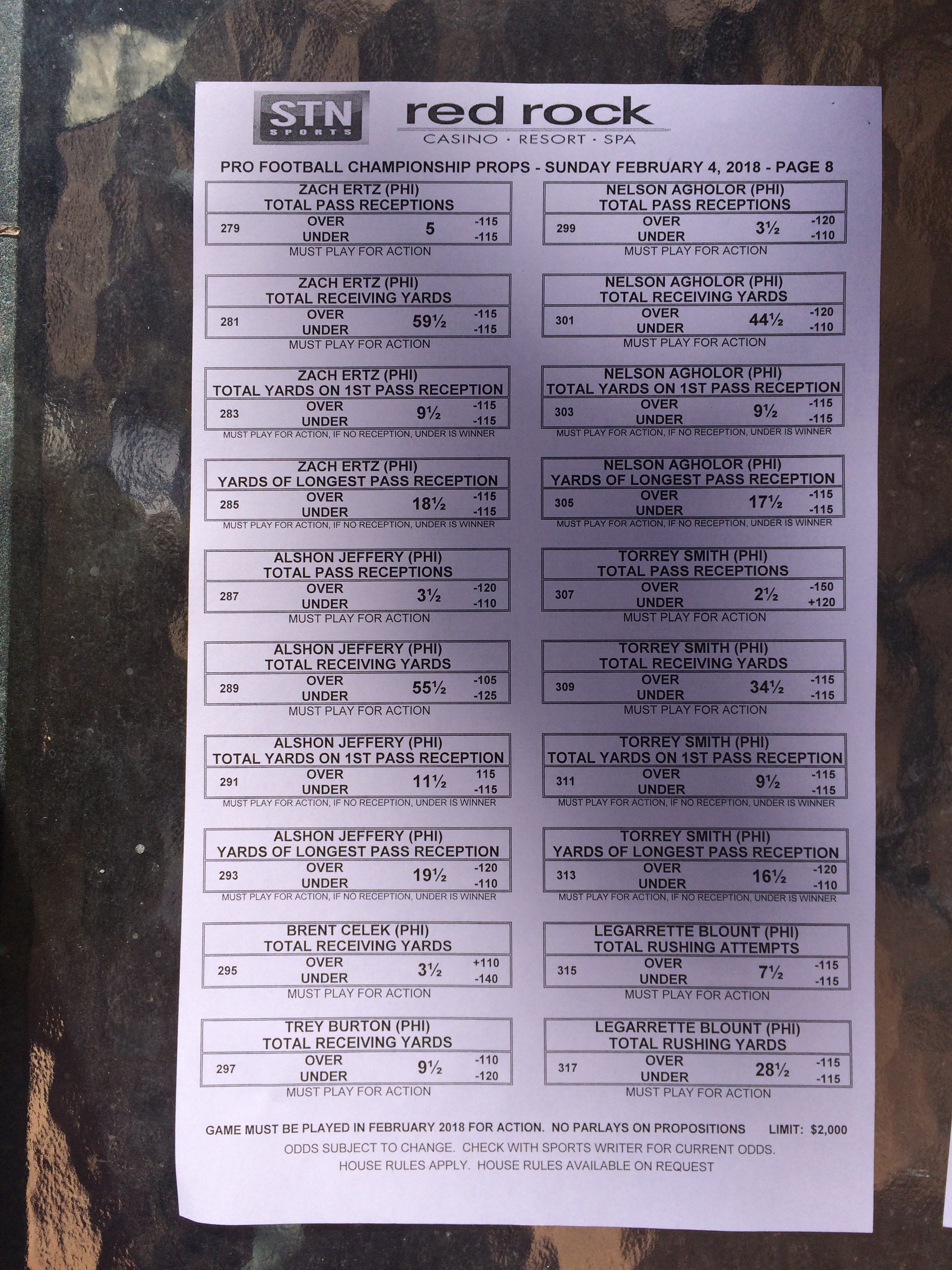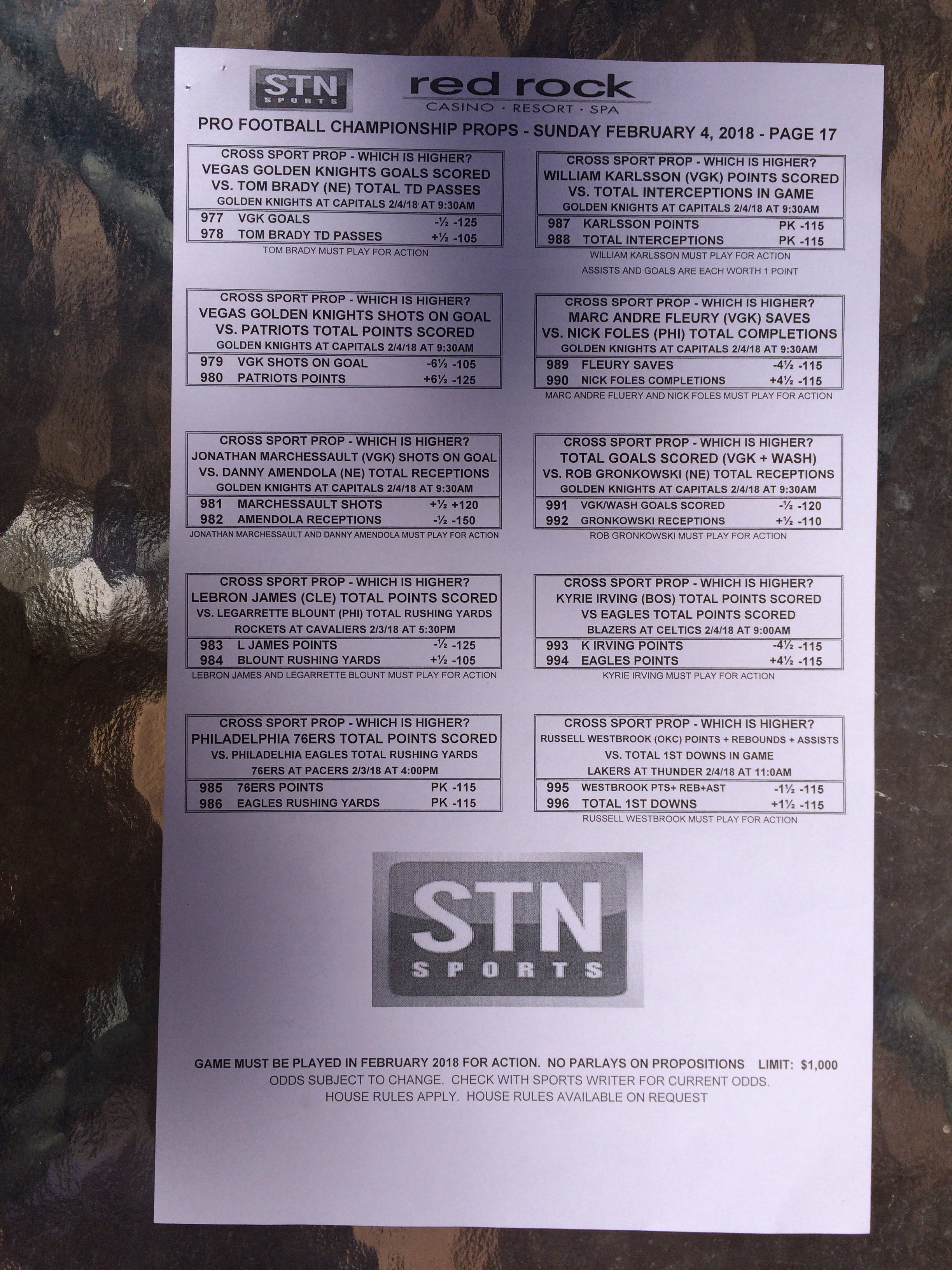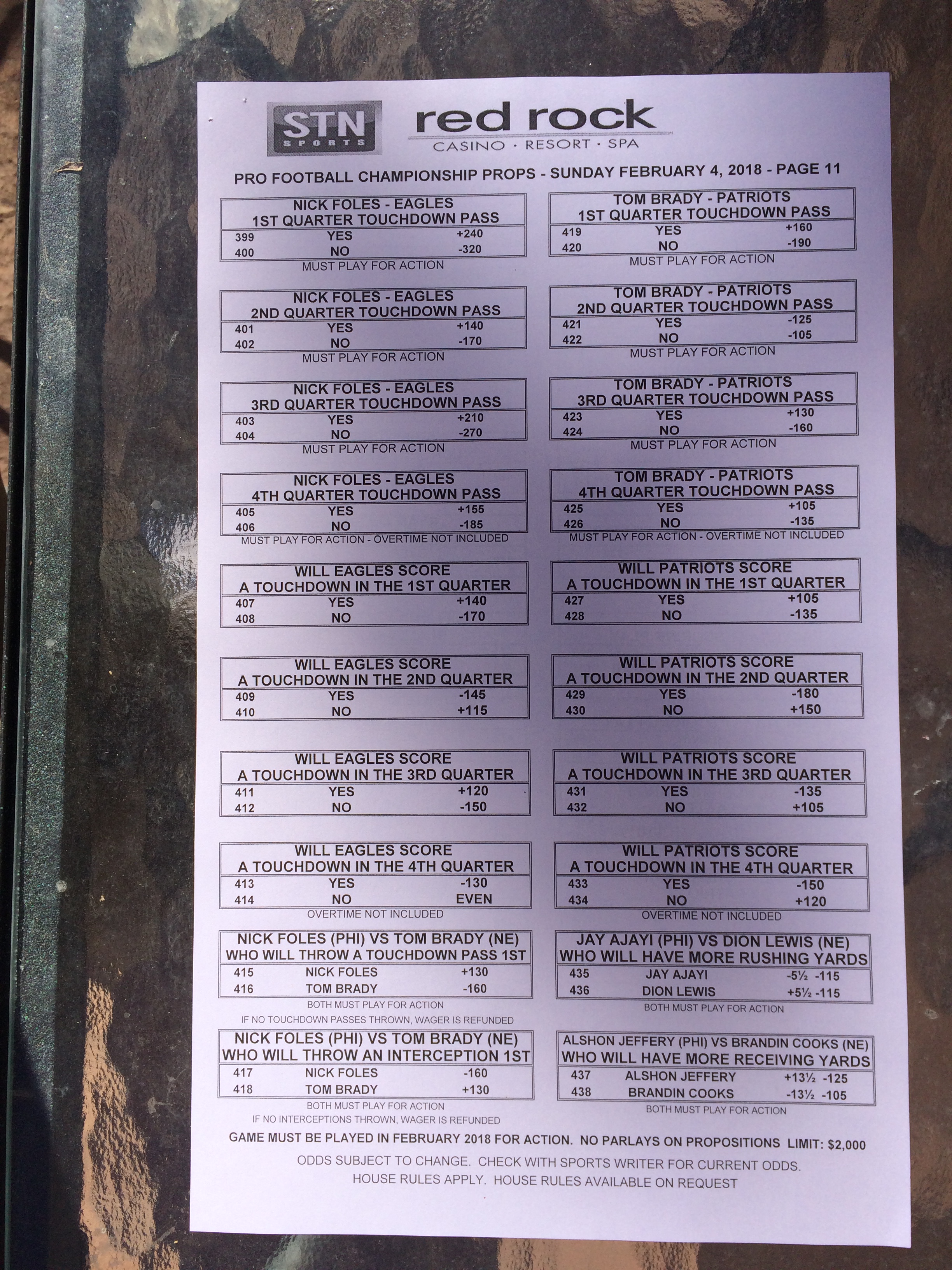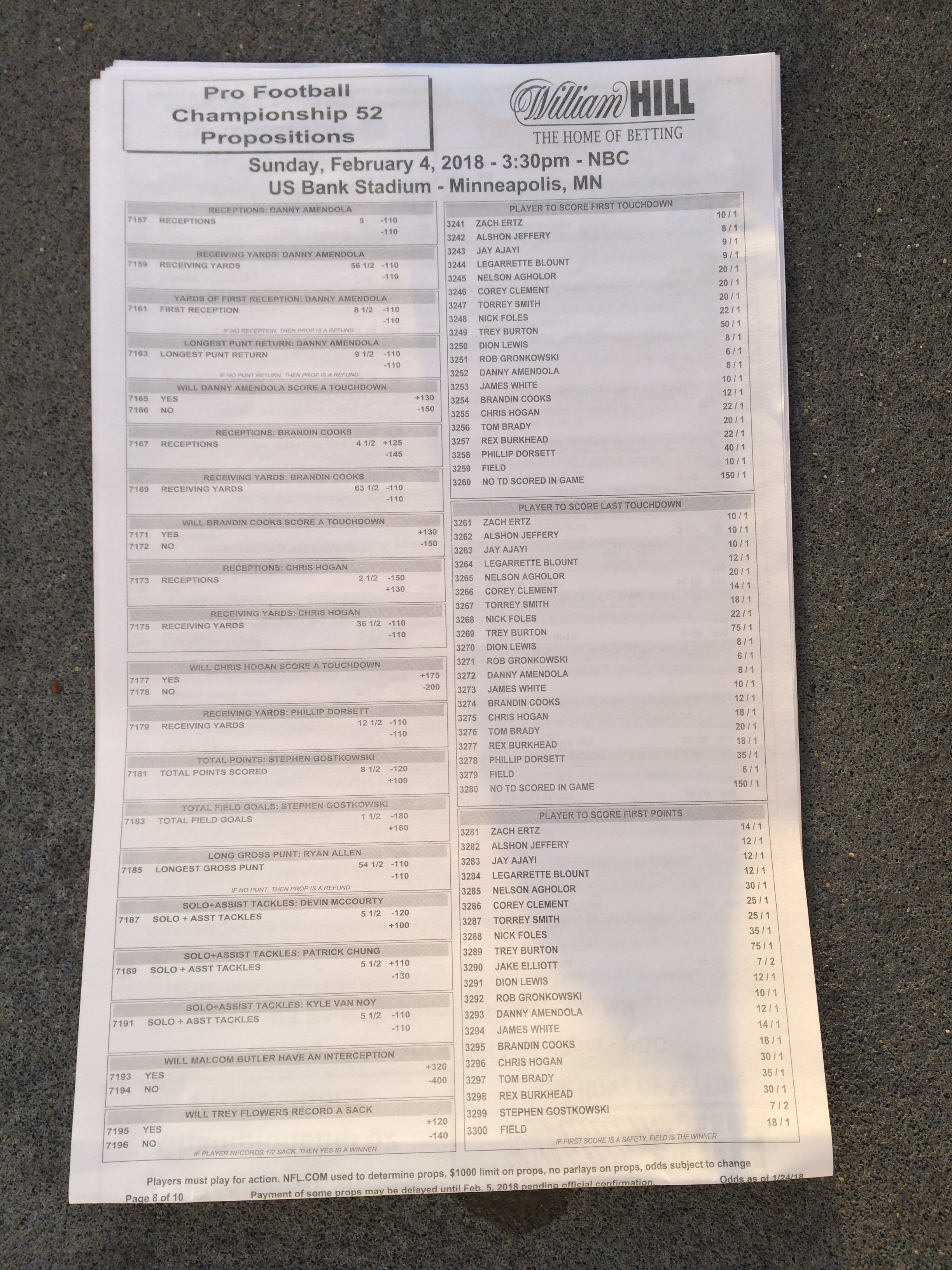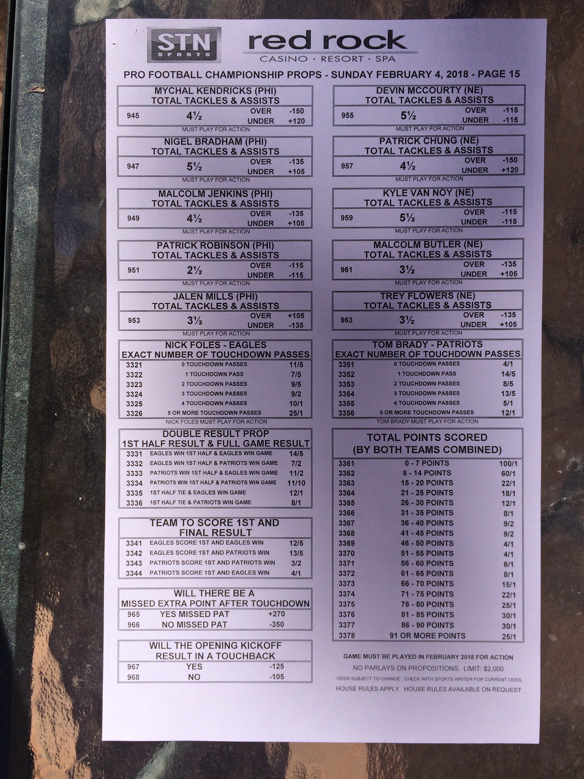 以下是拉斯維加斯幾家體育博彩公司每頁投注單的圖片。這些表格收集於2018年1月27日,即比賽開始前八天。