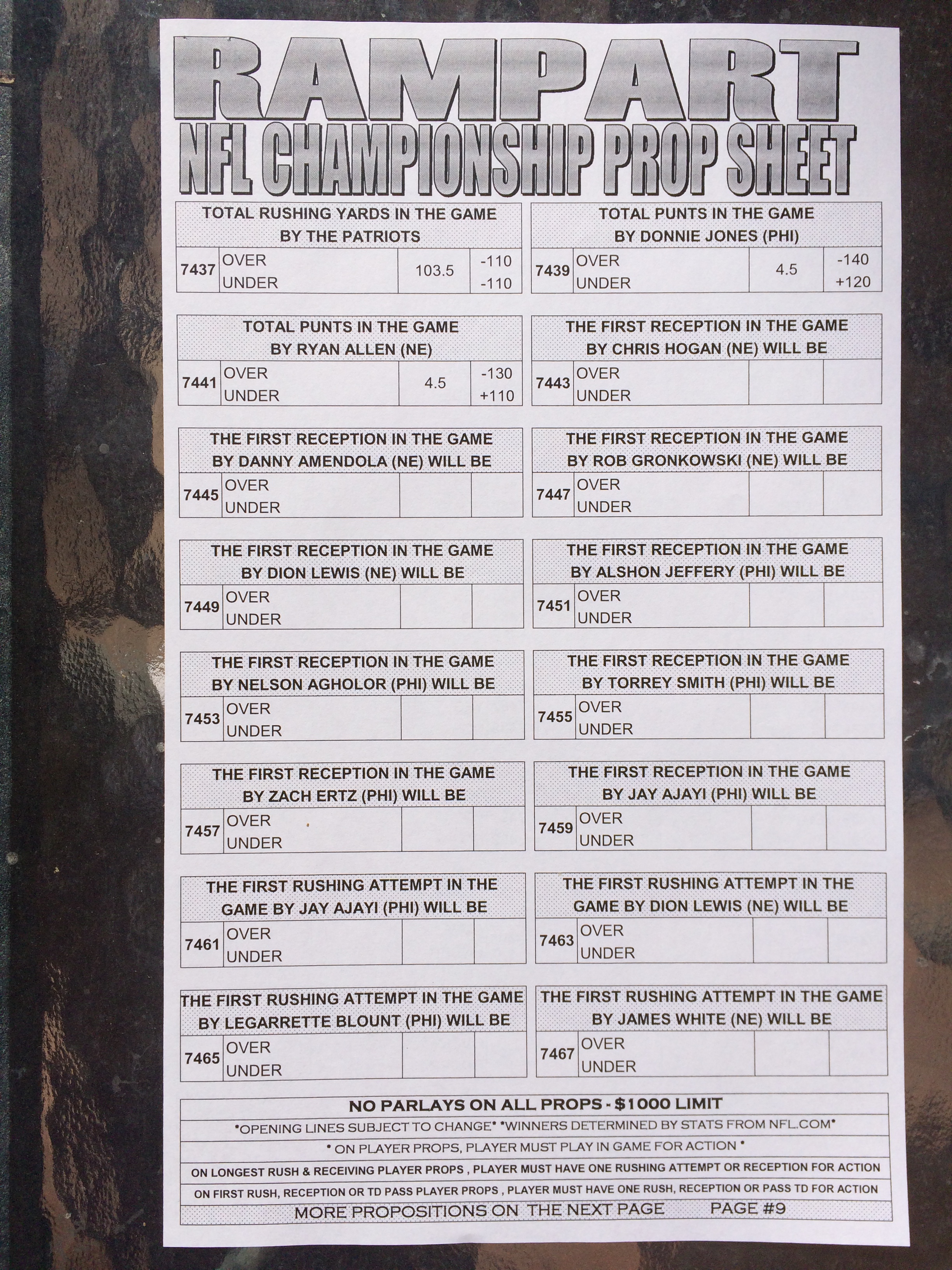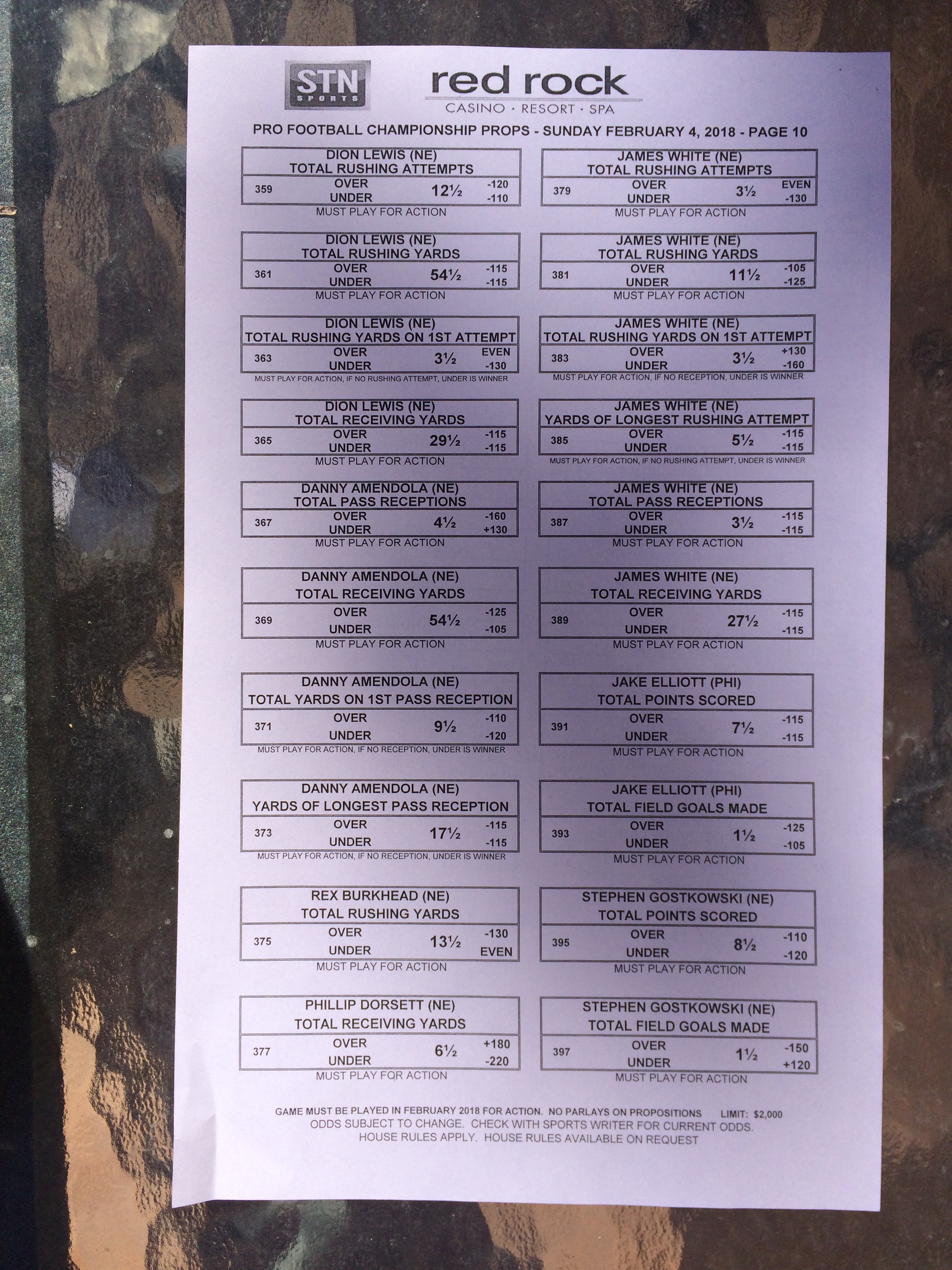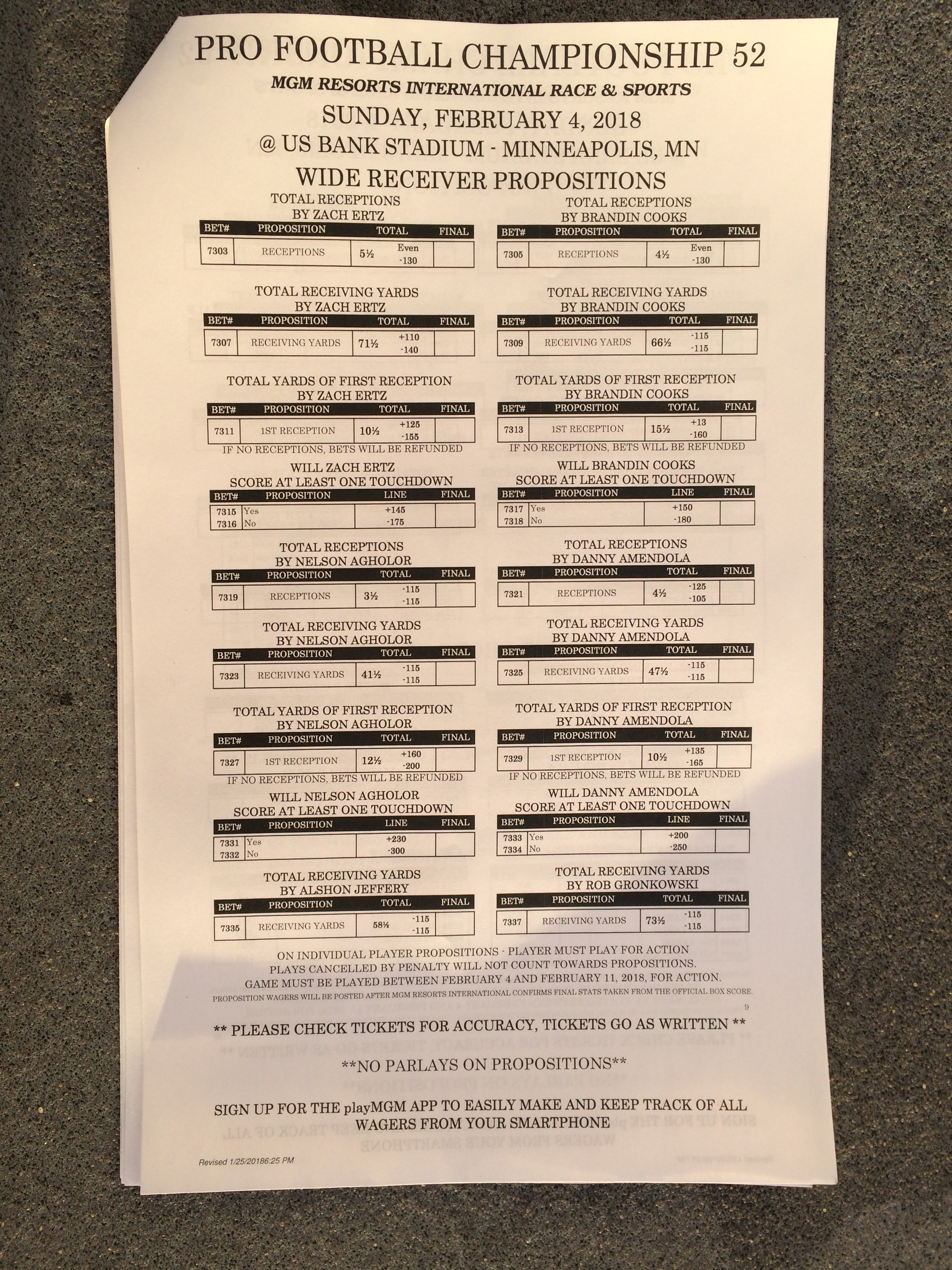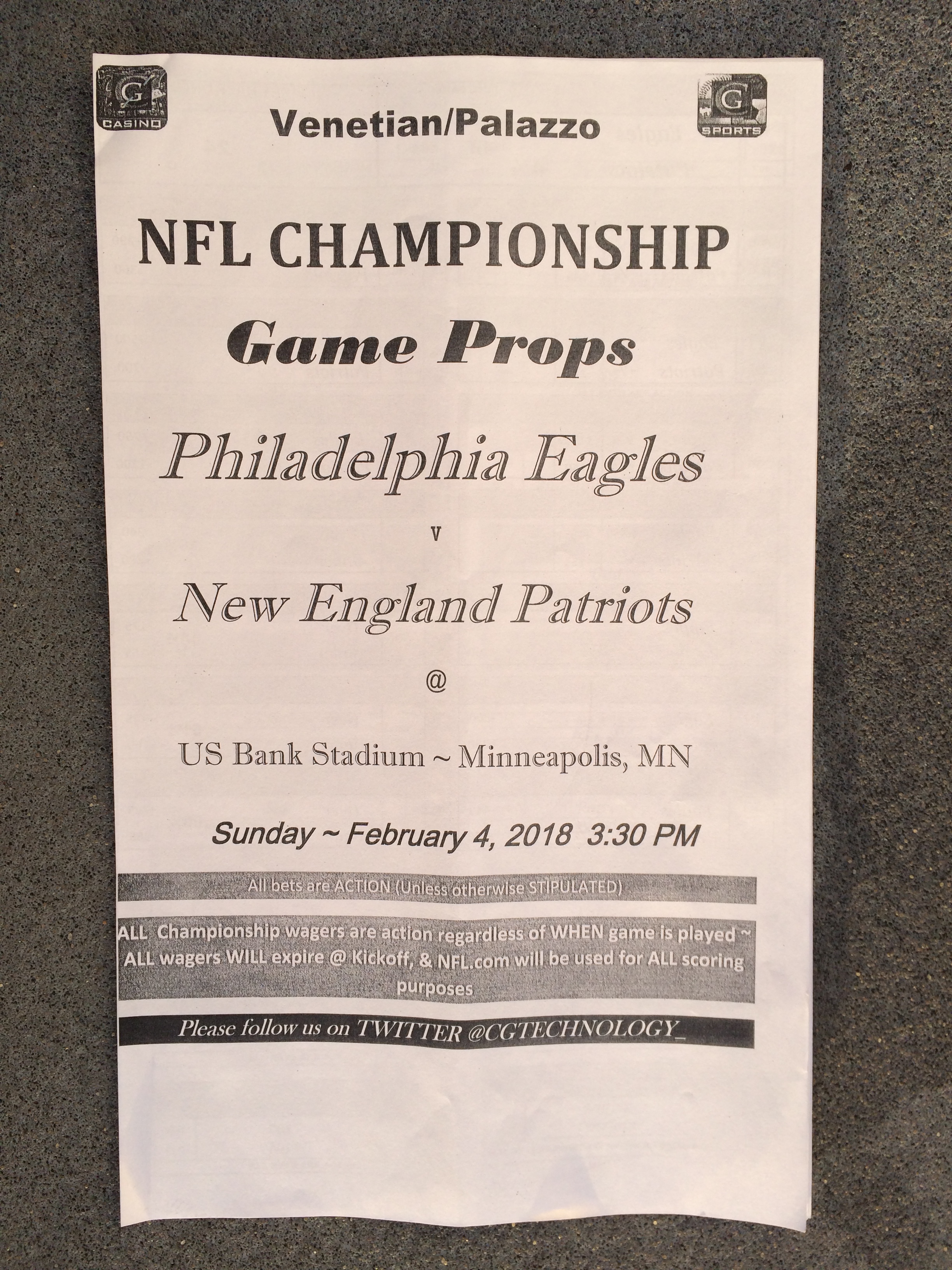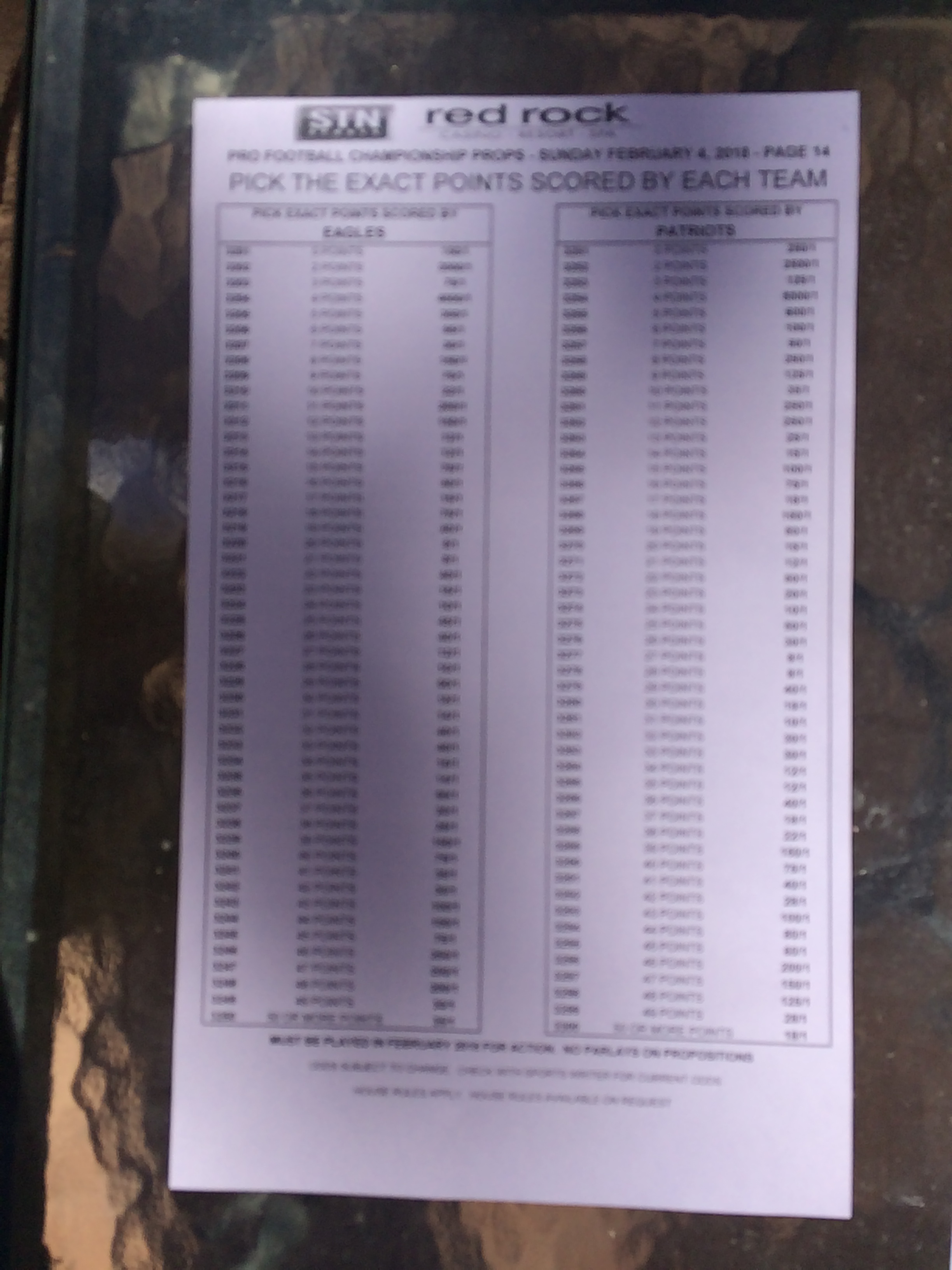 以下是拉斯維加斯幾家體育博彩公司每頁投注單的圖片。這些表格收集於2018年1月27日,即比賽開始前八天。
