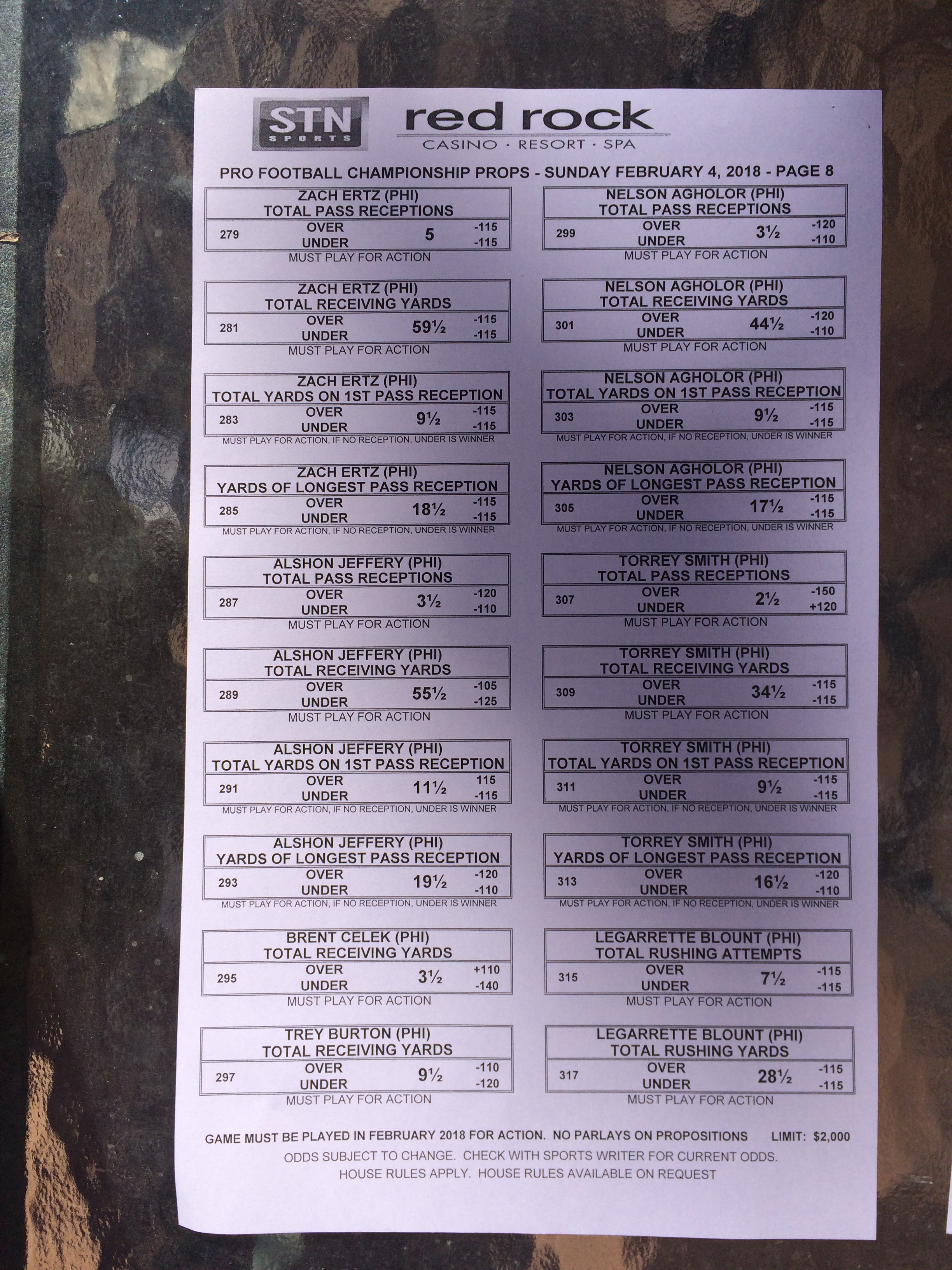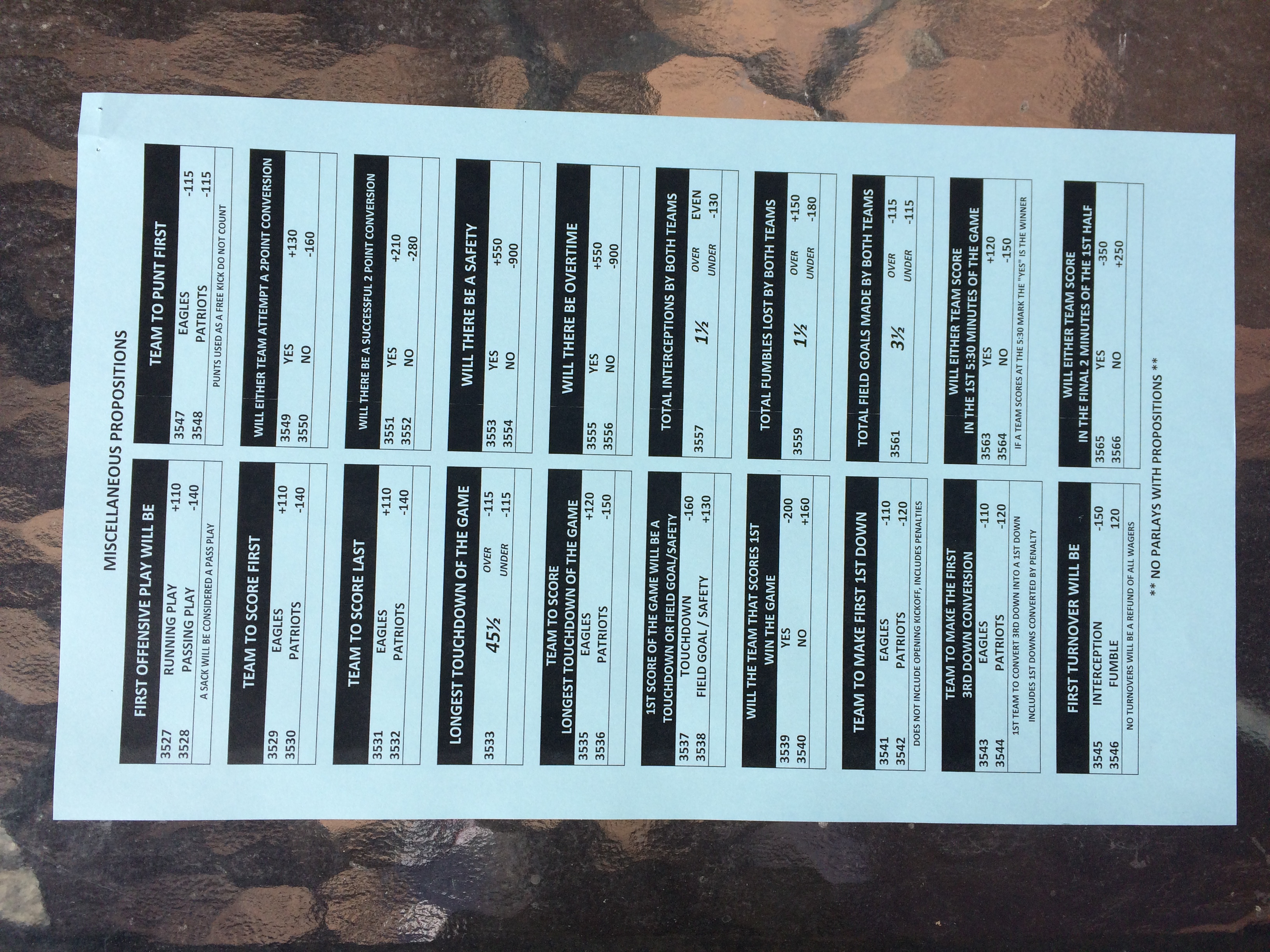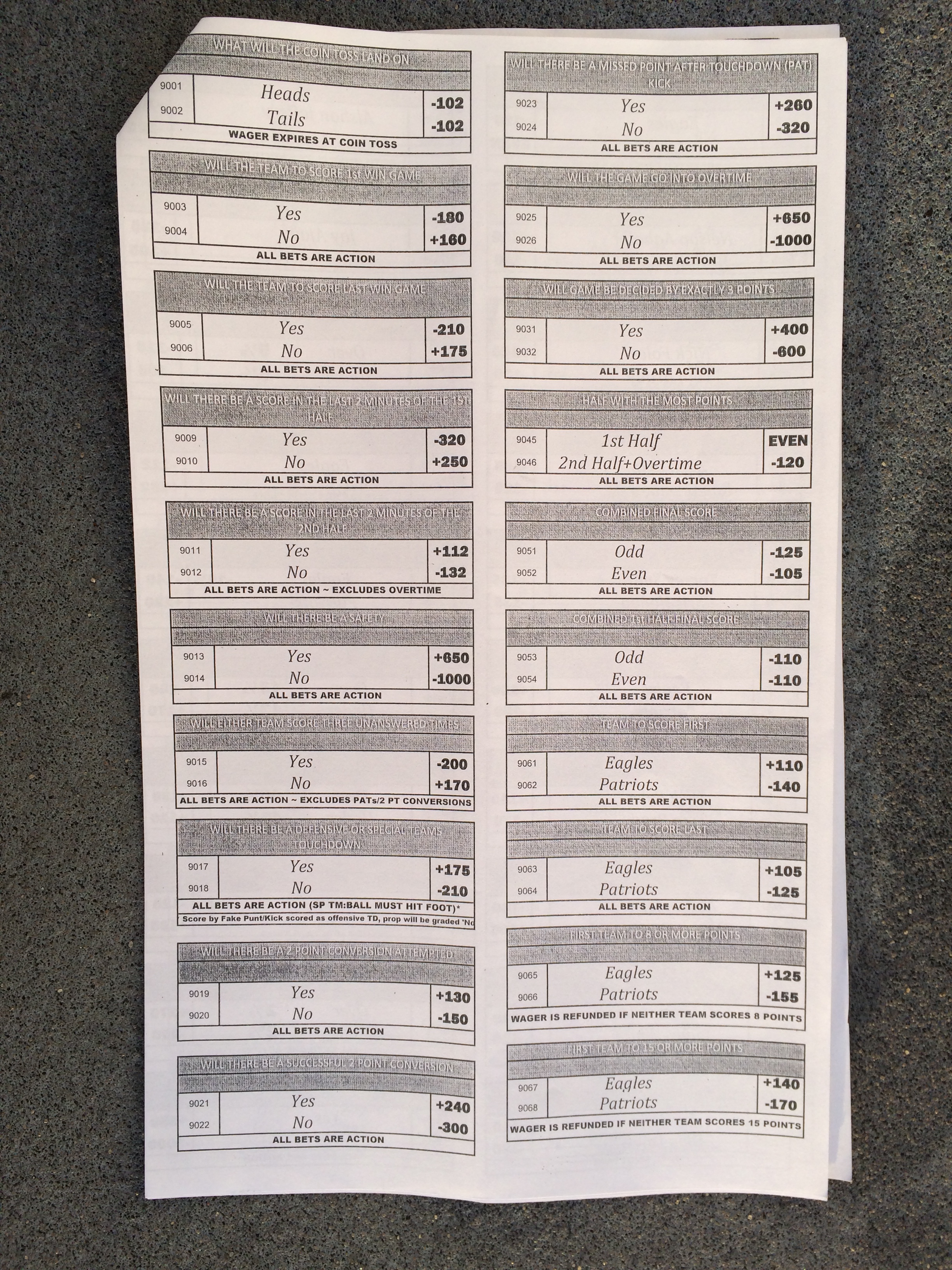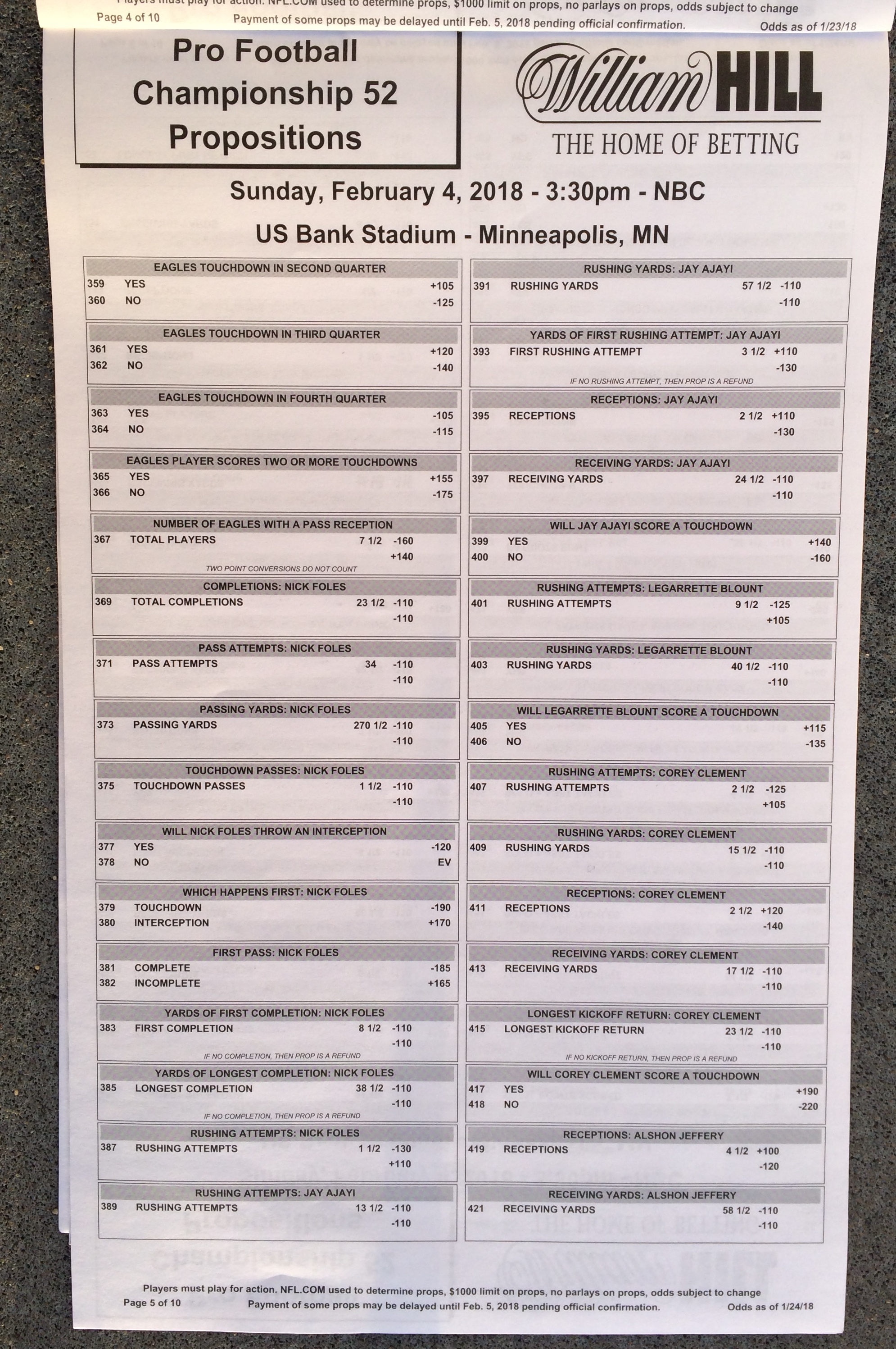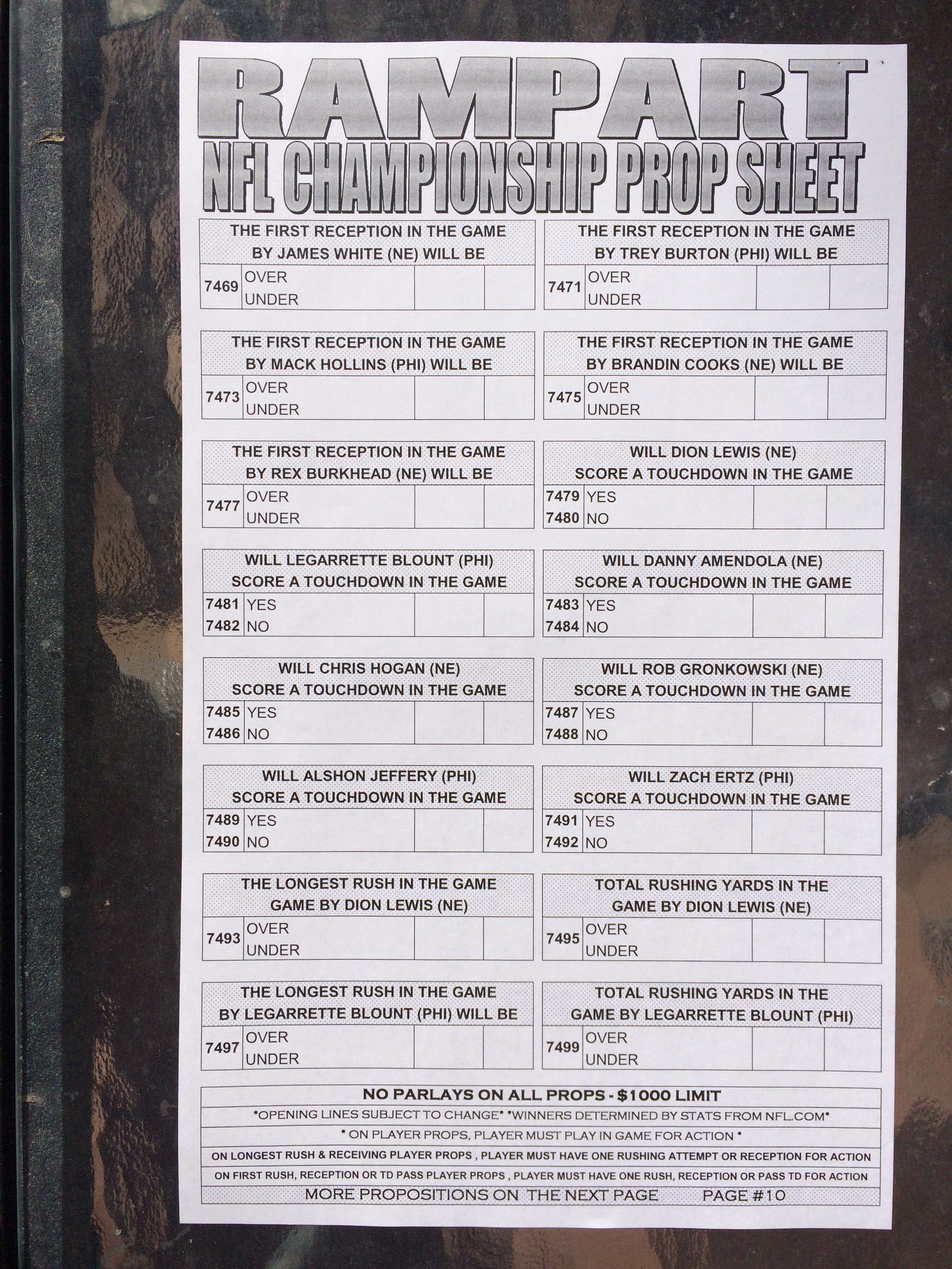 以下是拉斯維加斯幾家體育博彩公司每頁投注單的圖片。這些表格收集於2018年1月27日,即比賽開始前八天。