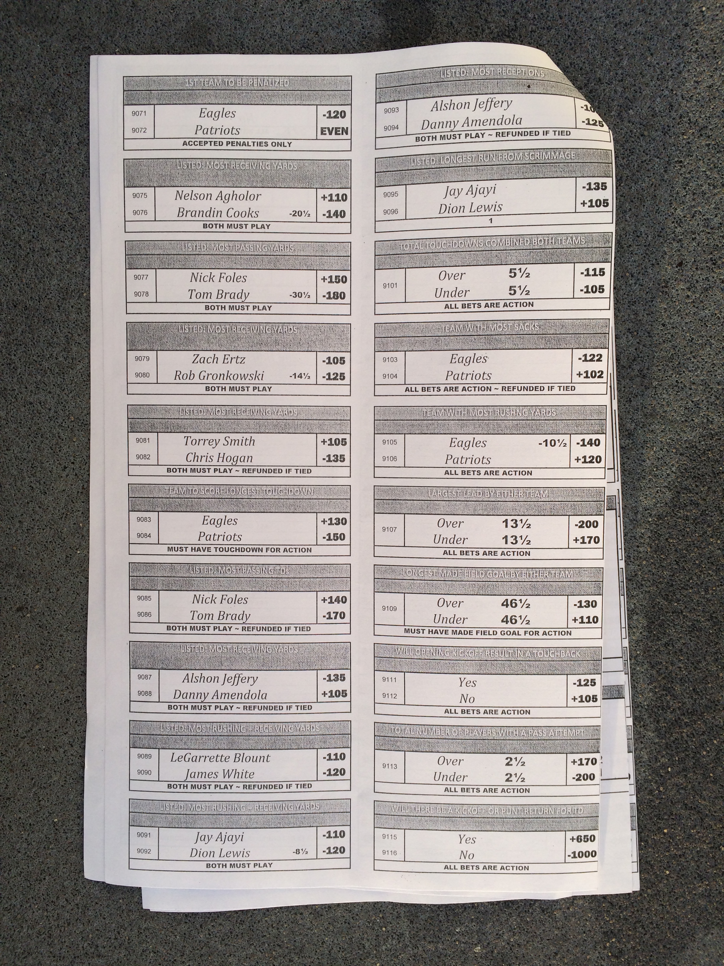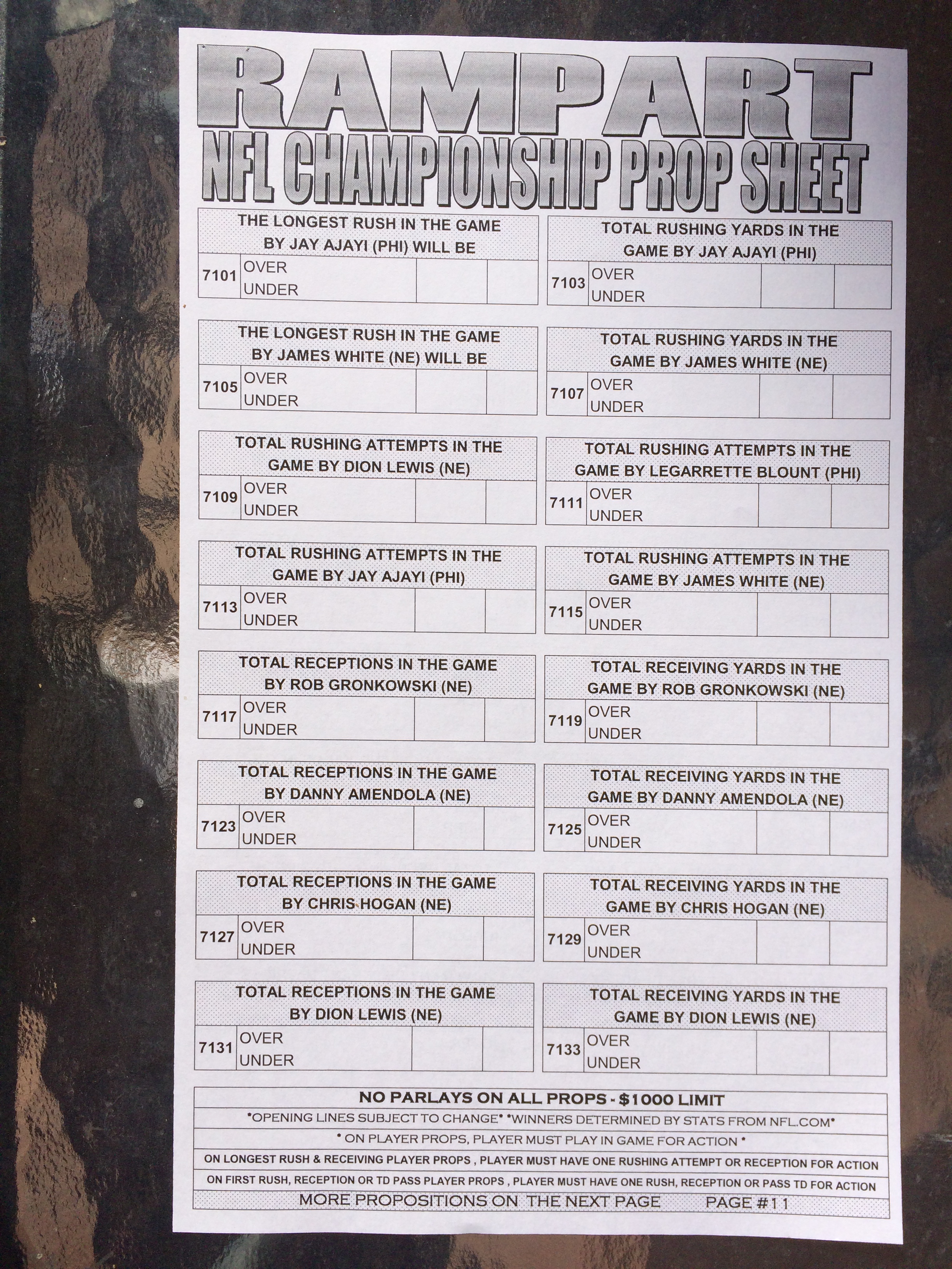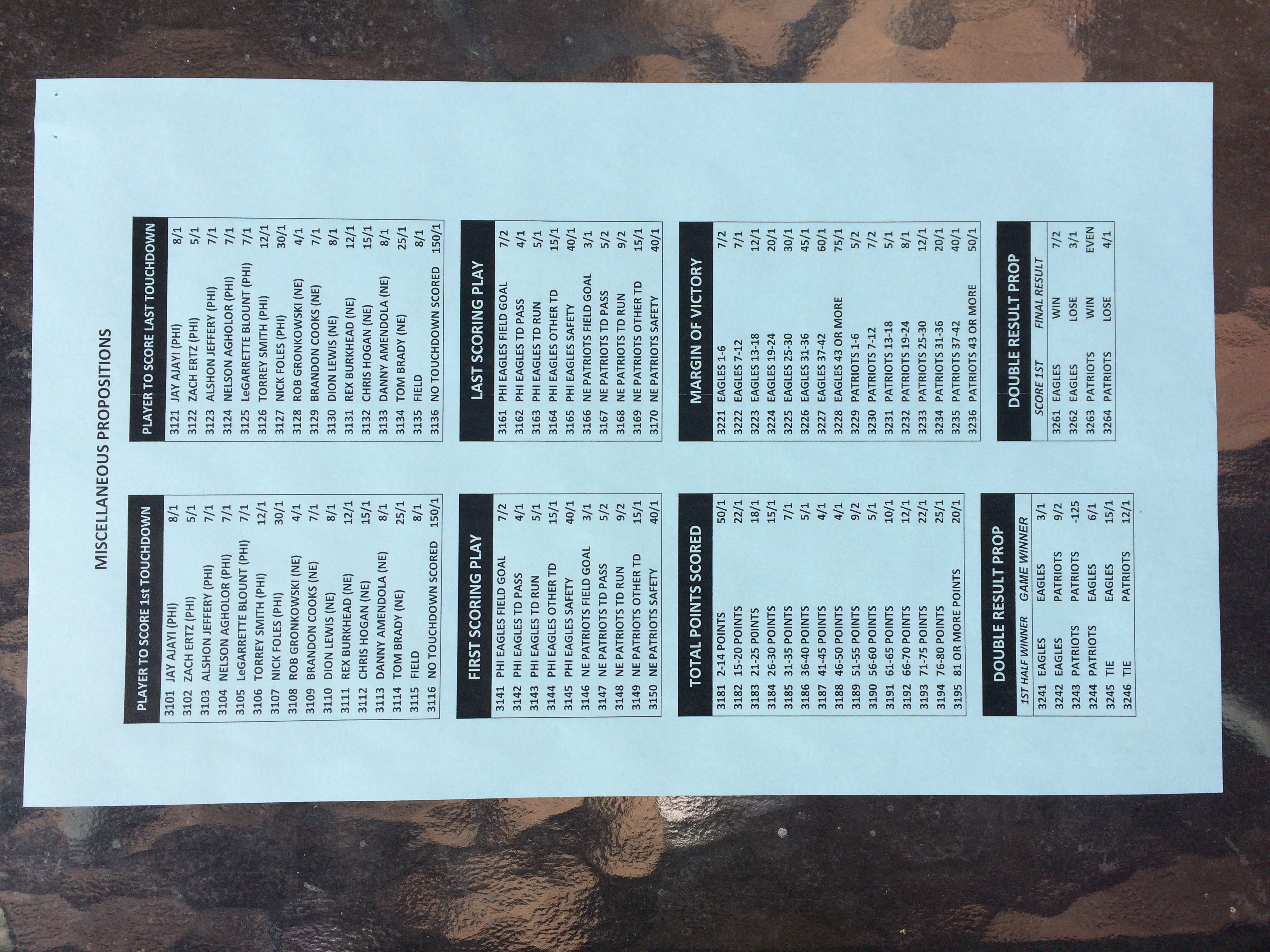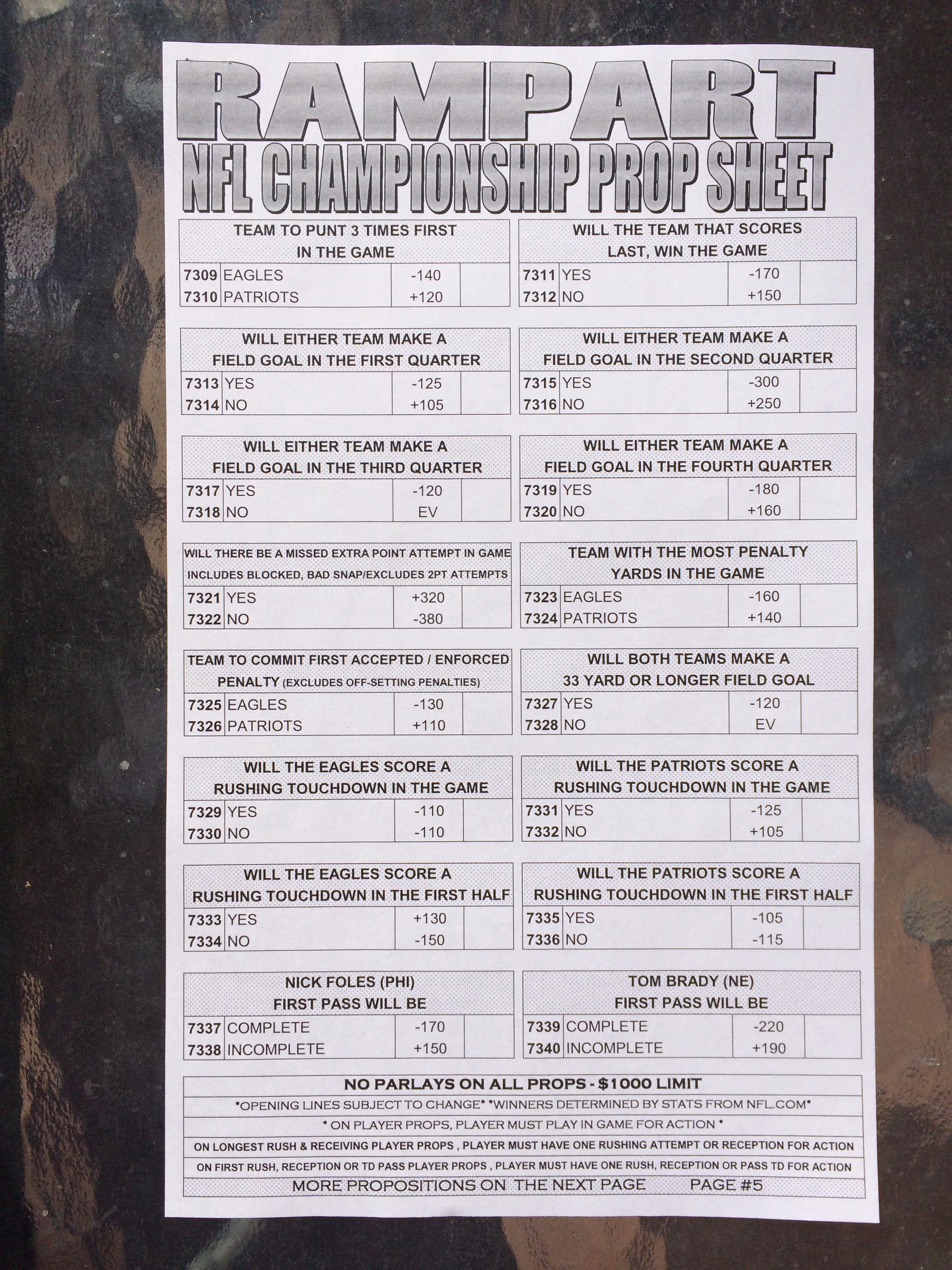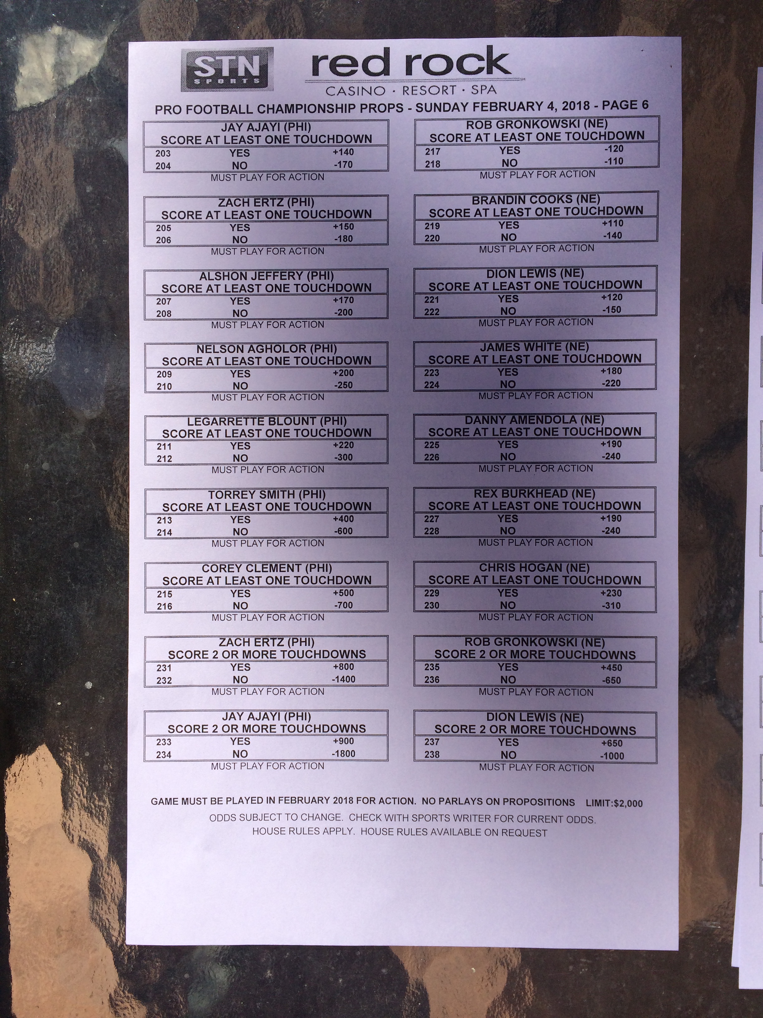 以下是拉斯維加斯幾家體育博彩公司每頁投注單的圖片。這些表格收集於2018年1月27日,即比賽開始前八天。