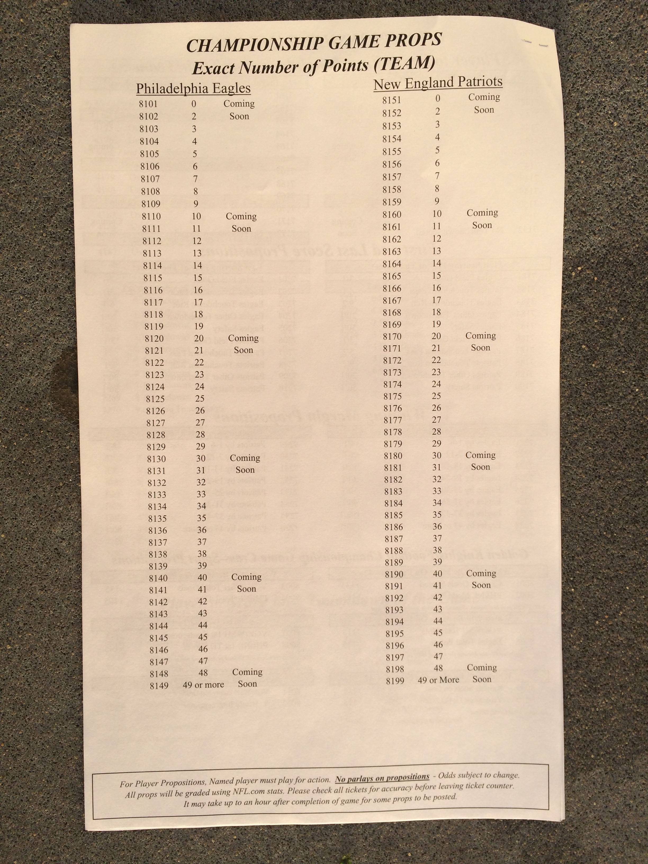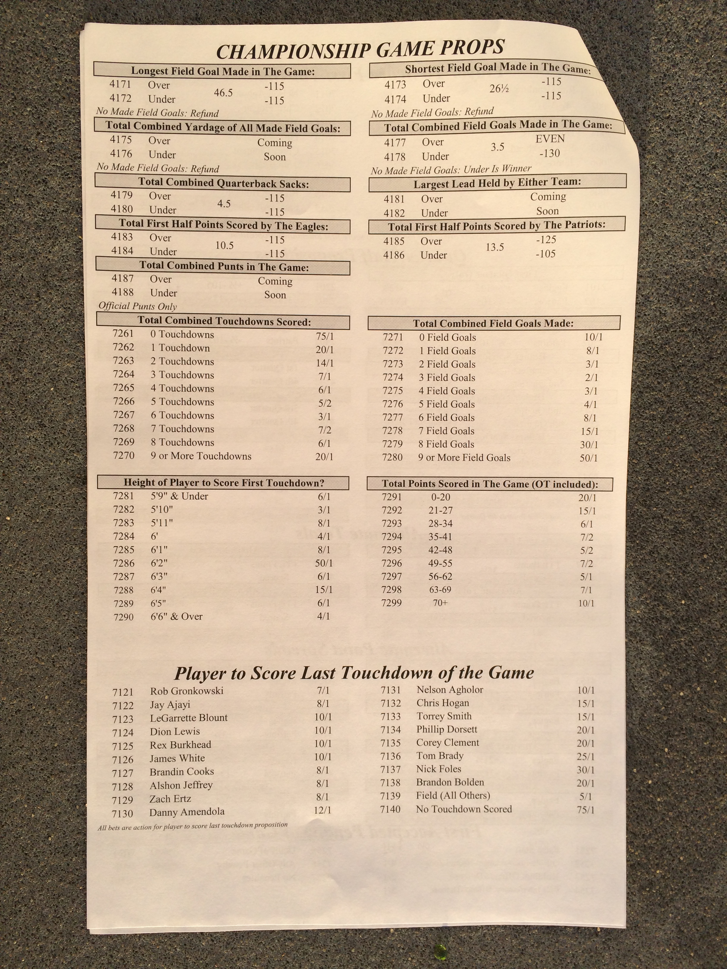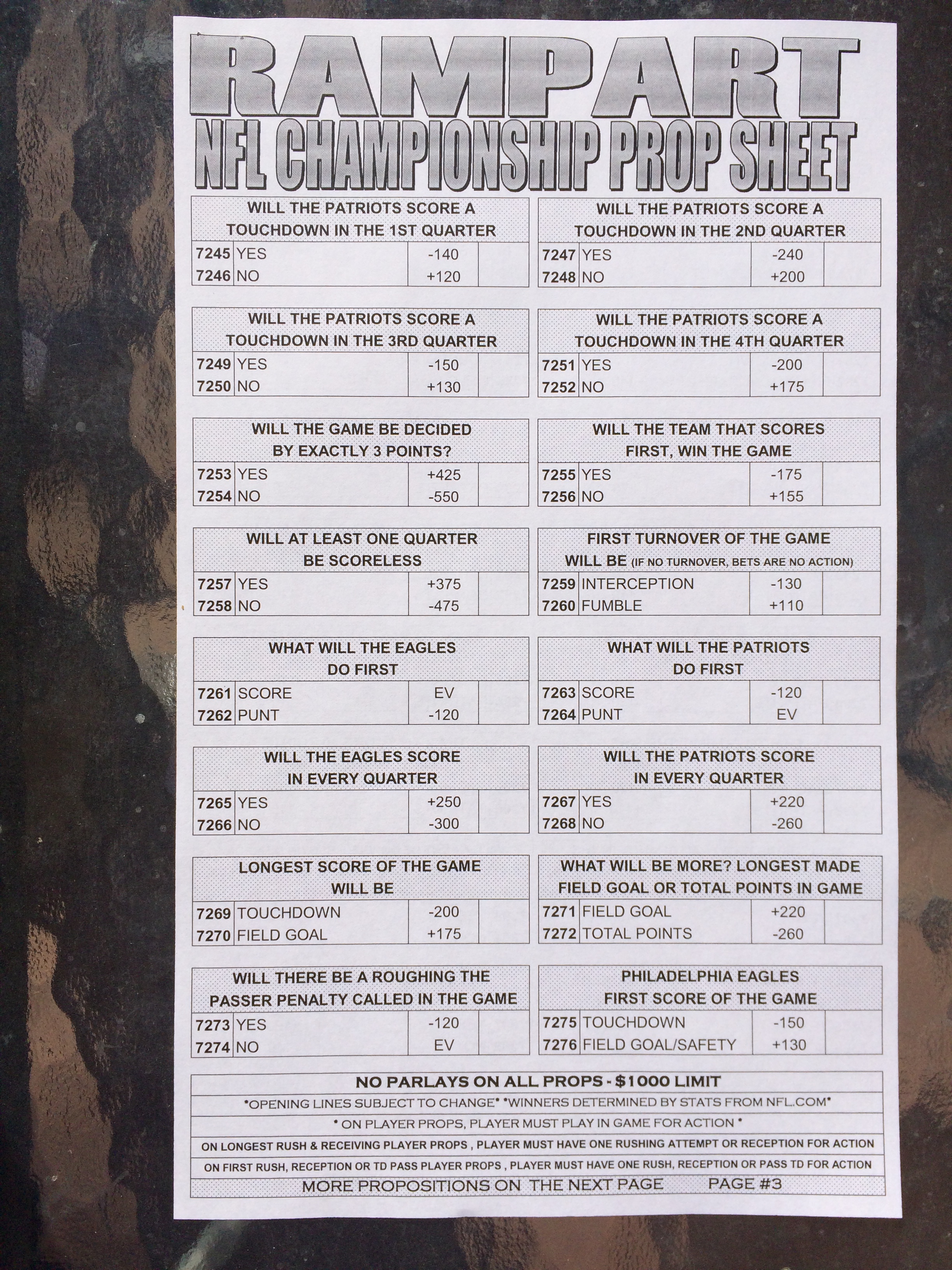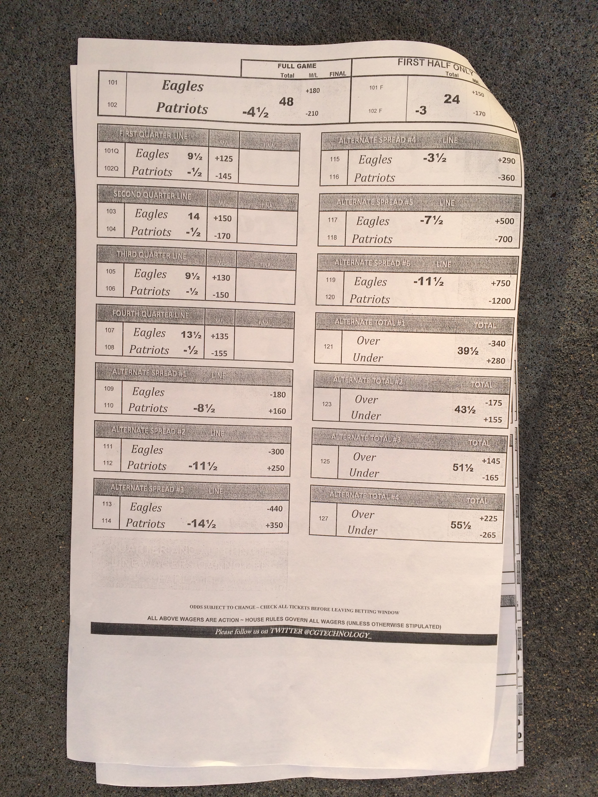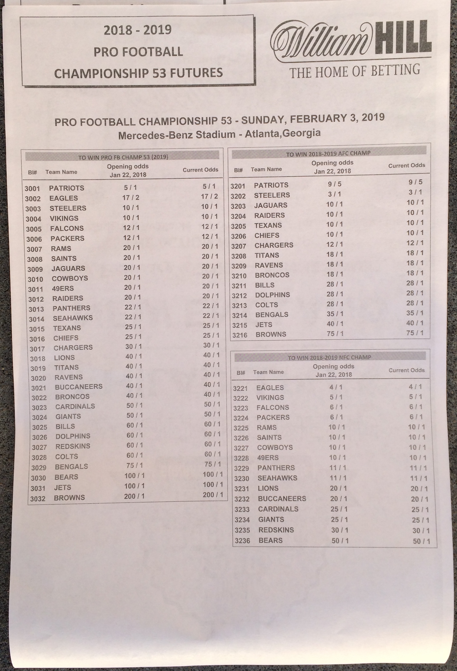 以下是拉斯維加斯幾家體育博彩公司每頁投注單的圖片。這些表格收集於2018年1月27日,即比賽開始前八天。