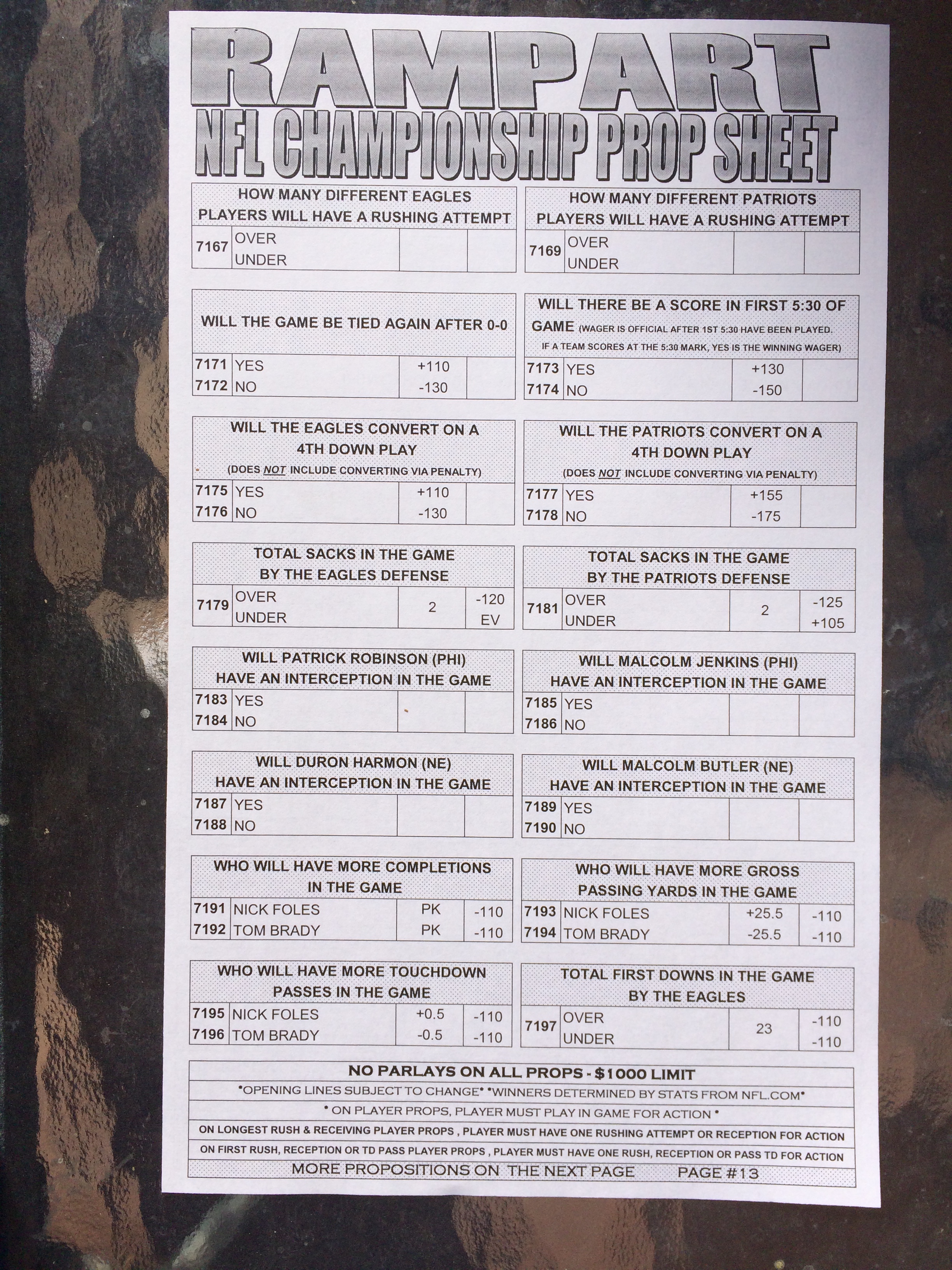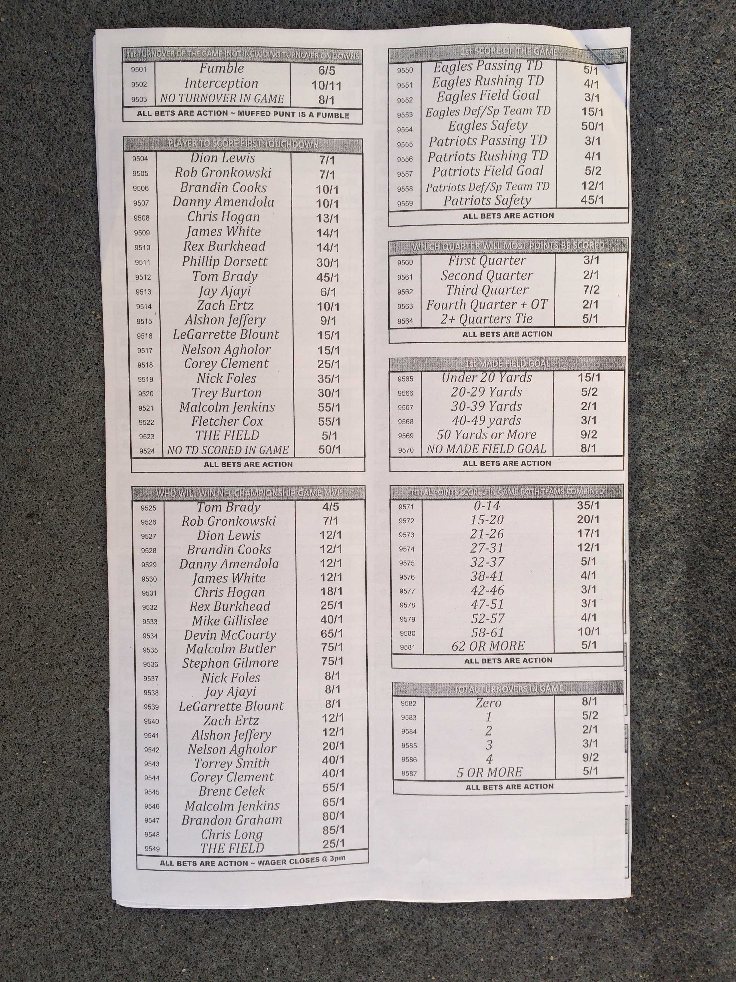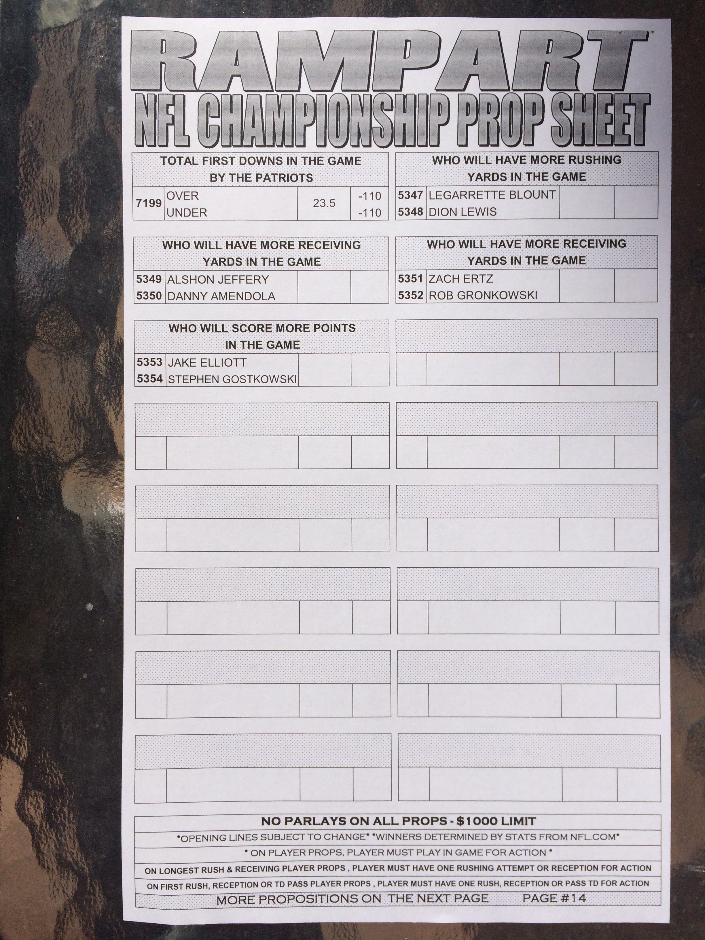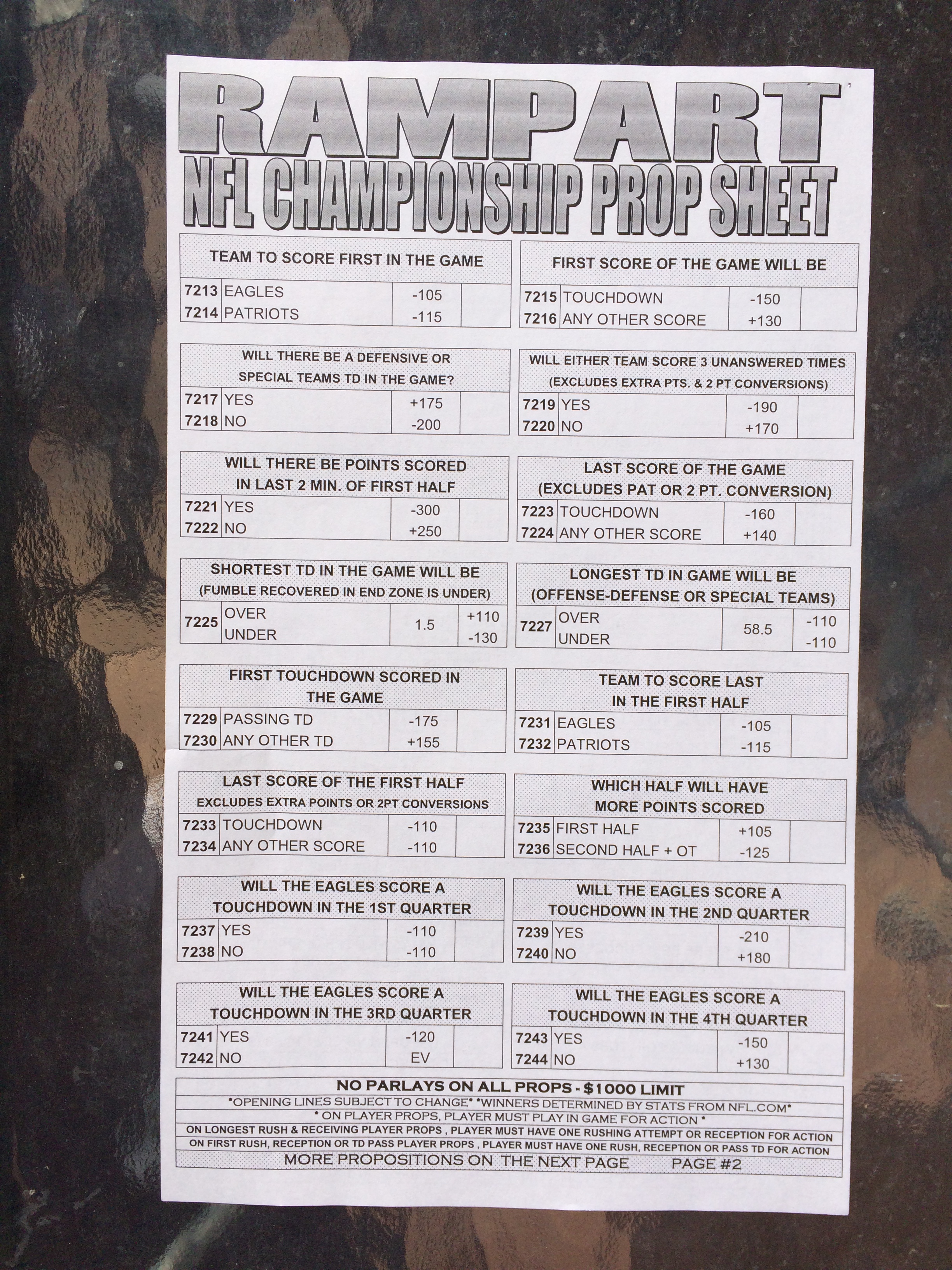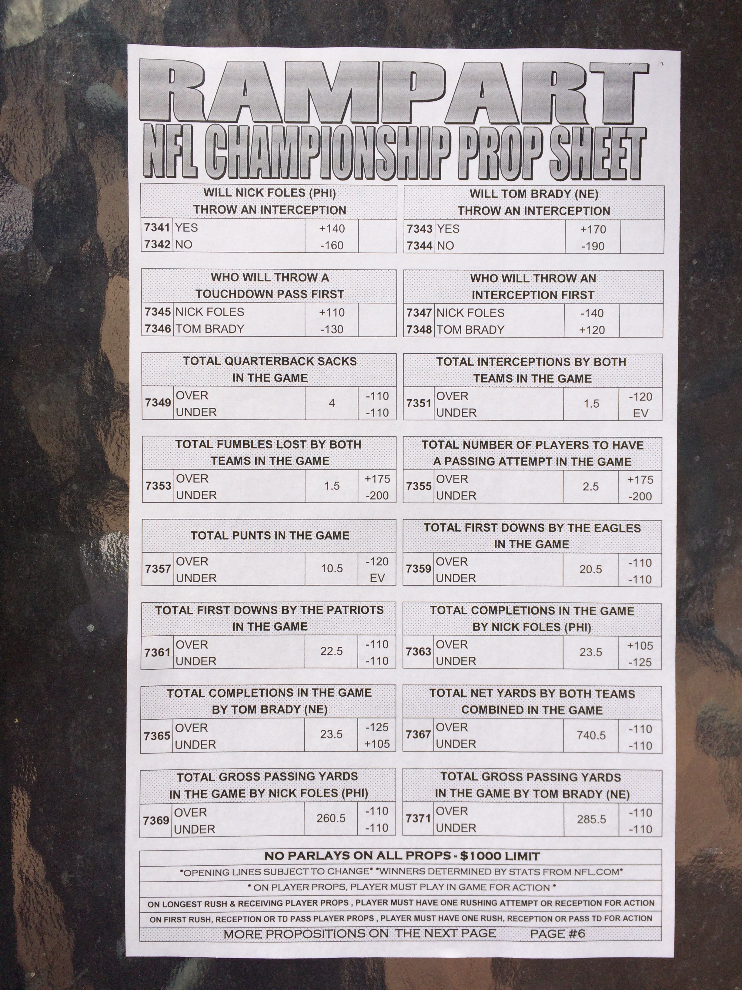 以下是拉斯維加斯幾家體育博彩公司每頁投注單的圖片。這些表格收集於2018年1月27日,即比賽開始前八天。