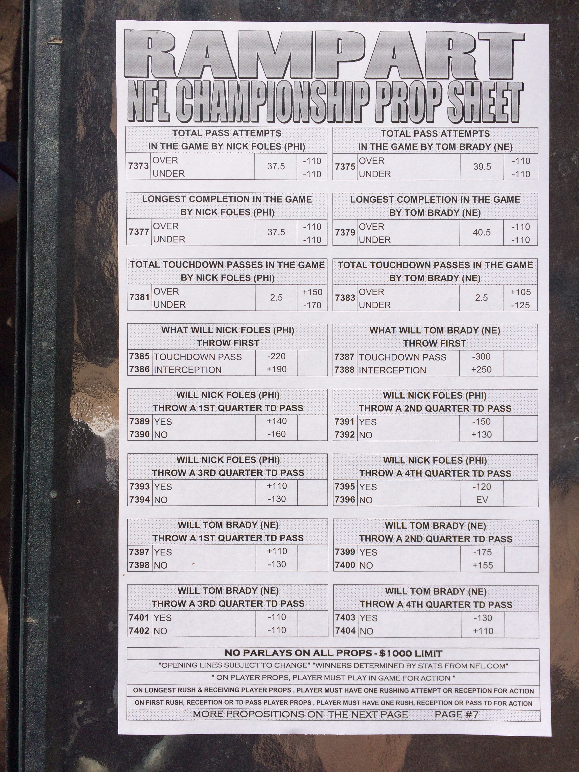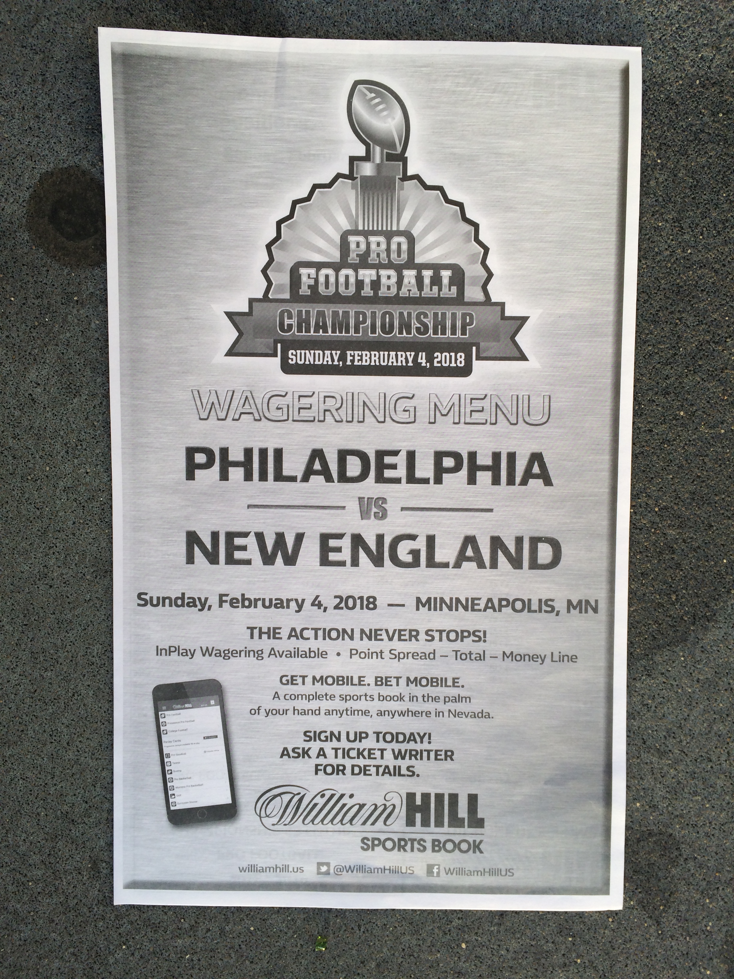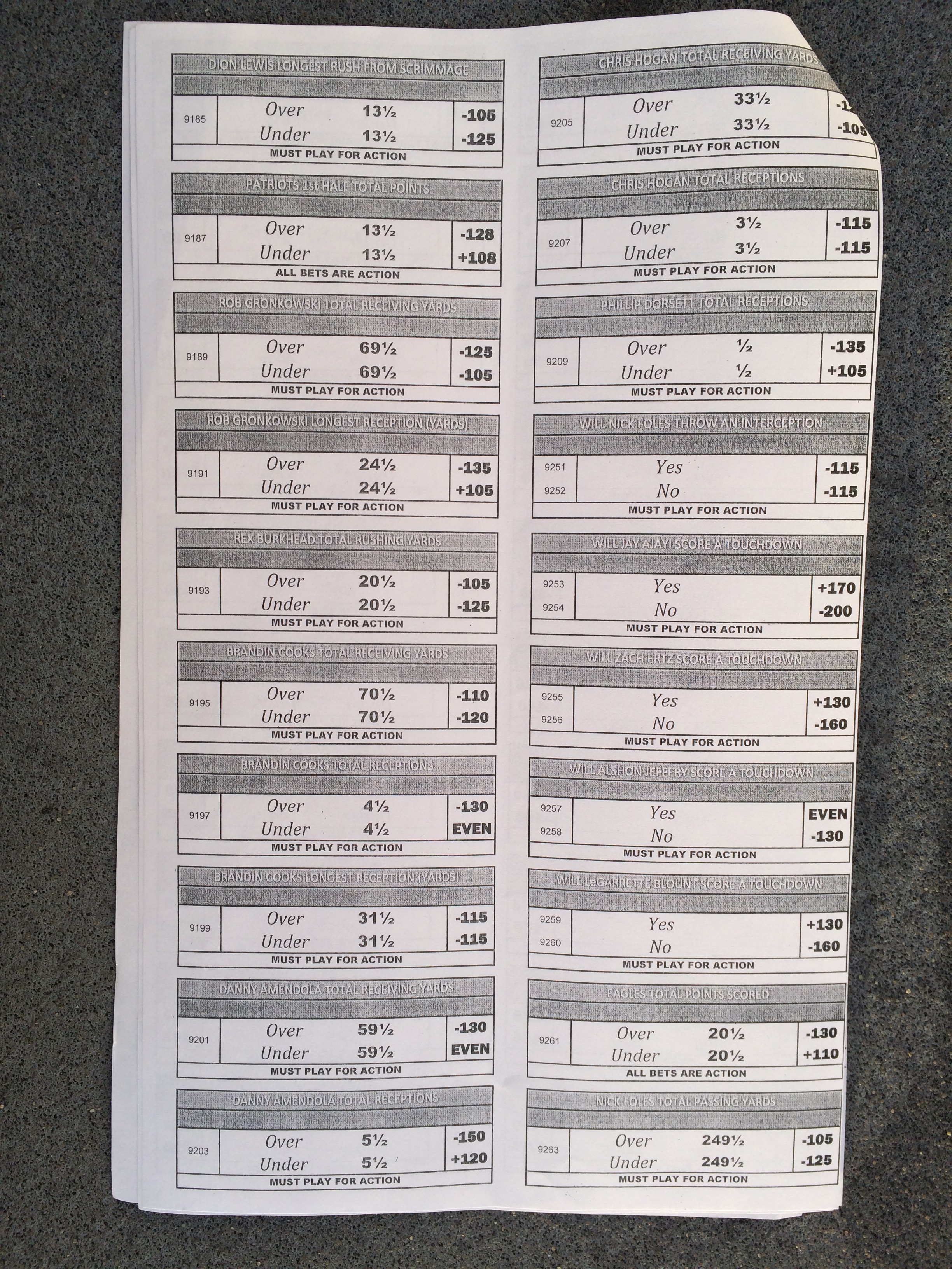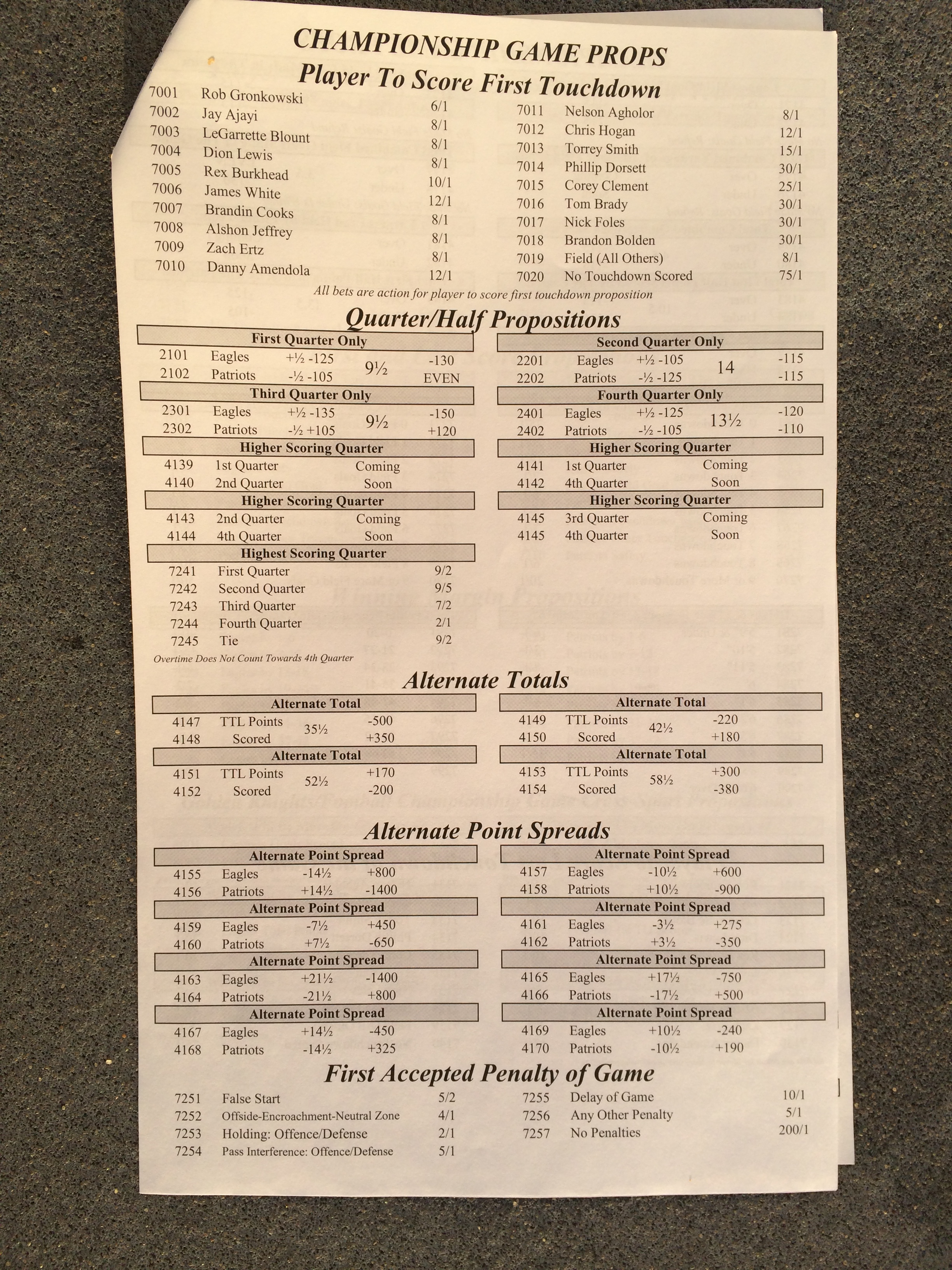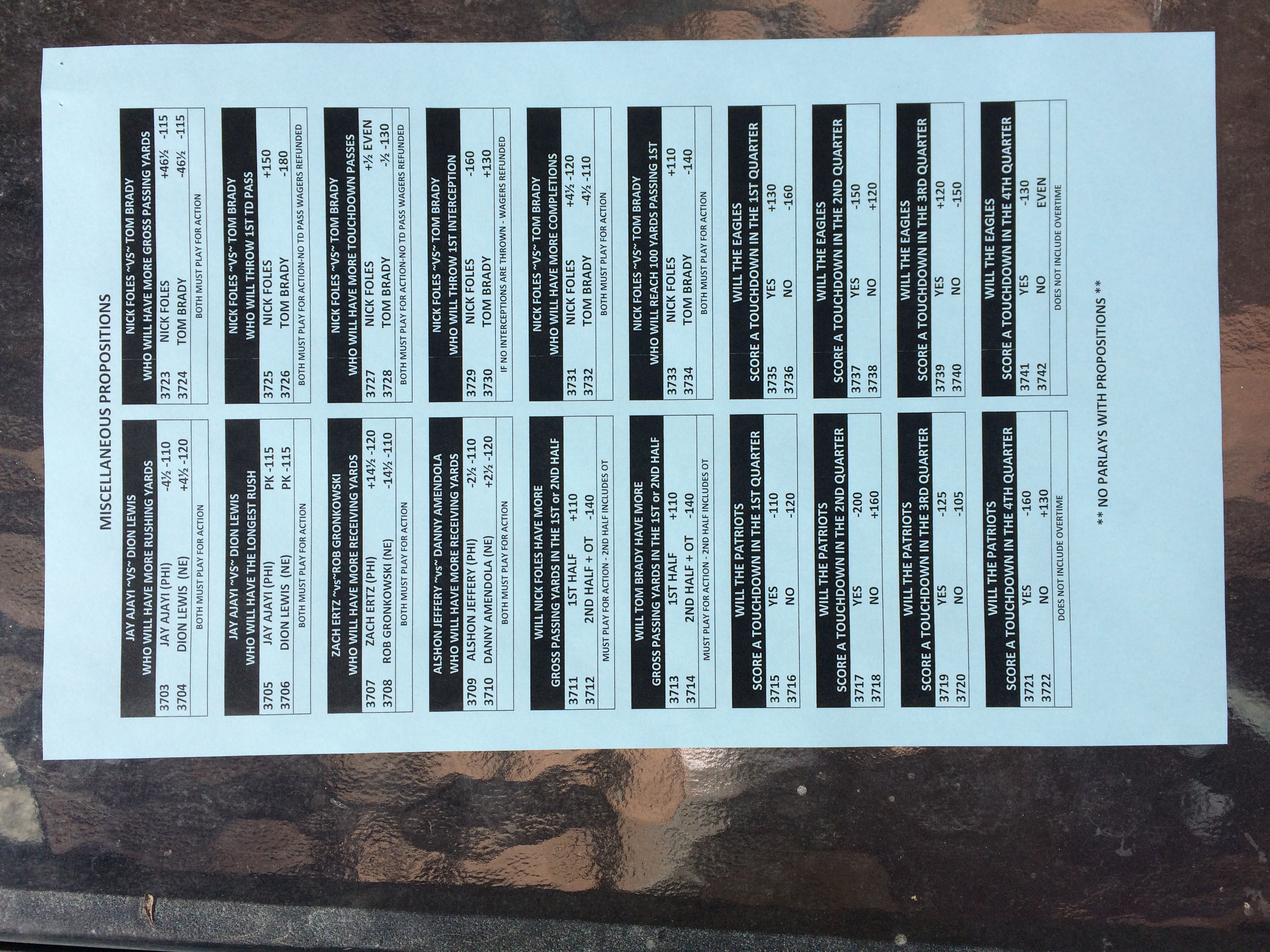 以下是拉斯維加斯幾家體育博彩公司每頁投注單的圖片。這些表格收集於2018年1月27日,即比賽開始前八天。