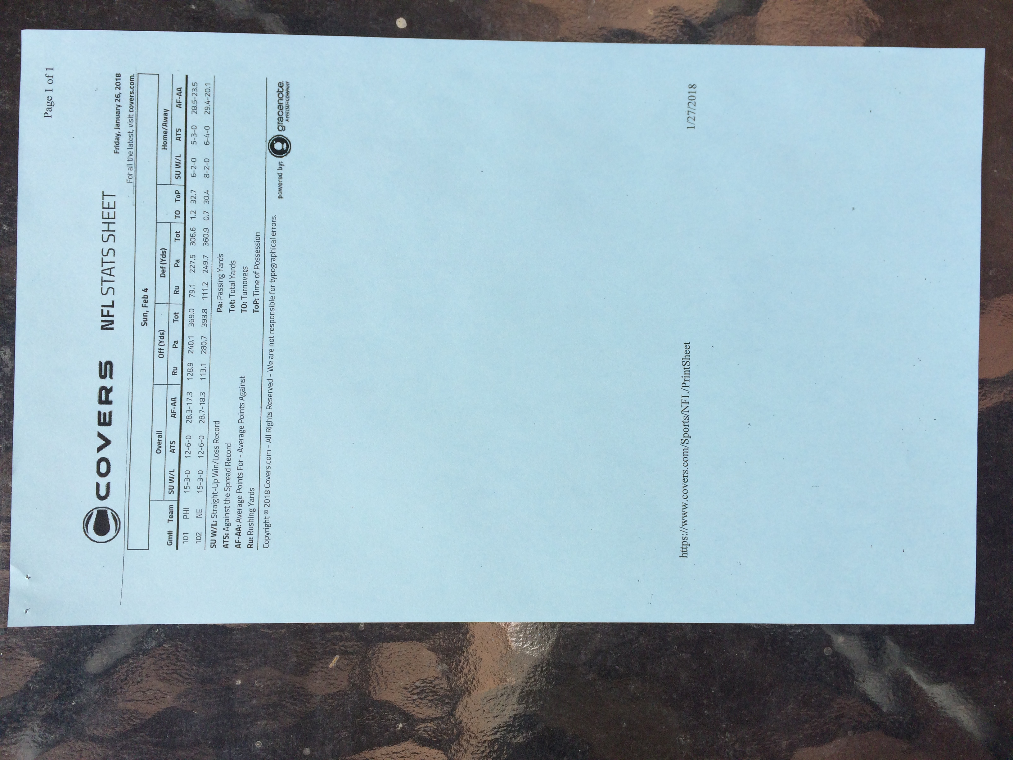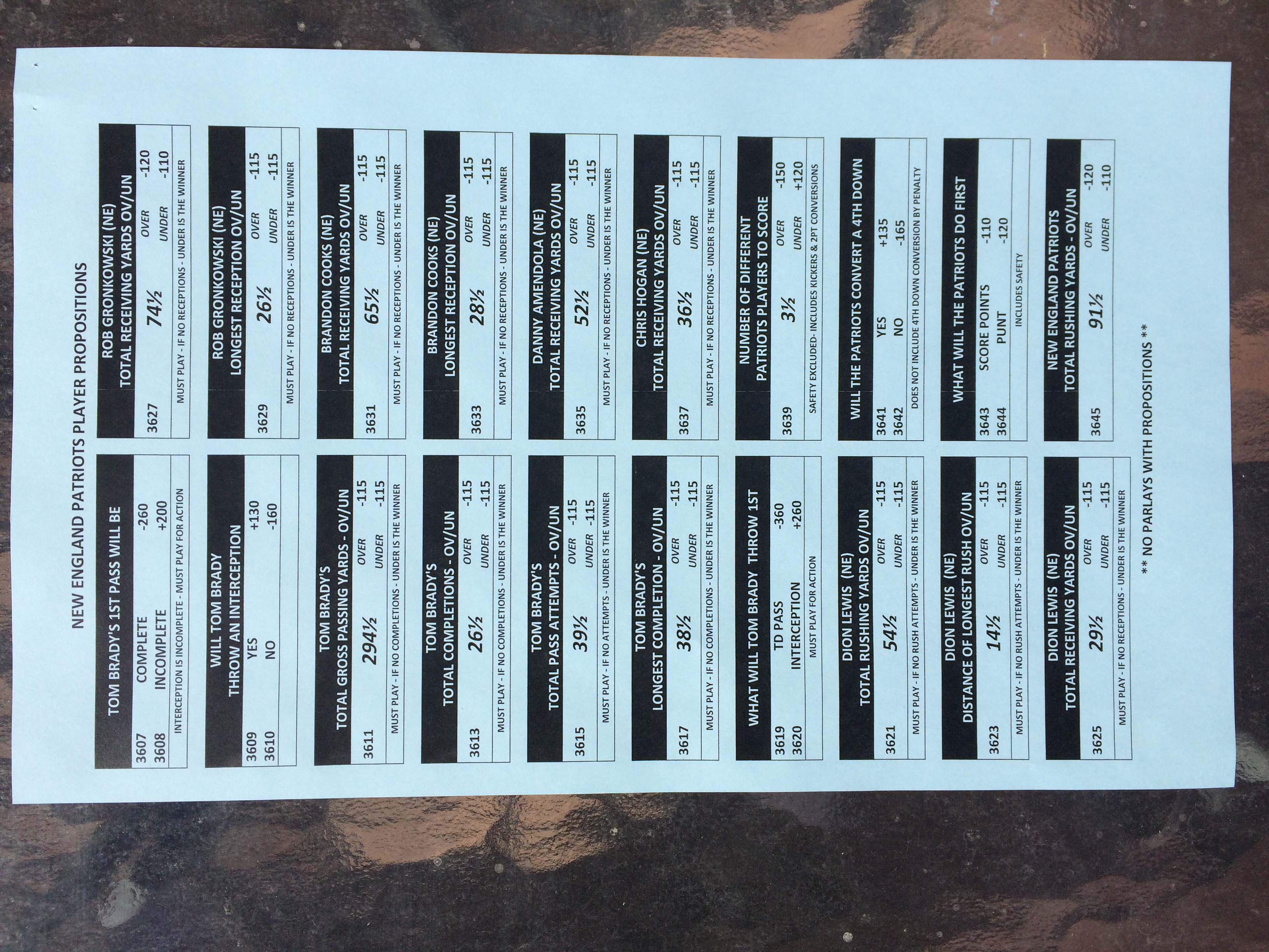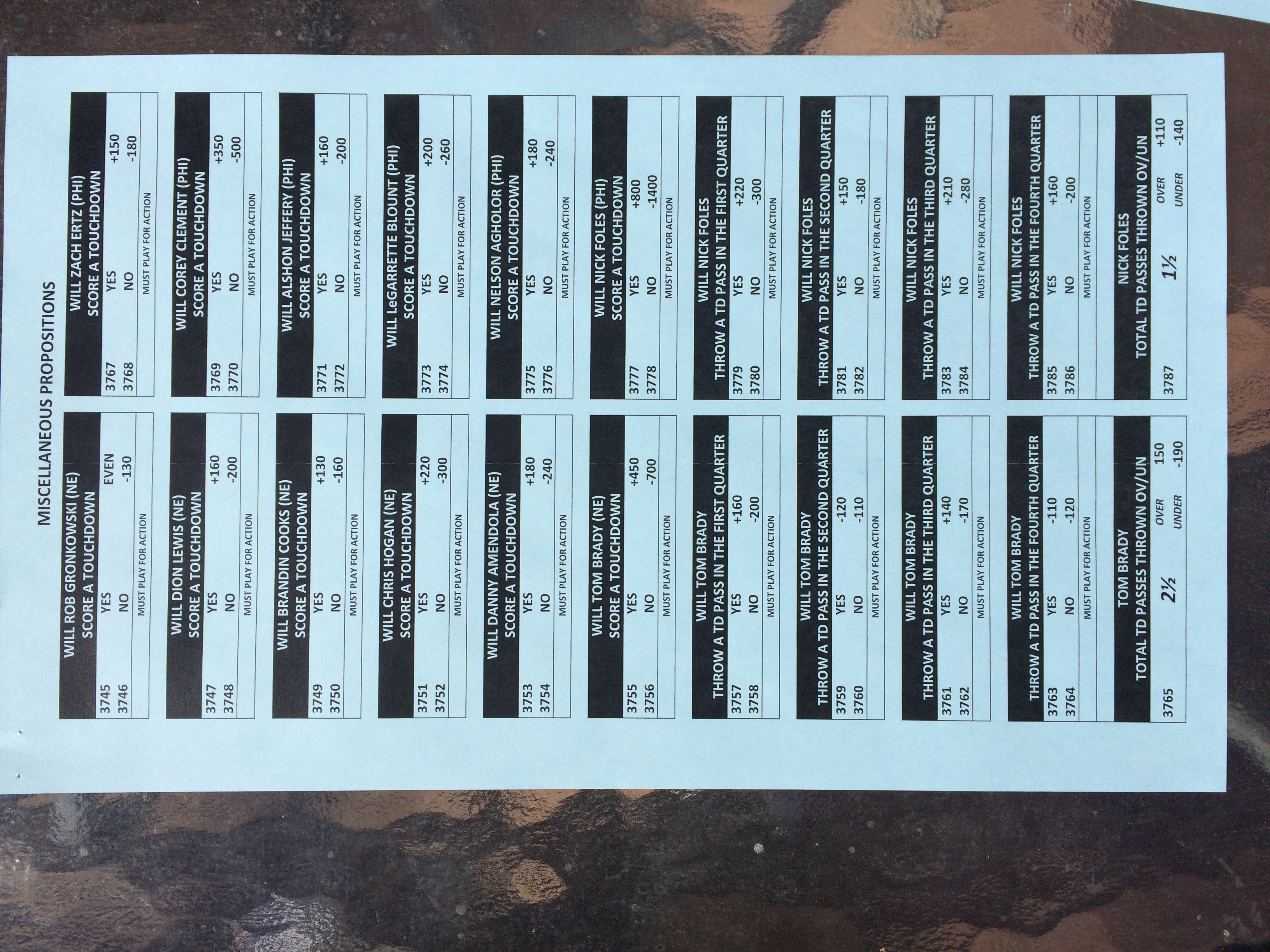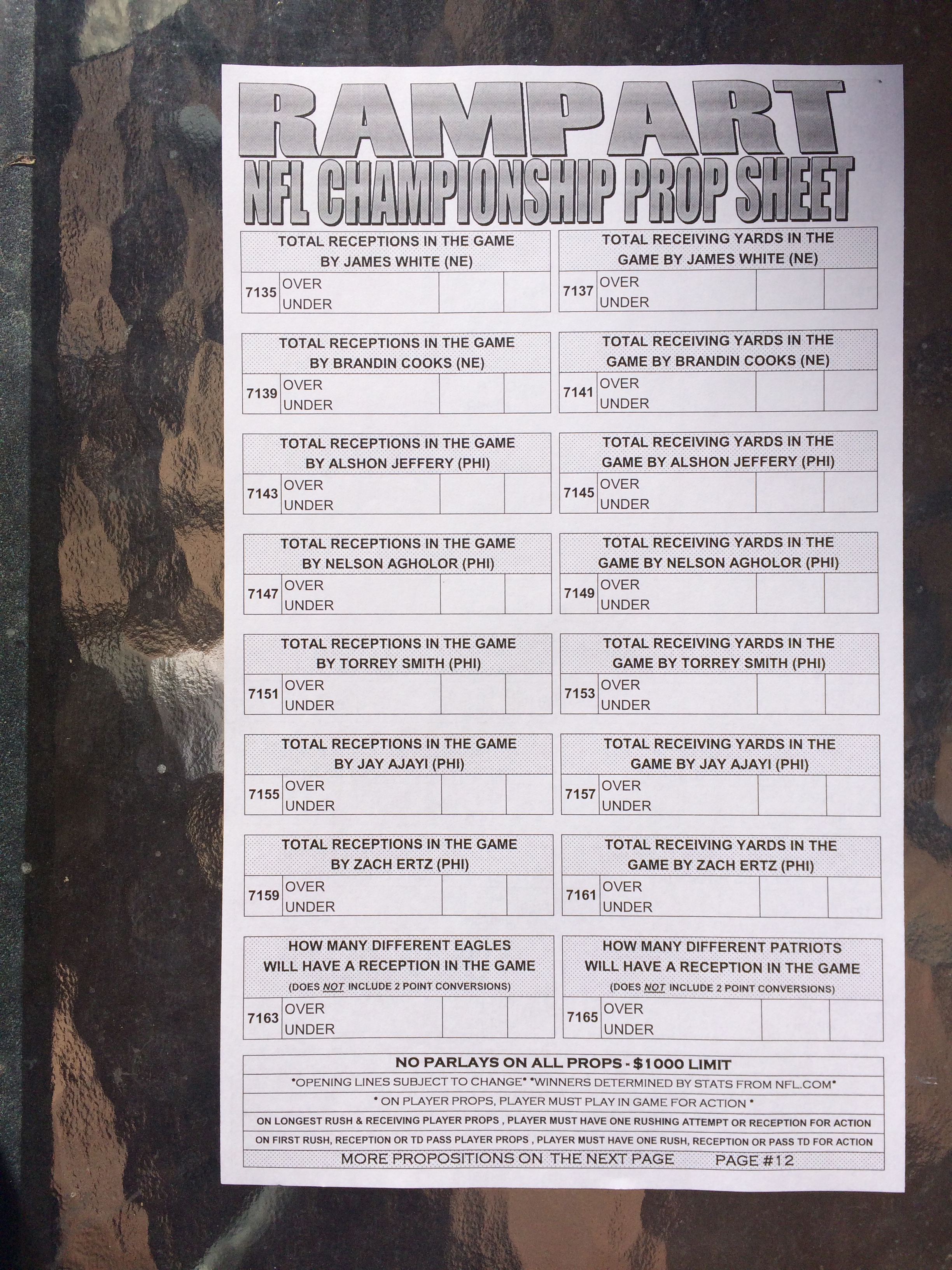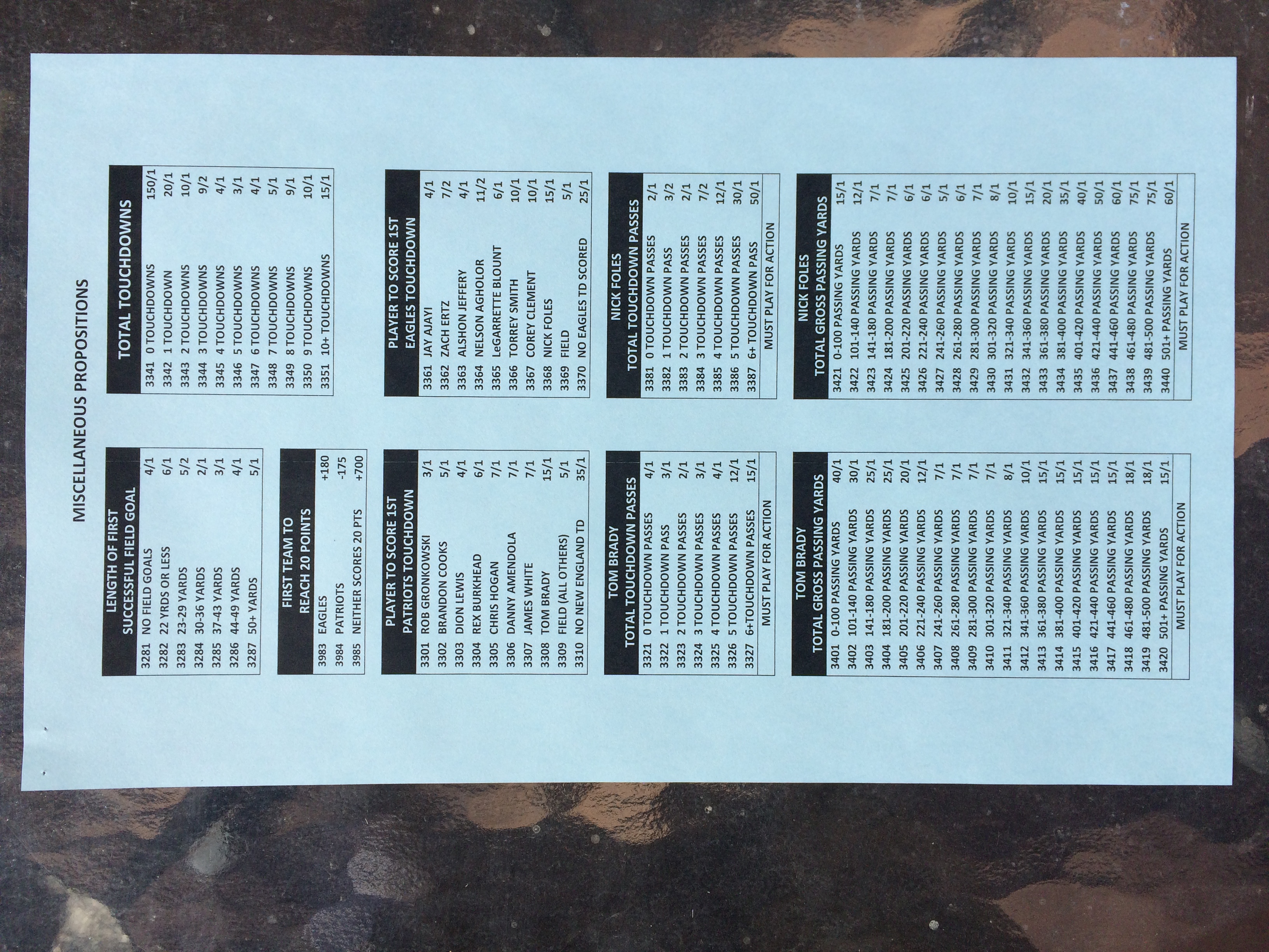 以下是拉斯維加斯幾家體育博彩公司每頁投注單的圖片。這些表格收集於2018年1月27日,即比賽開始前八天。