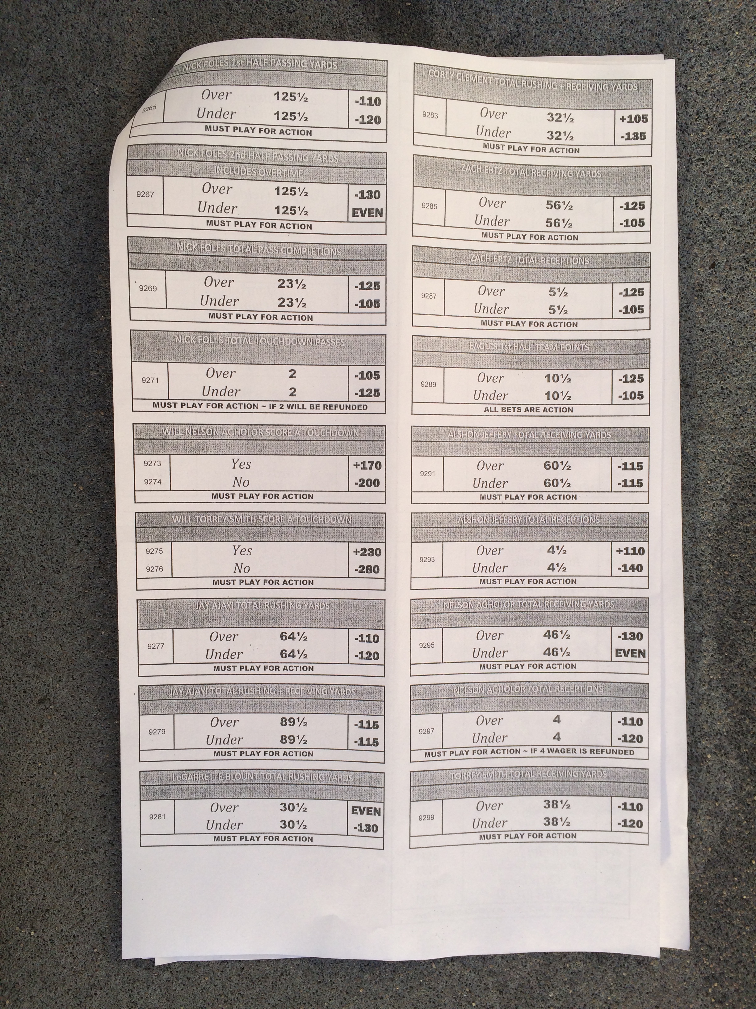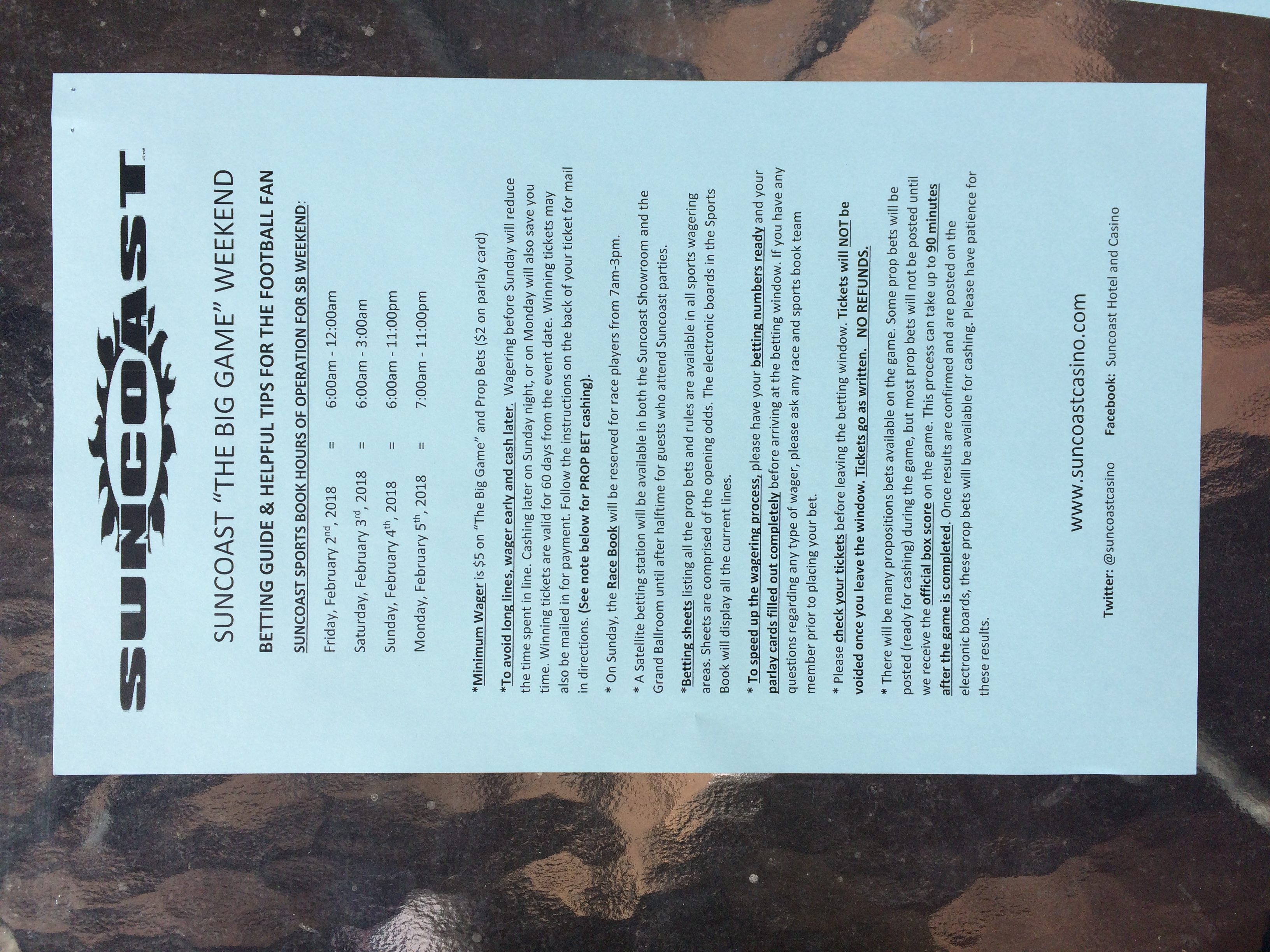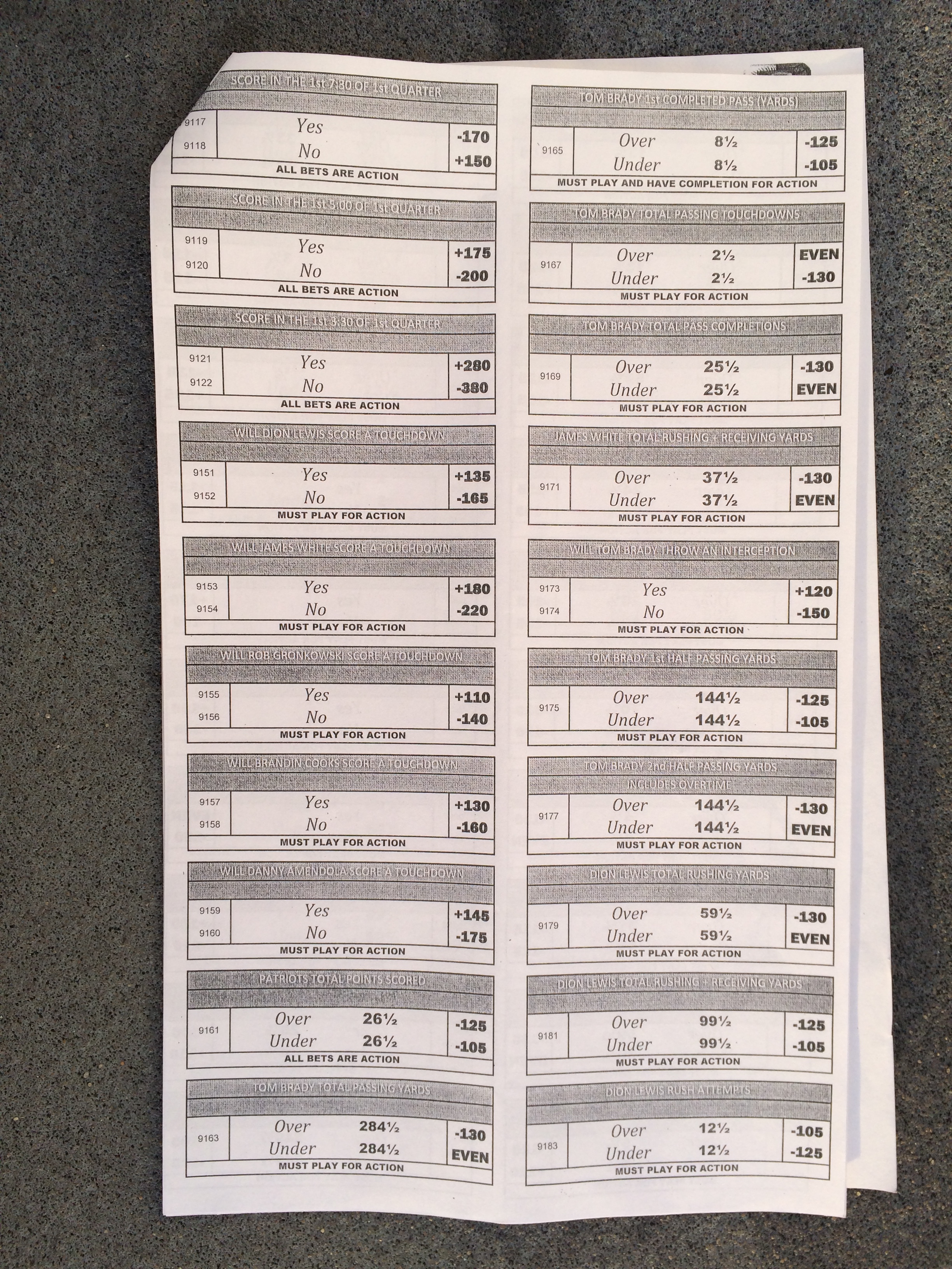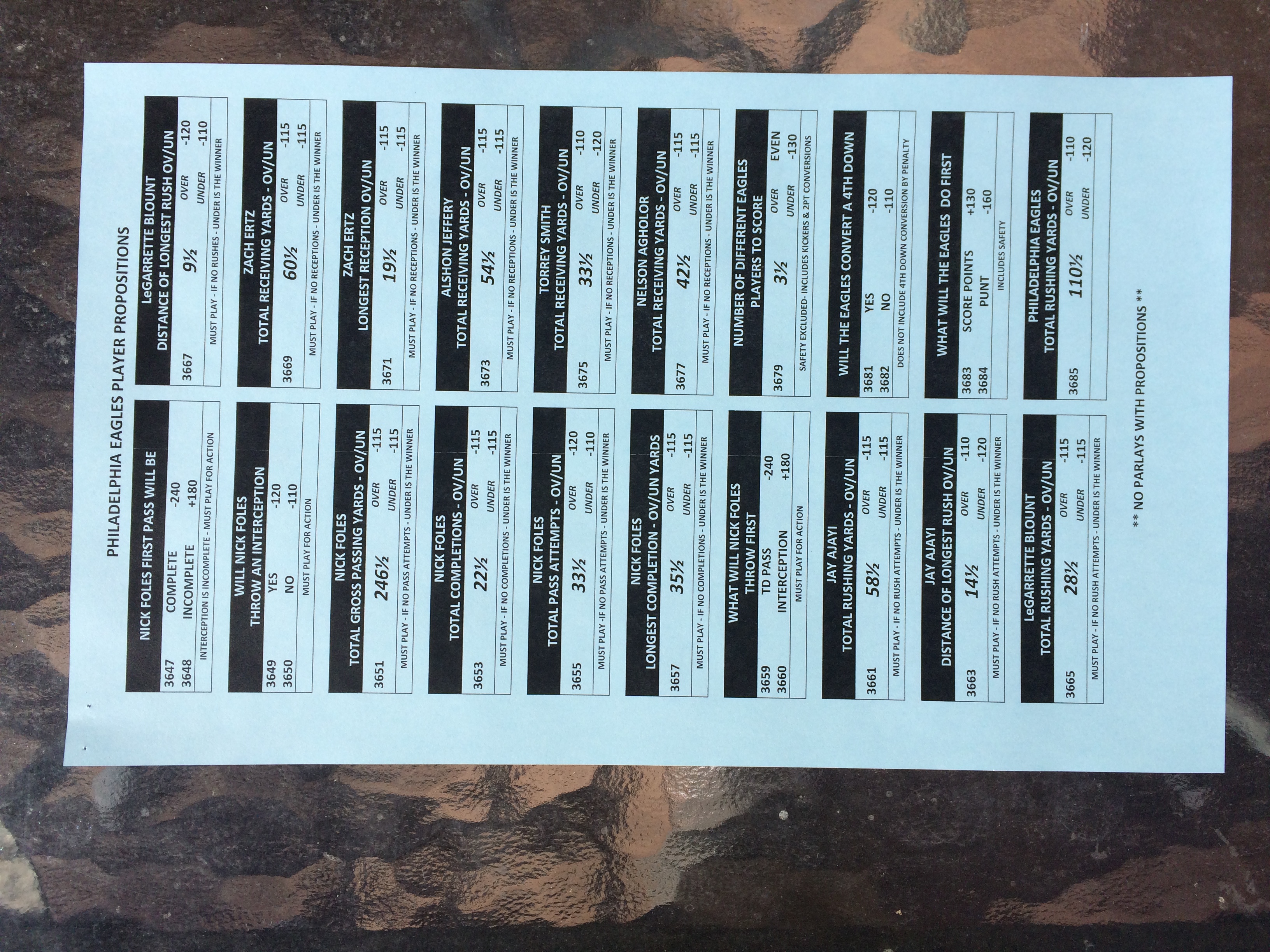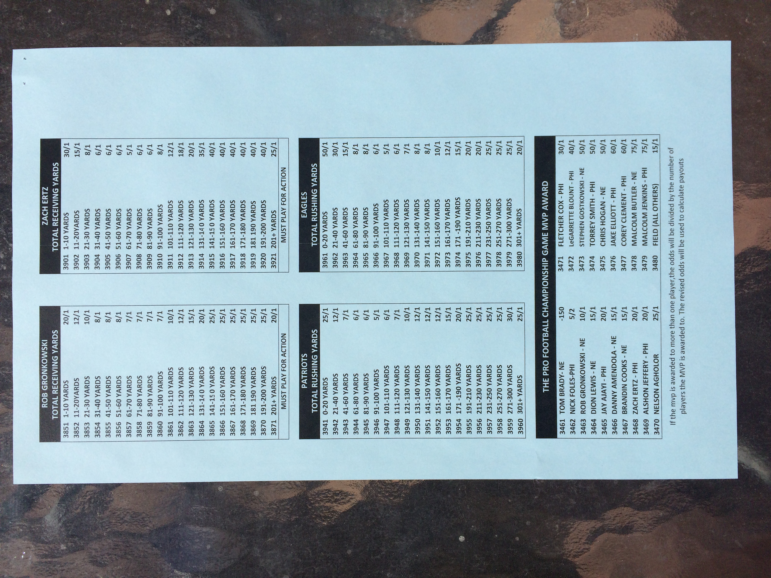 以下是拉斯維加斯幾家體育博彩公司每頁投注單的圖片。這些表格收集於2018年1月27日,即比賽開始前八天。