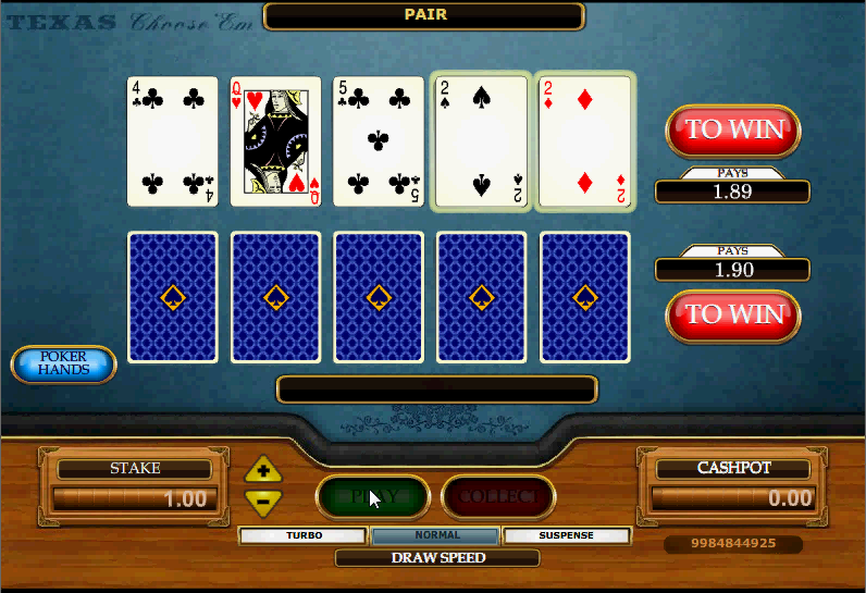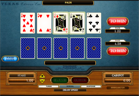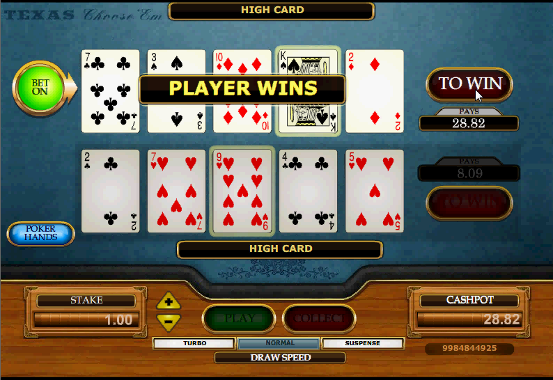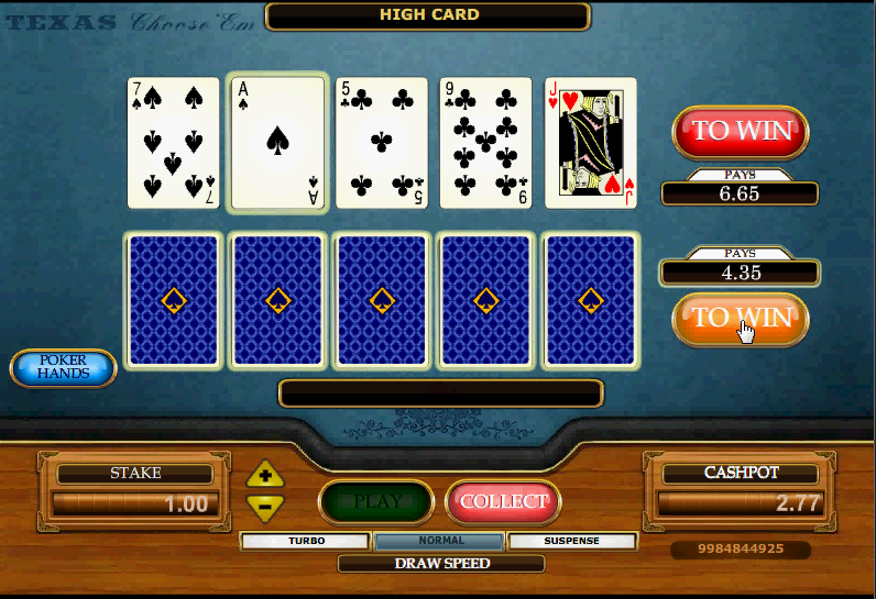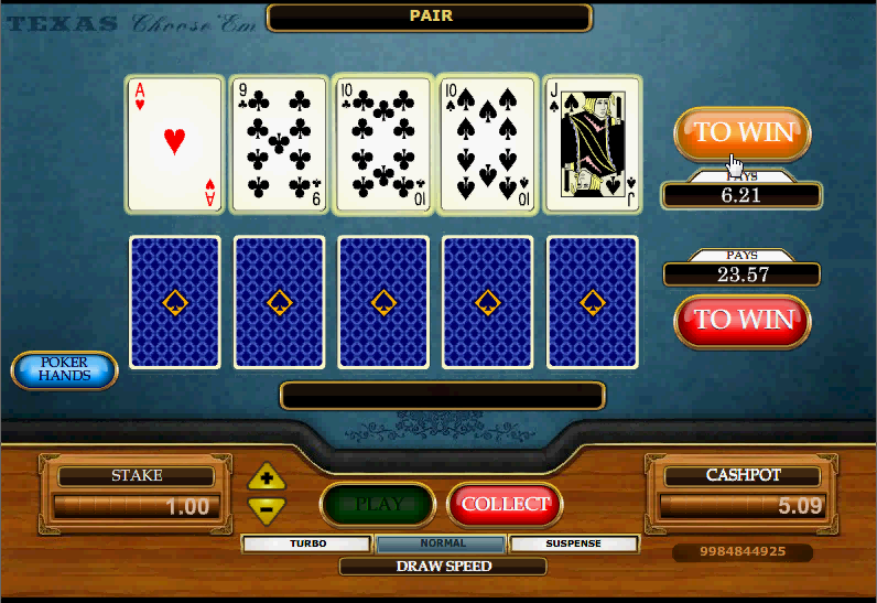 德州撲克「選我」(Texas Choose 'Em)是一款簡單的撲克遊戲,由龍魚公司(Dragon Fish)開發,該公司為網路賭場提供遊戲。遊戲玩法很簡單——隨機顯示一手五張牌的撲克牌。玩家可以押注另一手牌的點數會高於或低於這手牌。每次下注的賠率與獲勝機率成正比。