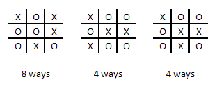 如果有 4 個 X 和 5 個 O,那麼在棋盤上放置 X 和 O 的組合方法共有 (9,4)=126 種。在這 126 種方法中,有 16 種會導致平局。下圖顯示了三種平局模式,以及每種模式可以旋轉或翻轉的方式數量。因此,給定 4 個或 5 個 X,平局的機率為 16/126 = 12.70%。