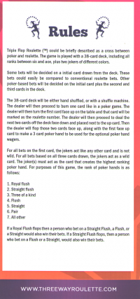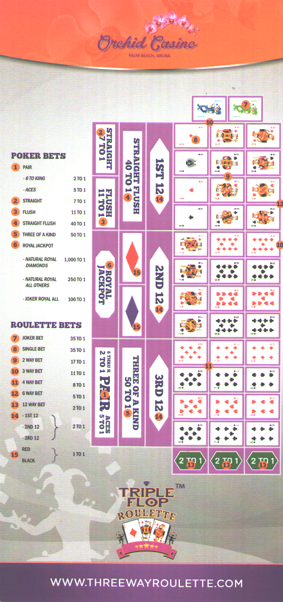 三重翻牌輪盤賭是撲克和輪盤賭的結合。它原本是為加州和俄克拉荷馬州等市場設計的,因為在這些地區,用輪盤玩輪盤賭是違法的。然而,它卻在阿魯巴的蘭花賭場找到了一席之地。