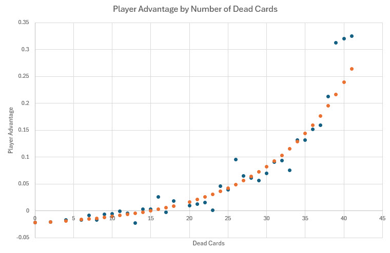 圖中的藍點表示實際模擬結果。橙點表示指數迴歸線上的點。根據d張死牌,玩家優勢(基於Ante下注)的公式如下: