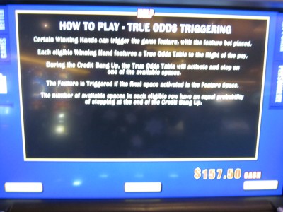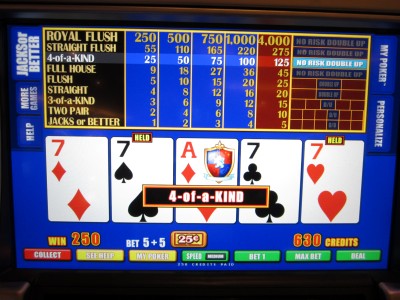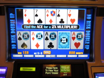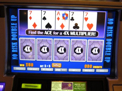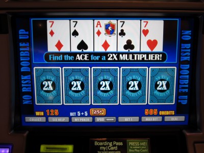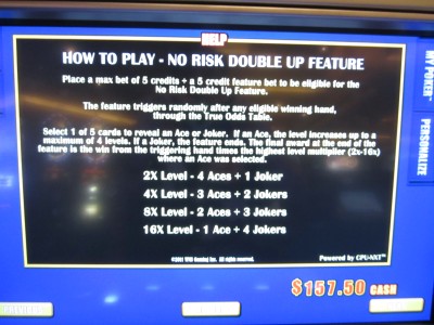 我第一次玩「無風險雙倍」是在2013年2月1日,它首發當天,地點是紅岩賭場。它是WMS My Poker老虎機上眾多遊戲之一。遊戲的核心在於,玩家有時在贏牌時會玩獎勵遊戲,有機會將獎金翻倍至四倍,或達到2 4 = 16的倍數。之所以說“無風險”,是因為在獎勵遊戲中,玩家最壞的情況也不過是獲得該手牌的基本獎金。但是,玩家需要支付一筆不可退還的費用,這筆費用等於他在電玩撲克遊戲中的賭注。