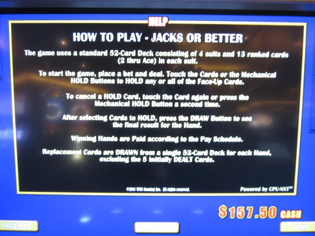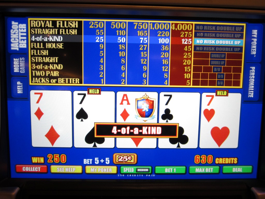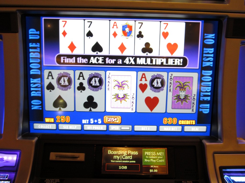 我第一次玩「無風險雙倍」是在2013年2月1日,它首發當天,地點是紅岩賭場。它是WMS My Poker老虎機上眾多遊戲之一。遊戲的核心在於,玩家有時在贏牌時會玩獎勵遊戲,有機會將獎金翻倍至四倍,或達到2 4 = 16的倍數。之所以說“無風險”,是因為在獎勵遊戲中,玩家最壞的情況也不過是獲得該手牌的基本獎金。但是,玩家需要支付一筆不可退還的費用,這筆費用等於他在電玩撲克遊戲中的賭注。