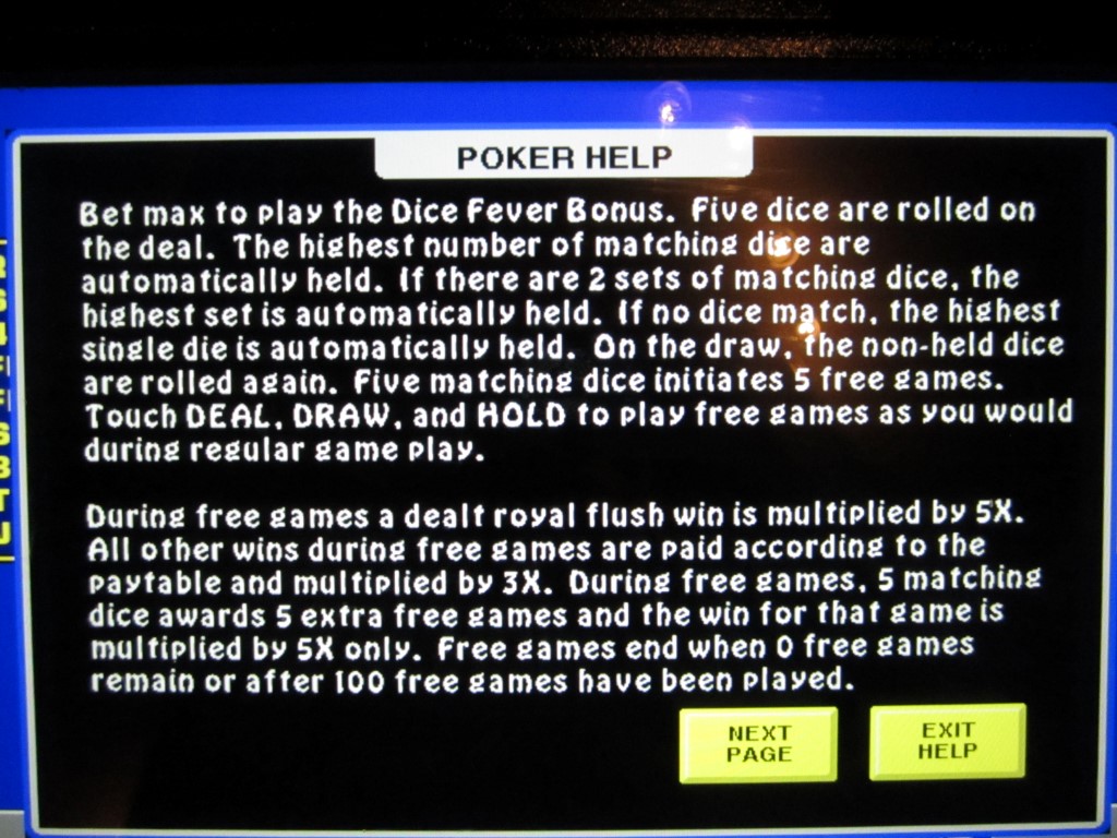 2014年3月,我在拉斯維加斯的一家酒吧發現了一款名為「Dice Fever」的電玩撲克遊戲。它的玩法和普通的視訊撲克類似,只是增加了一個獎勵功能。玩家只需花費六分之一硬幣,就有機會贏得免費遊戲獎勵。如果玩家在兩次投擲中用五顆骰子湊成五點同花,即可獲得獎勵。