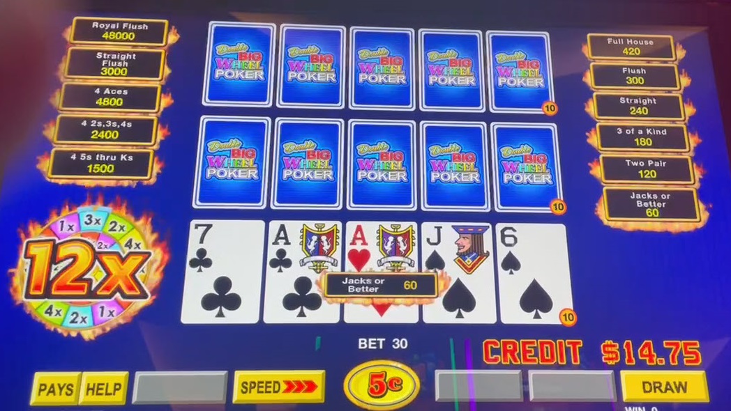 - 雙大轉盤撲克是基於 3 次播放、5 次播放和 10 次播放視訊撲克的可選功能。