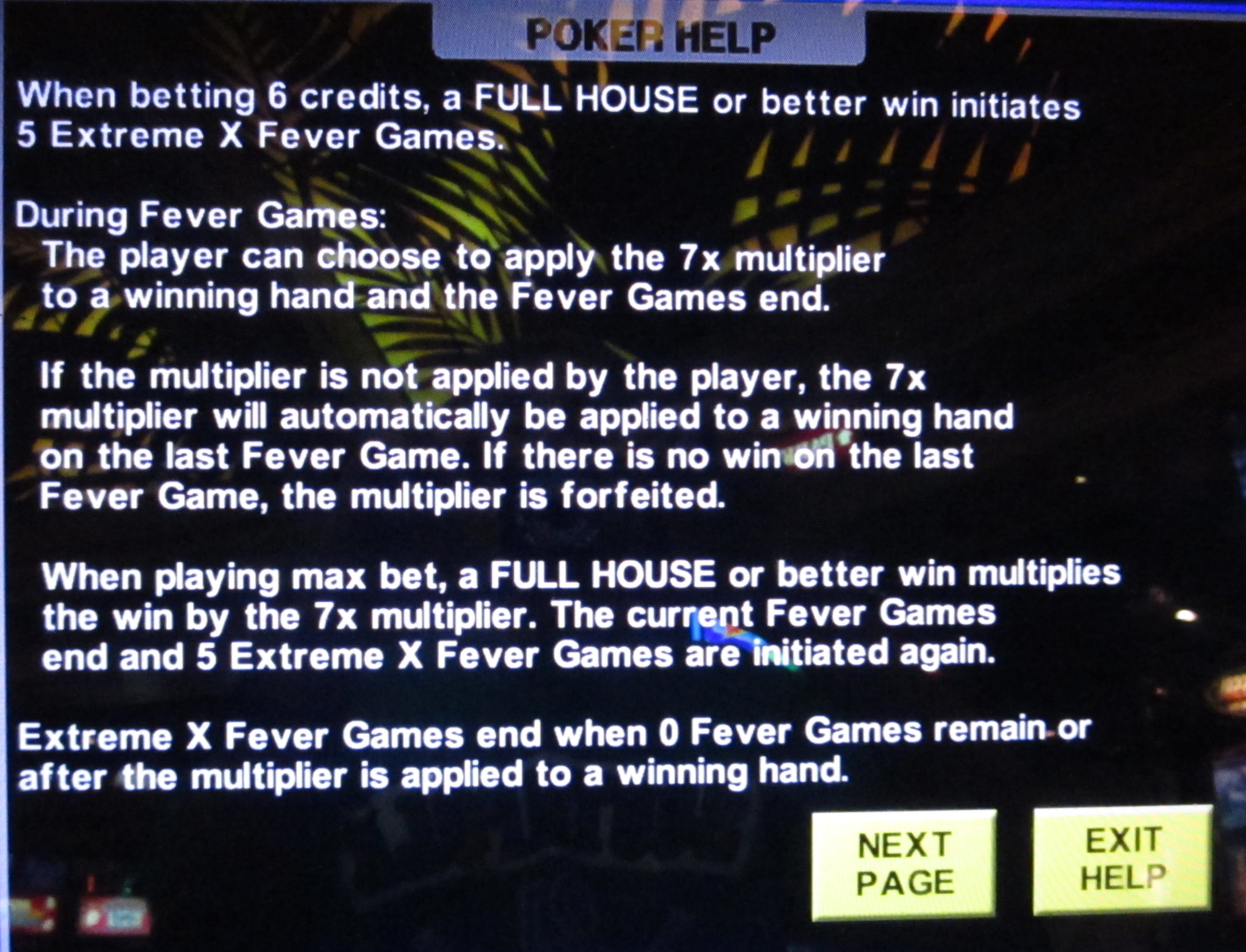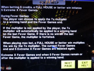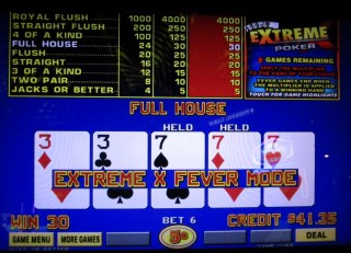 Extreme X Poker 是 IGT 推出的視訊撲克遊戲,在抽牌時出現任何葫蘆或更好的卡片後,玩家將獲得基於乘數的獎勵。獲得獎勵後,玩家有五場「狂熱遊戲」來接受乘數。無論是在微弱的勝率下接受加成,還是在五場狂熱遊戲結束前爭取更大的勝率,這都是一個非常有趣的策略。