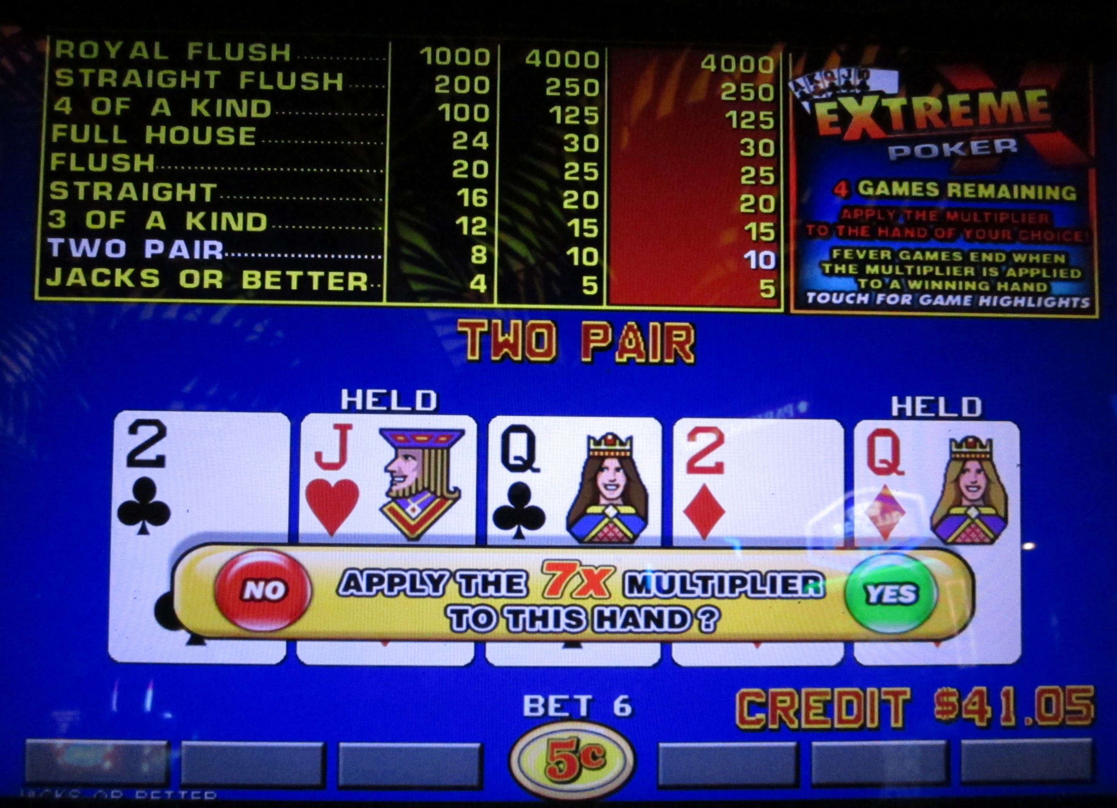我的第二場和第三場「狂熱遊戲」都輸了,所以我很擔心自己會浪費這個功能,因為沒有再贏一次來套用乘數。然後,在上面的第四手牌中出現了一對大對子。只剩一手牌了,我選擇穩妥行事,接受了乘數,將贏利從5加到了35。這下這個功能就結束了。